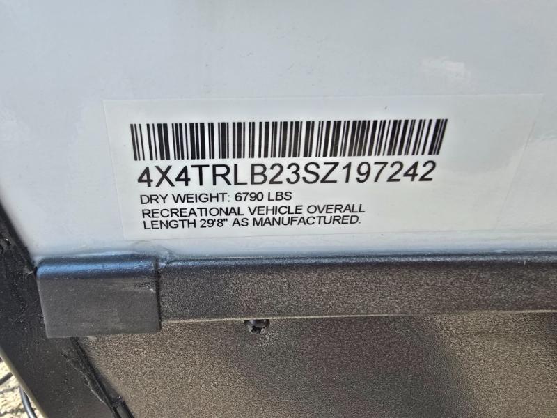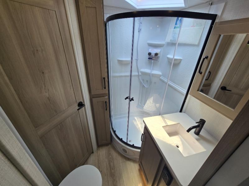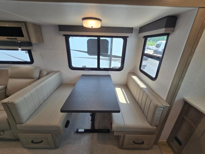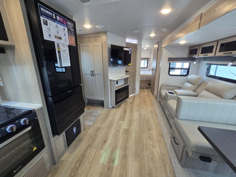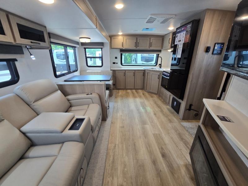 When you are outside this trailer you can enjoy the protection from the 21' power awning, and whip up a meal using the outside griddle. You will find exterior storage for your extra gear, and a ladder at the rear. You get to choose which entrance to step up into, be it the spacious rear bedroom with a queen bed slide and a wardrobe, or the main entry into the kitchen and living area. The furniture slide includes a booth dinette to eat your meals at, and theater seating to watch the Smart TV with a fireplace below. And the cook will love the front kitchen with extra counter space, a three burner range, plus a 12V refrigerator and pantry for food storage!