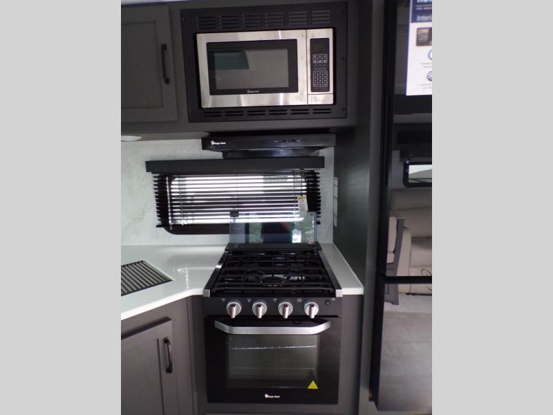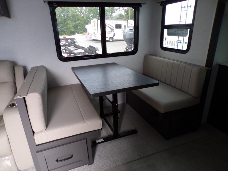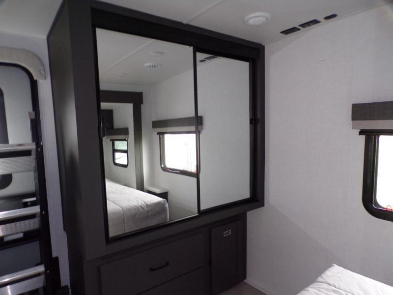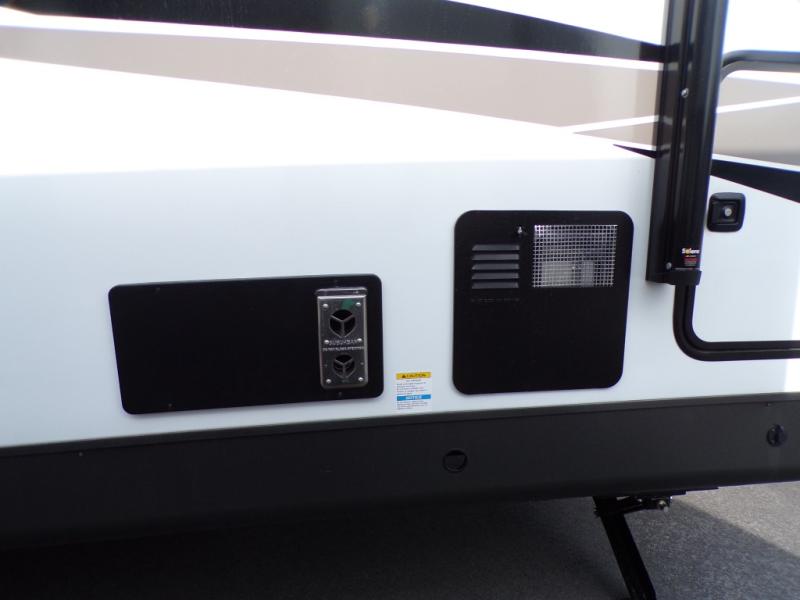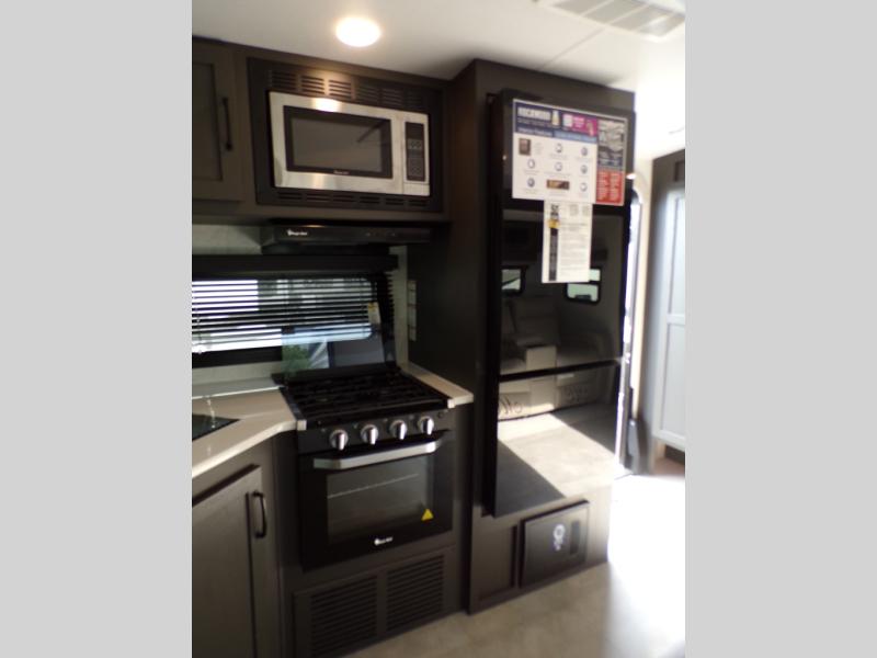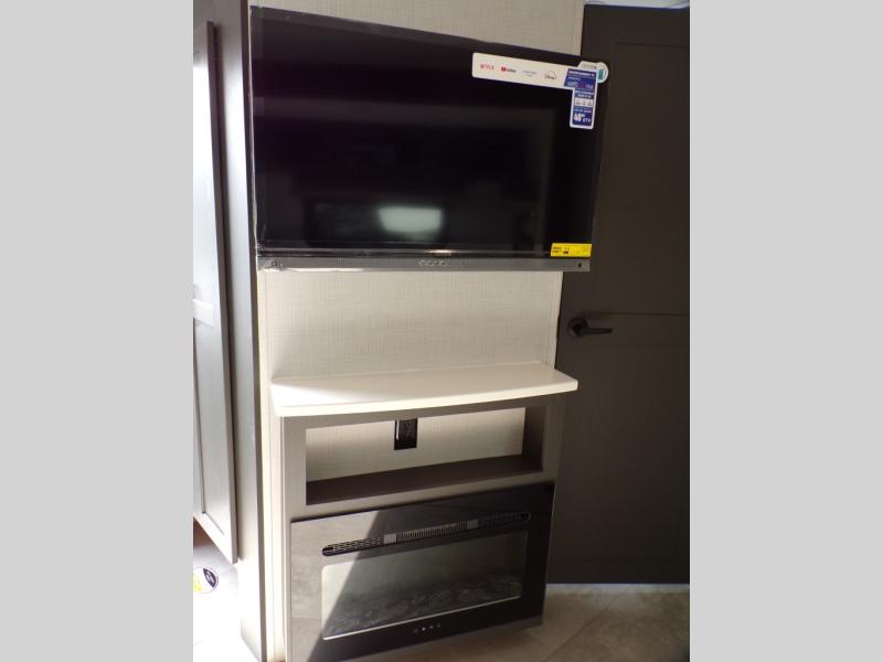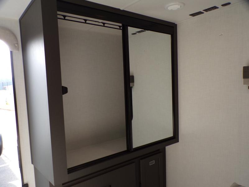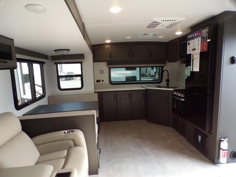 When you are outside this trailer you can enjoy the protection from the 21' power awning, and whip up a meal using the outside griddle. You will find exterior storage for your extra gear, and a ladder at the rear. You get to choose which entrance to step up into, be it the spacious rear bedroom with a queen bed slide and a wardrobe, or the main entry into the kitchen and living area. The furniture slide includes a booth dinette to eat your meals at, and theater seating to watch the Smart TV with a fireplace below. And the cook will love the front kitchen with extra counter space, a three burner range, plus a 12V refrigerator and pantry for food storage!