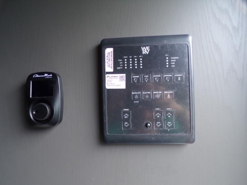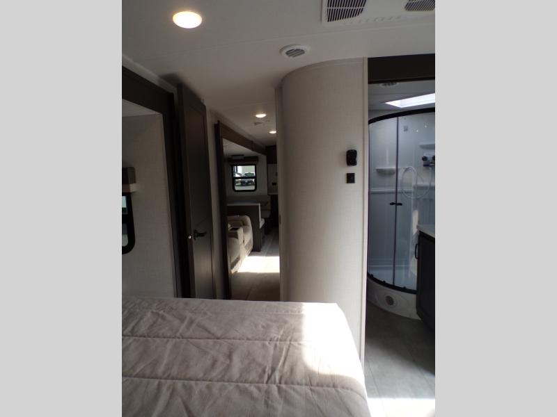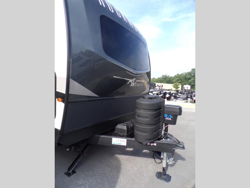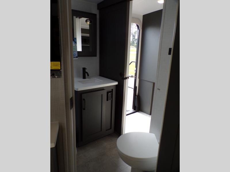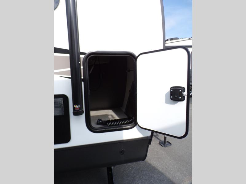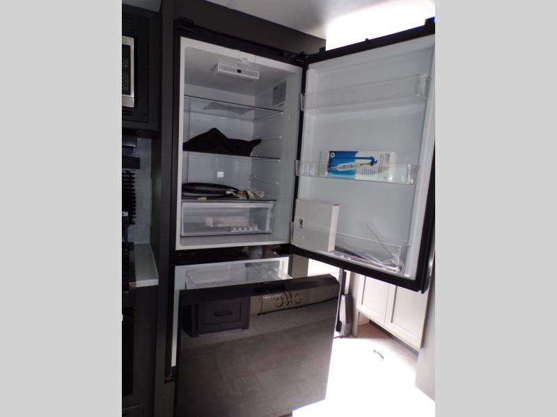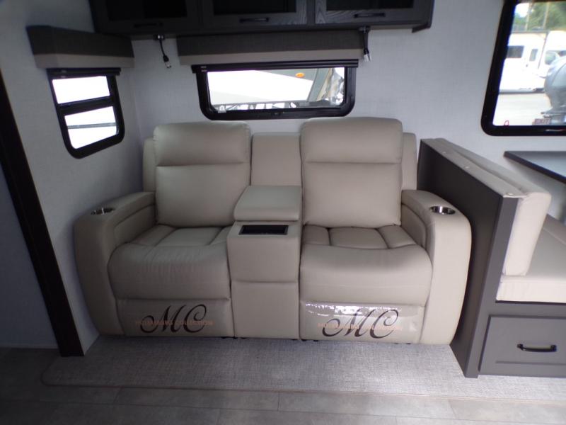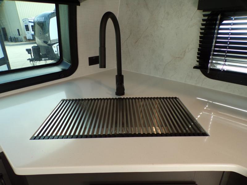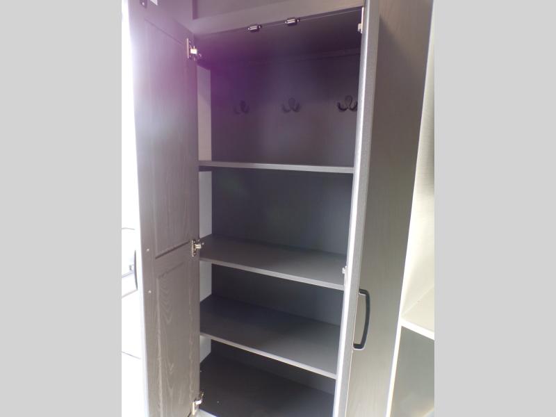 When you are outside this trailer you can enjoy the protection from the 21' power awning, and whip up a meal using the outside griddle. You will find exterior storage for your extra gear, and a ladder at the rear. You get to choose which entrance to step up into, be it the spacious rear bedroom with a queen bed slide and a wardrobe, or the main entry into the kitchen and living area. The furniture slide includes a booth dinette to eat your meals at, and theater seating to watch the Smart TV with a fireplace below. And the cook will love the front kitchen with extra counter space, a three burner range, plus a 12V refrigerator and pantry for food storage!