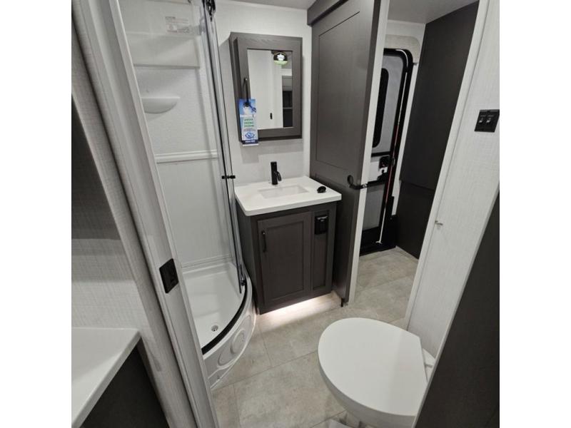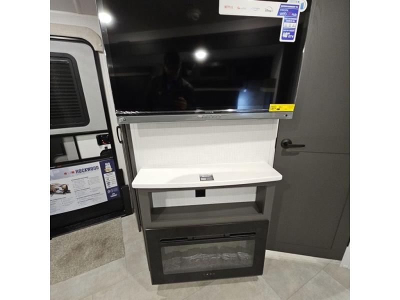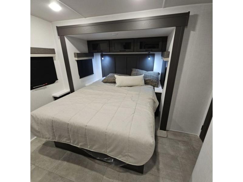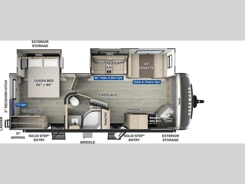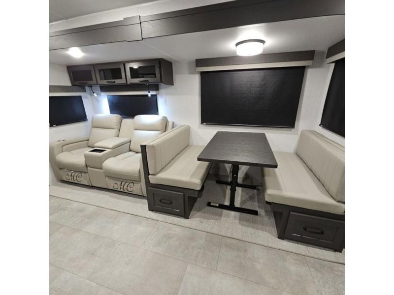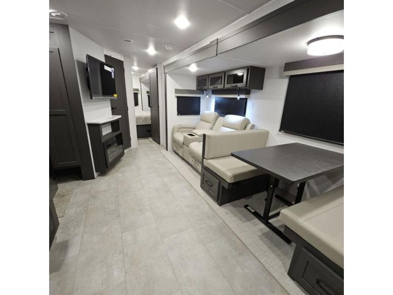 When you are outside this trailer you can enjoy the protection from the 21' power awning, and whip up a meal using the outside griddle. You will find exterior storage for your extra gear, and a ladder at the rear. You get to choose which entrance to step up into, be it the spacious rear bedroom with a queen bed slide and a wardrobe, or the main entry into the kitchen and living area. The furniture slide includes a booth dinette to eat your meals at, and theater seating to watch the Smart TV with a fireplace below. And the cook will love the front kitchen with extra counter space, a three burner range, plus a 12V refrigerator and pantry for food storage!