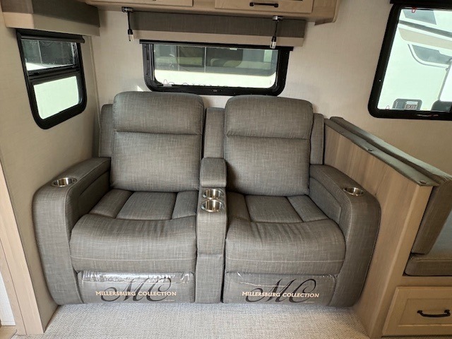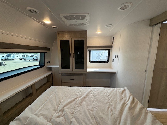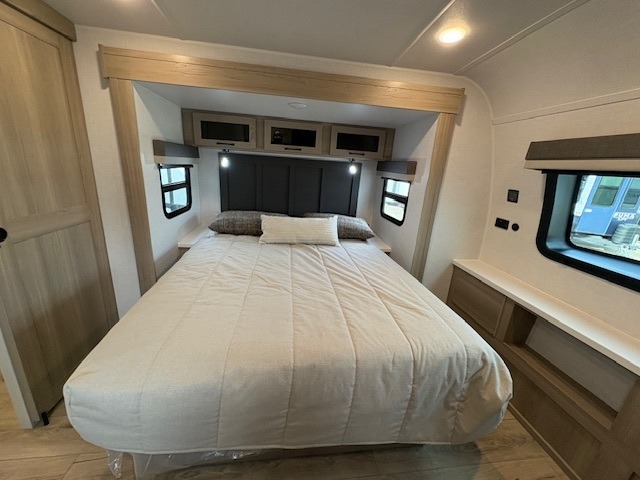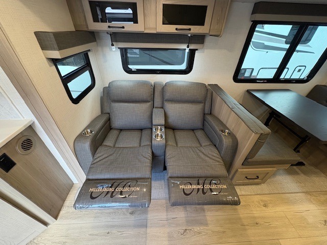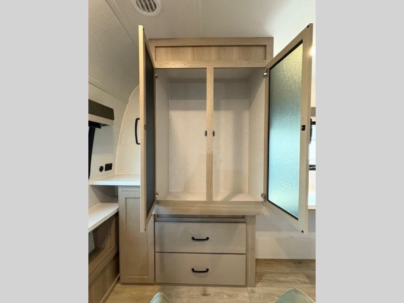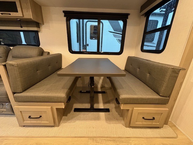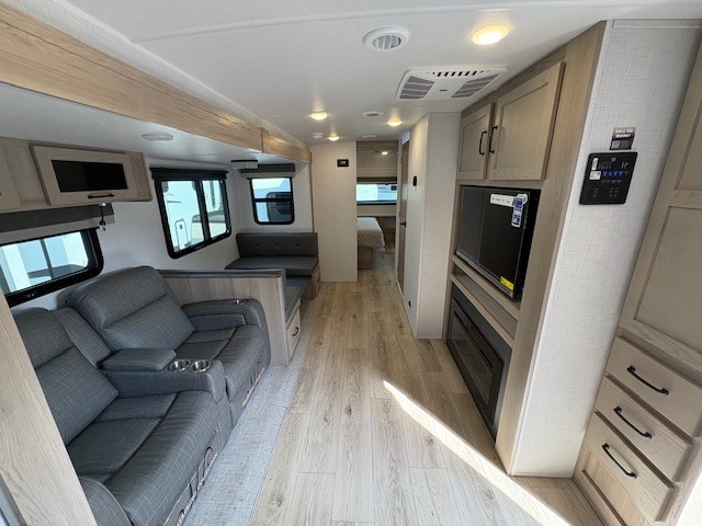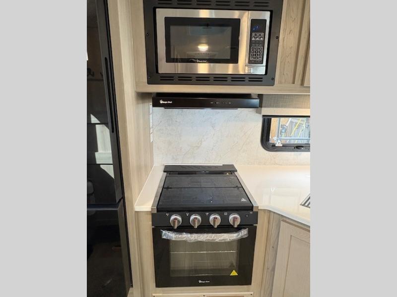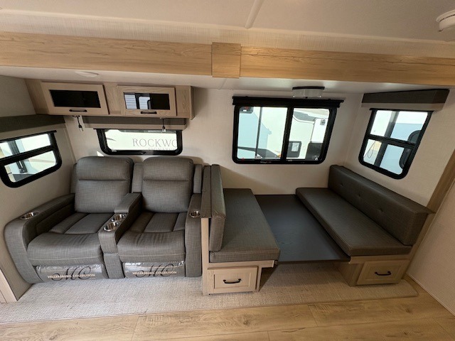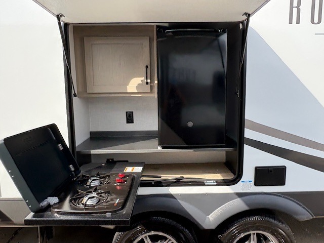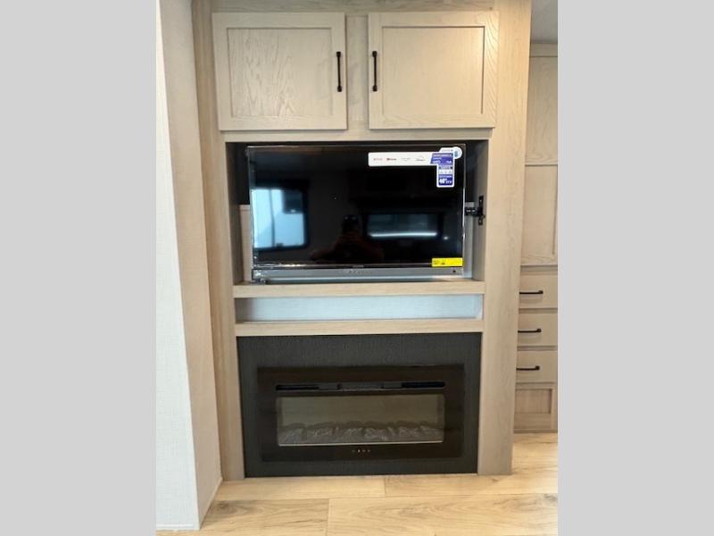 When you are outside this trailer you can enjoy the protection from the 21' power awning, and whip up a meal using the outside griddle. You will find exterior storage for your extra gear, and a ladder at the rear. You get to choose which entrance to step up into, be it the spacious rear bedroom with a queen bed slide and a wardrobe, or the main entry into the kitchen and living area. The furniture slide includes a booth dinette to eat your meals at, and theater seating to watch the Smart TV with a fireplace below. And the cook will love the front kitchen with extra counter space, a three burner range, plus a 12V refrigerator and pantry for food storage!