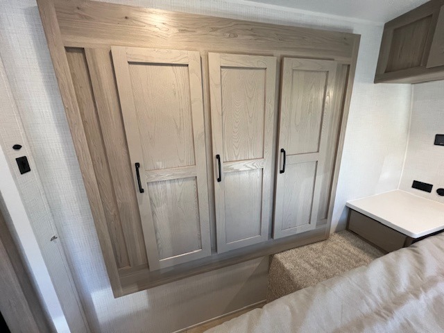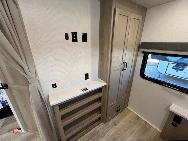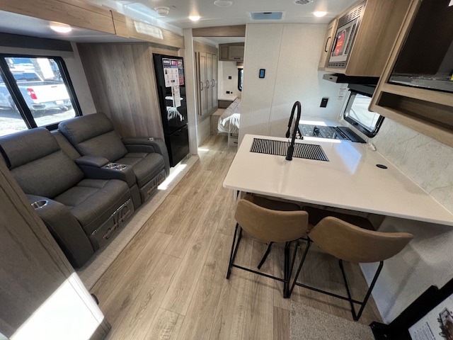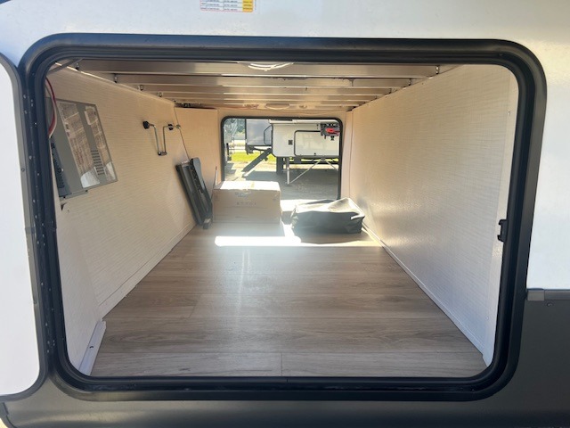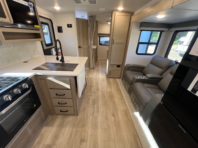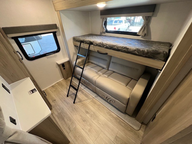 This is the perfect travel trailer to camp with friends and family since it has a private bunkhouse in the back with a flip-up bunk and a 68" sofa. The full bath is close by, as well as the main entry door for convenience. You'll find the second entry door leading into the front private bedroom that includes a queen-size bed, a wardrobe slide out, and an optional TV if you enjoy movies in bed. The U-shaped kitchen includes everything you need to prepare meals each day, and there is even an exterior griddle if you like to cook outside. In the evening, your crew can get comfortable on the theater seat or choose the optional hide-a-bed sofa if you're needing more sleeping space!