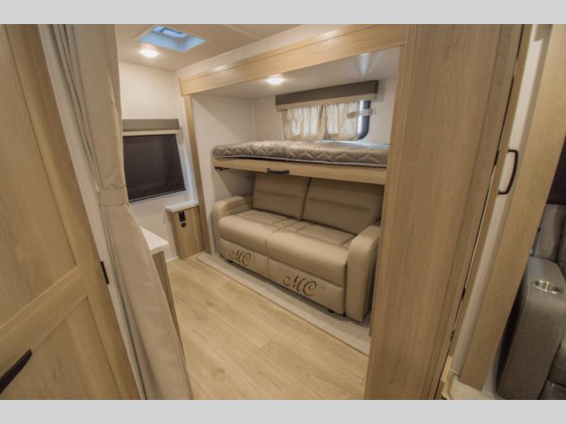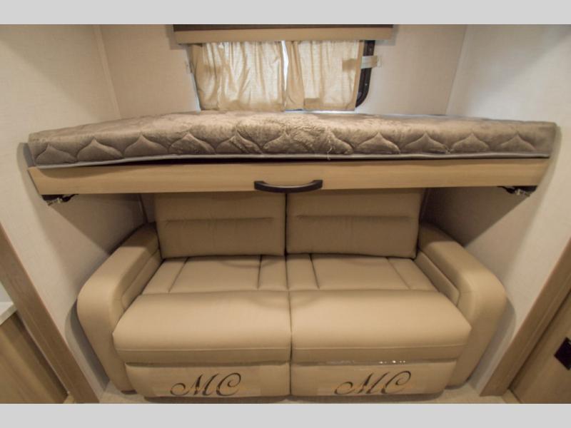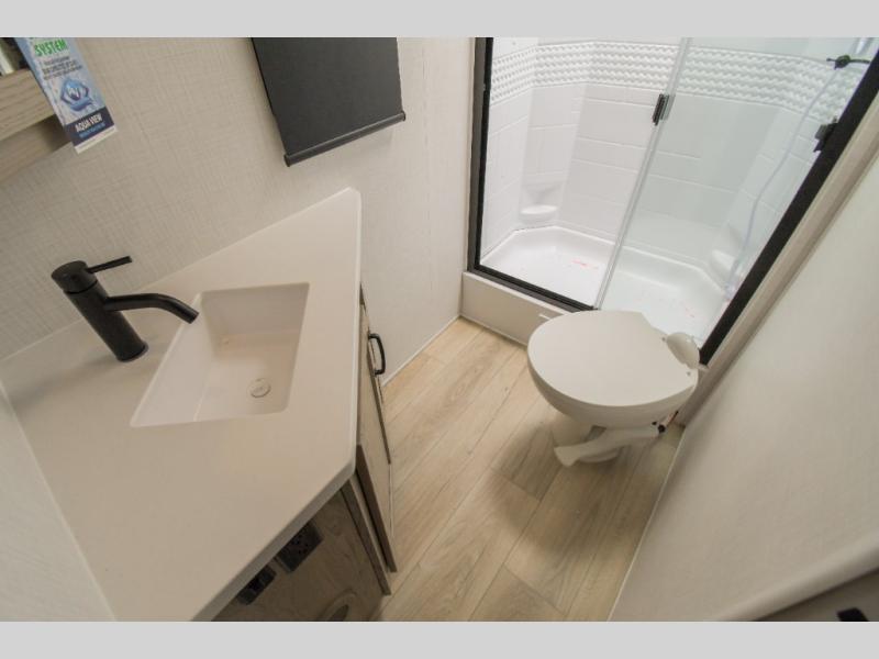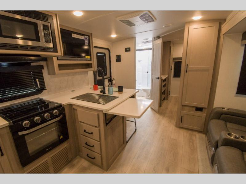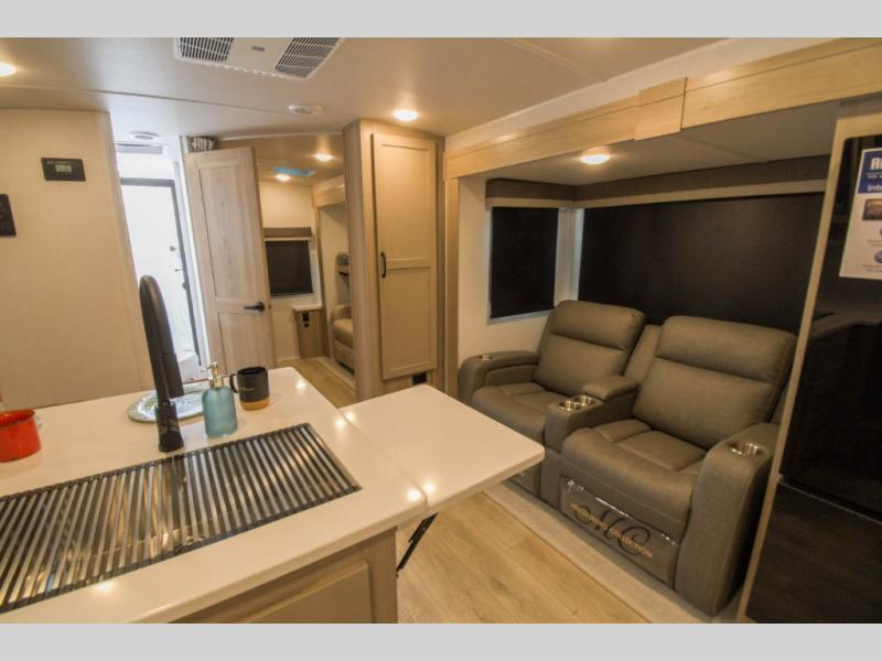 This is the perfect travel trailer to camp with friends and family since it has a private bunkhouse in the back with a flip-up bunk and a 68" sofa. The full bath is close by, as well as the main entry door for convenience. You'll find the second entry door leading into the front private bedroom that includes a queen-size bed, a wardrobe slide out, and an optional TV if you enjoy movies in bed. The U-shaped kitchen includes everything you need to prepare meals each day, and there is even an exterior griddle if you like to cook outside. In the evening, your crew can get comfortable on the theater seat or choose the optional hide-a-bed sofa if you're needing more sleeping space!