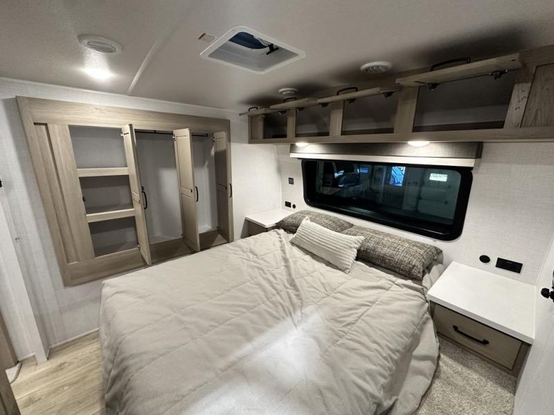 This is the perfect travel trailer to camp with friends and family since it has a private bunkhouse in the back with a flip-up bunk and a 68" sofa. The full bath is close by, as well as the main entry door for convenience. You'll find the second entry door leading into the front private bedroom that includes a queen-size bed, a wardrobe slide out, and an optional TV if you enjoy movies in bed. The U-shaped kitchen includes everything you need to prepare meals each day, and there is even an exterior griddle if you like to cook outside. In the evening, your crew can get comfortable on the theater seat or choose the optional hide-a-bed sofa if you're needing more sleeping space!