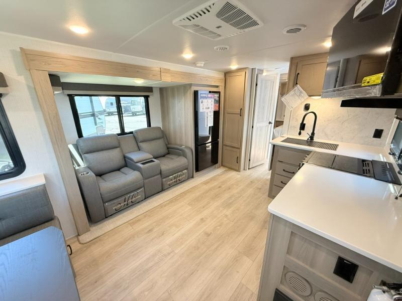 This double slide out travel trailer is perfect for weekend trips or extended stays! Your crew can play a game around the U-shaped dinette, relax on the theater seat across from the TV, or visit outdoors under the 21' awning. The fully-equipped kitchen allows you to make meals each day, and the walk-thru bath is easily accessible for everyone to use. This model also includes a front master bedroom with a queen bed, a wardrobe slide out, and one of the dual entry doors for convenience!