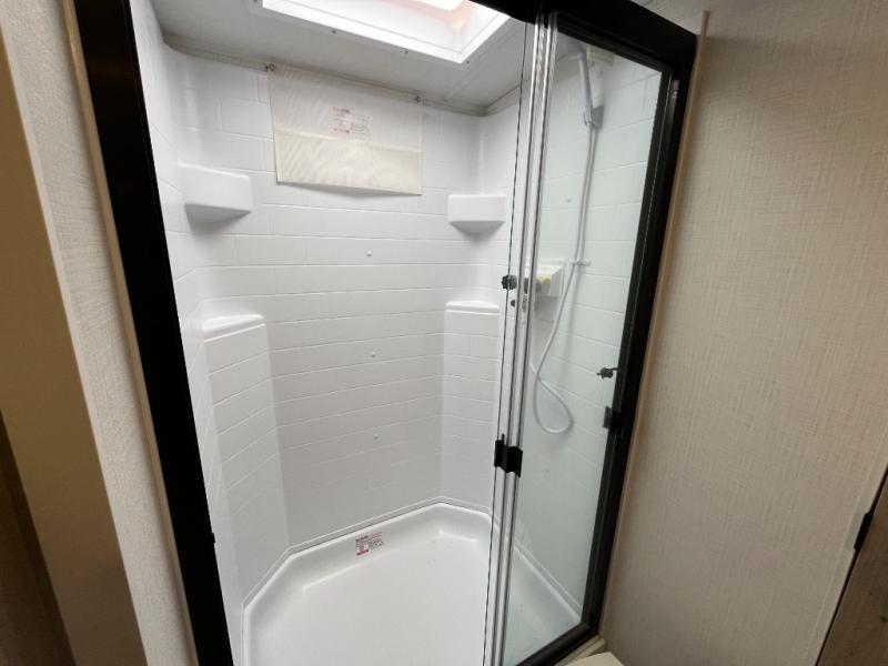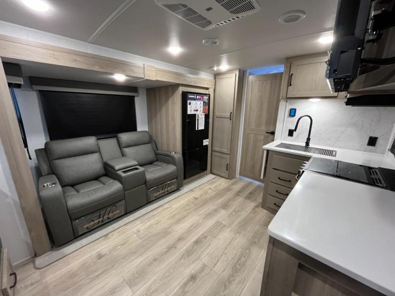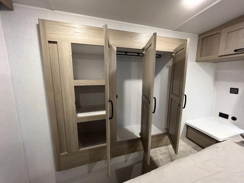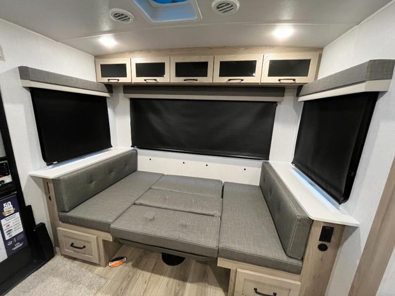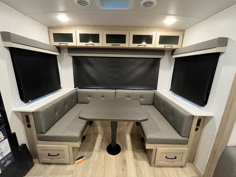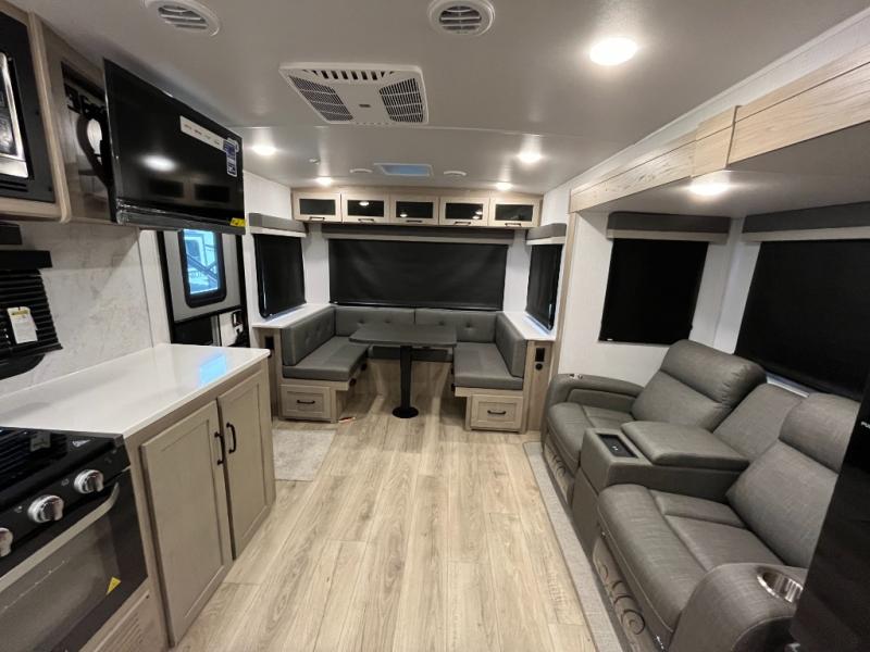 This double slide out travel trailer is perfect for weekend trips or extended stays! Your crew can play a game around the U-shaped dinette, relax on the theater seat across from the TV, or visit outdoors under the 21' awning. The fully-equipped kitchen allows you to make meals each day, and the walk-thru bath is easily accessible for everyone to use. This model also includes a front master bedroom with a queen bed, a wardrobe slide out, and one of the dual entry doors for convenience!
