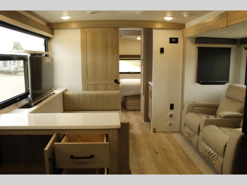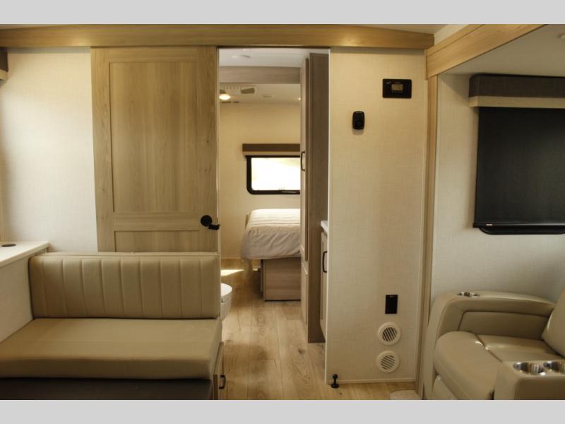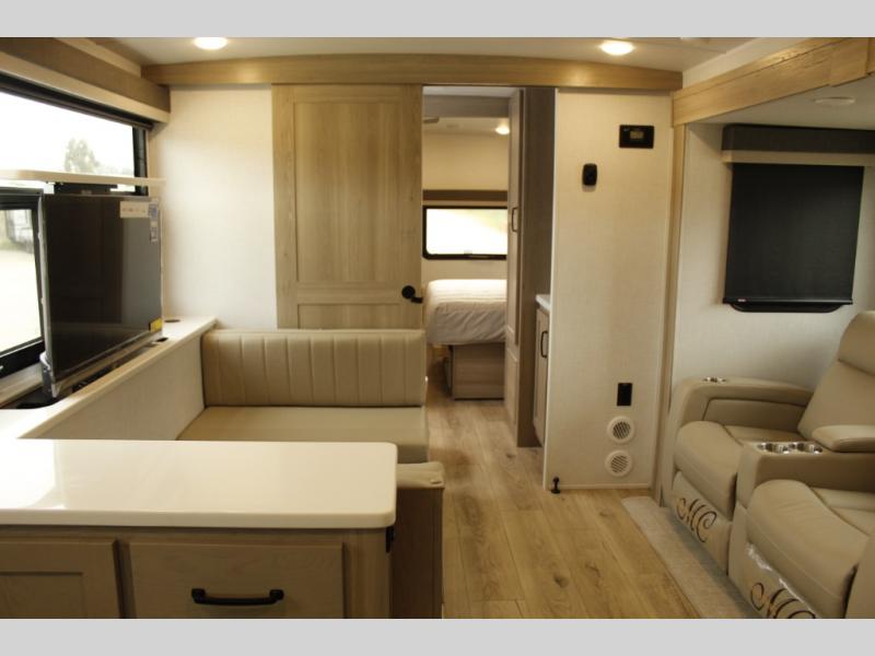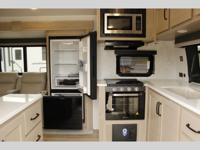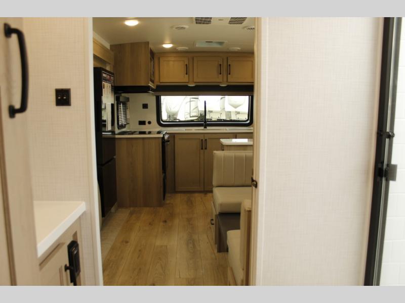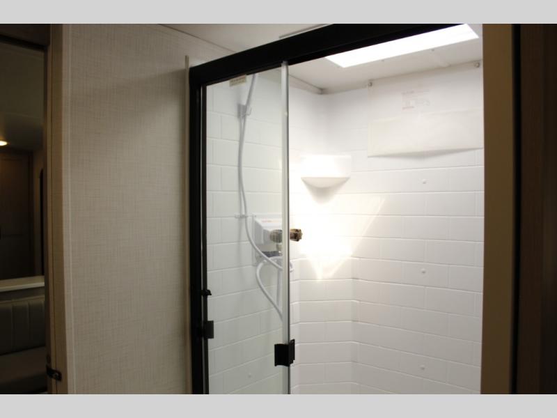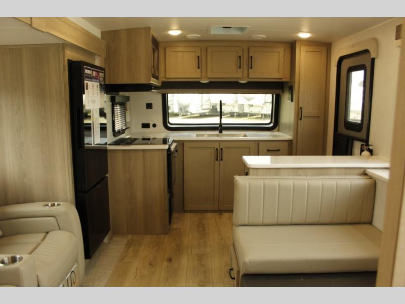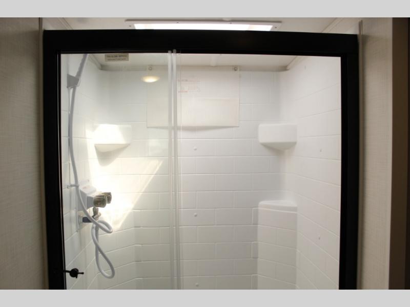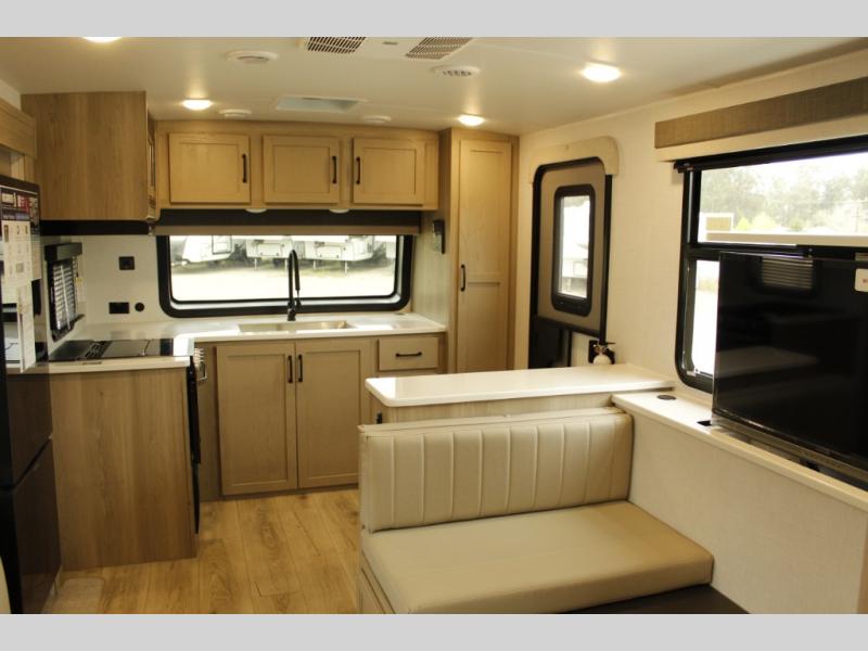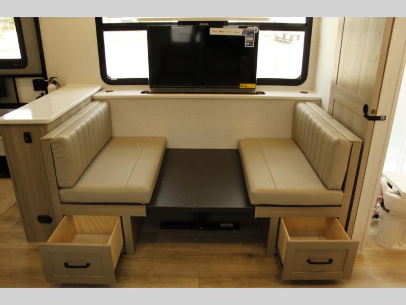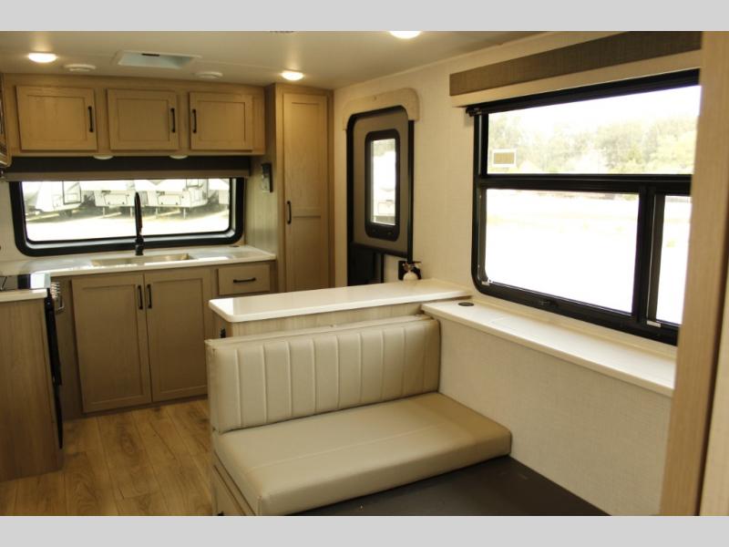 Wherever you decide to camp, you can be sure to enjoy your time in this double slide out trailer! The chef of your group will love having a front kitchen with generous counter space plus an exterior griddle when the weather is nice. There is also a 21' awning outdoors, along with Solid Entry Steps, and dual entry doors! A 39" booth dinette provides a place to dine or play a card game after dinner, and the theater seat across from the 40" TV is perfect for movie night. The walk-thru bath leads to the rear master bedroom where you'll find a queen bed, a large wardrobe, and a TV option if you enjoy shows in bed!