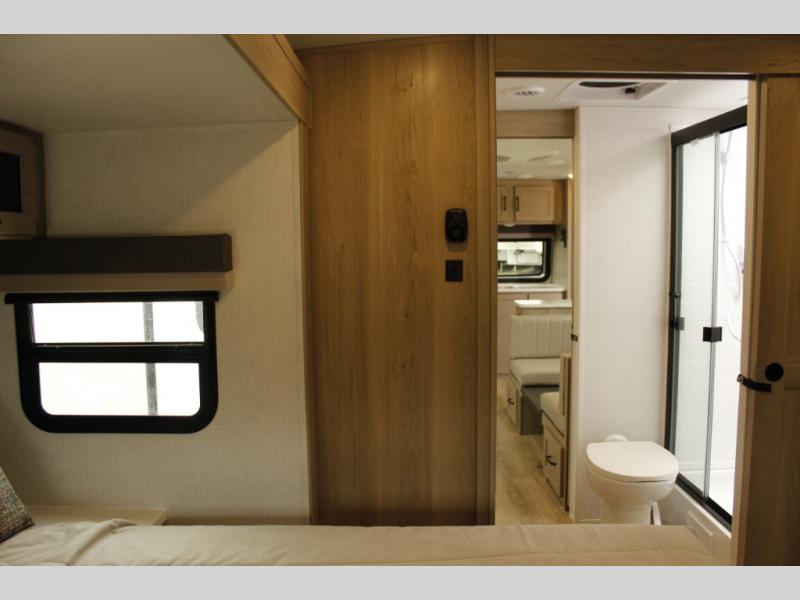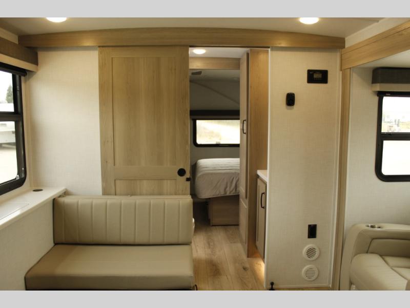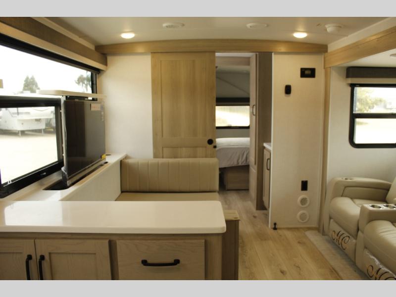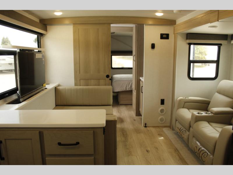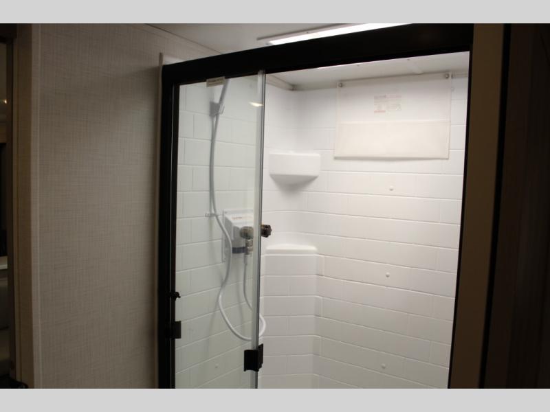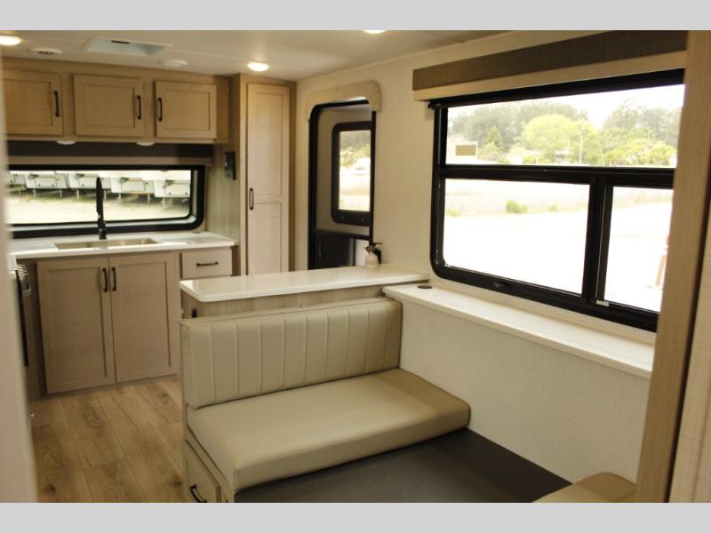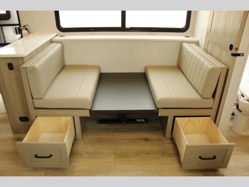 Wherever you decide to camp, you can be sure to enjoy your time in this double slide out trailer! The chef of your group will love having a front kitchen with generous counter space plus an exterior griddle when the weather is nice. There is also a 21' awning outdoors, along with Solid Entry Steps, and dual entry doors! A 39" booth dinette provides a place to dine or play a card game after dinner, and the theater seat across from the 40" TV is perfect for movie night. The walk-thru bath leads to the rear master bedroom where you'll find a queen bed, a large wardrobe, and a TV option if you enjoy shows in bed!