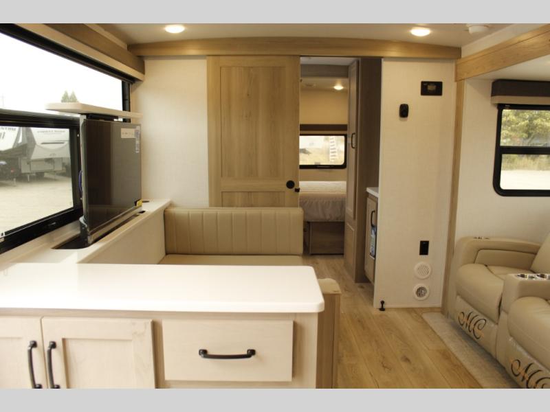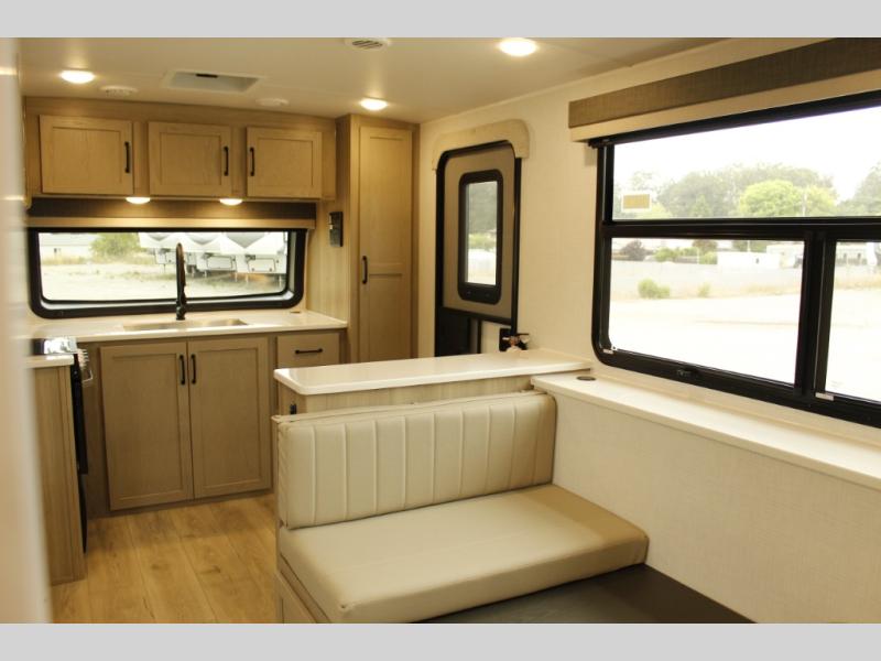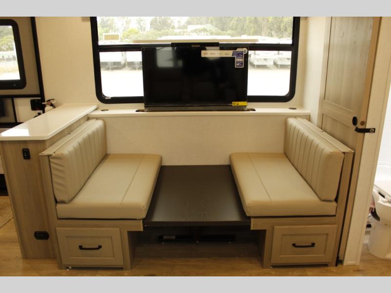 Wherever you decide to camp, you can be sure to enjoy your time in this double slide out trailer! The chef of your group will love having a front kitchen with generous counter space plus an exterior griddle when the weather is nice. There is also a 21' awning outdoors, along with Solid Entry Steps, and dual entry doors! A 39" booth dinette provides a place to dine or play a card game after dinner, and the theater seat across from the 40" TV is perfect for movie night. The walk-thru bath leads to the rear master bedroom where you'll find a queen bed, a large wardrobe, and a TV option if you enjoy shows in bed!