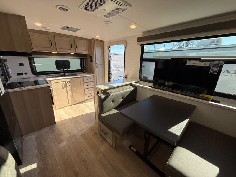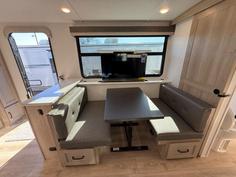 Wherever you decide to camp, you can be sure to enjoy your time in this double slide out trailer! The chef of your group will love having a front kitchen with generous counter space plus an exterior griddle when the weather is nice. There is also a 21' awning outdoors, along with Solid Entry Steps, and dual entry doors! A 39" booth dinette provides a place to dine or play a card game after dinner, and the theater seat across from the 40" TV is perfect for movie night. The walk-thru bath leads to the rear master bedroom where you'll find a queen bed, a large wardrobe, and a TV option if you enjoy shows in bed!
