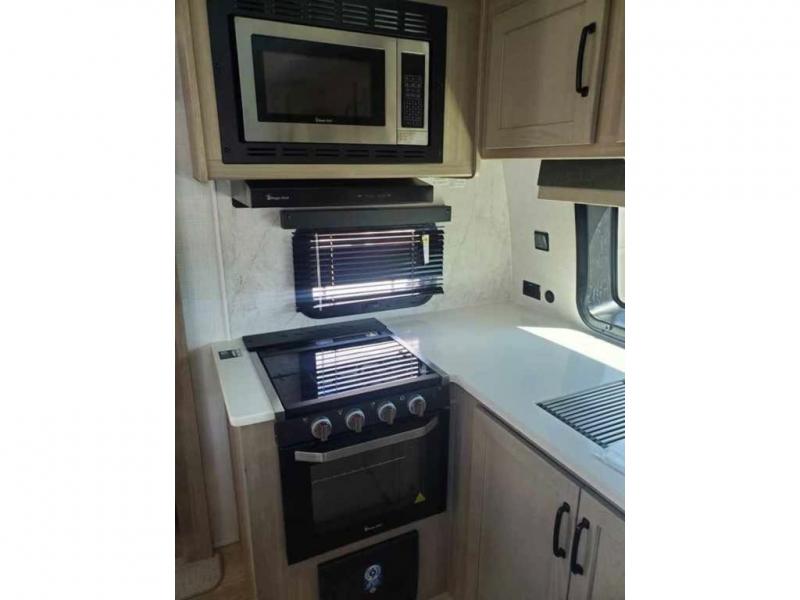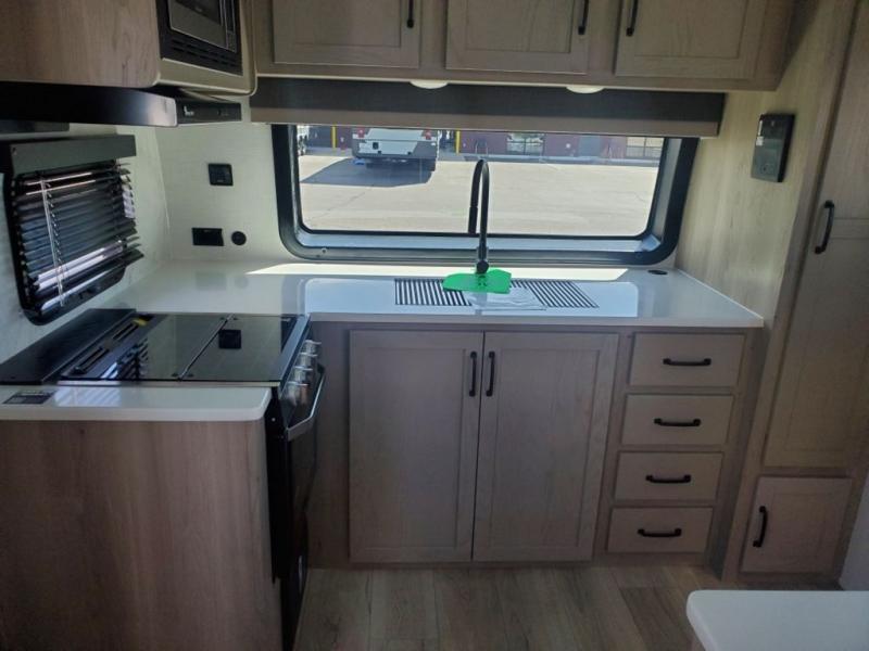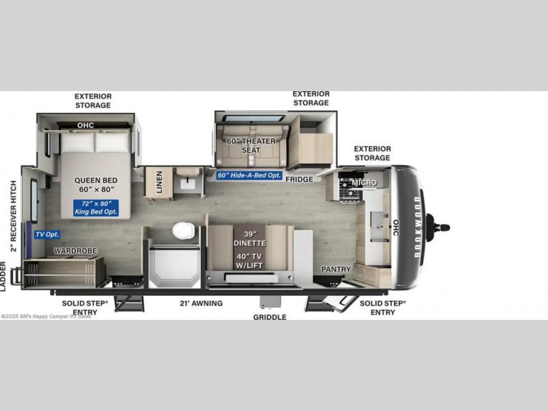 Wherever you decide to camp, you can be sure to enjoy your time in this double slide out trailer! The chef of your group will love having a front kitchen with generous counter space plus an exterior griddle when the weather is nice. There is also a 21' awning outdoors, along with Solid Entry Steps, and dual entry doors! A 39" booth dinette provides a place to dine or play a card game after dinner, and the theater seat across from the 40" TV is perfect for movie night. The walk-thru bath leads to the rear master bedroom where you'll find a queen bed, a large wardrobe, and a TV option if you enjoy shows in bed!