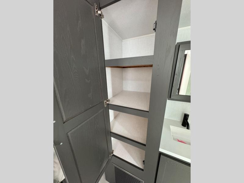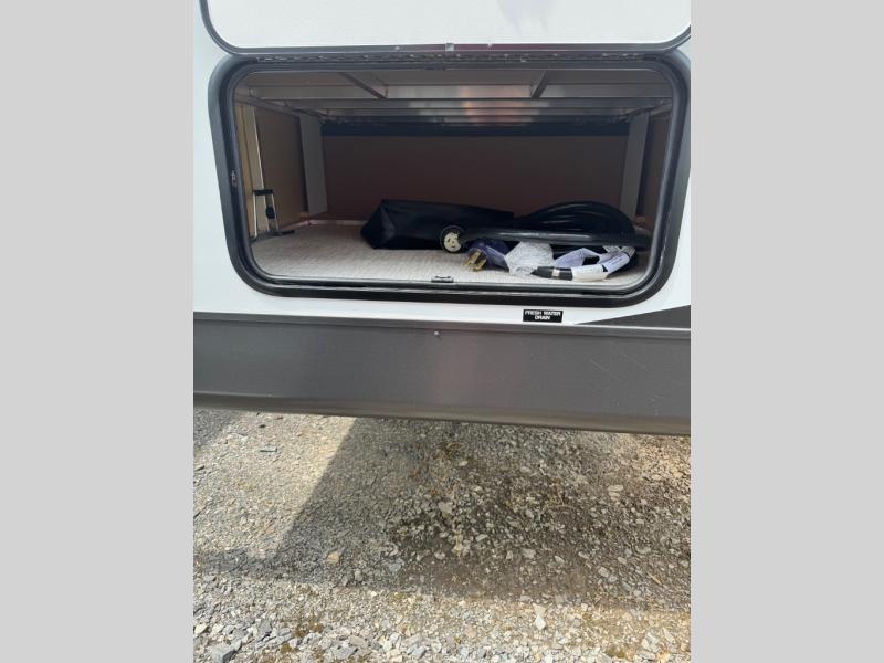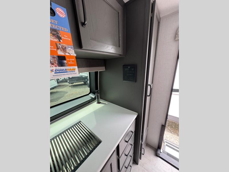 Wherever you decide to camp, you can be sure to enjoy your time in this double slide out trailer! The chef of your group will love having a front kitchen with generous counter space plus an exterior griddle when the weather is nice. There is also a 21' awning outdoors, along with Solid Entry Steps, and dual entry doors! A 39" booth dinette provides a place to dine or play a card game after dinner, and the theater seat across from the 40" TV is perfect for movie night. The walk-thru bath leads to the rear master bedroom where you'll find a queen bed, a large wardrobe, and a TV option if you enjoy shows in bed!
