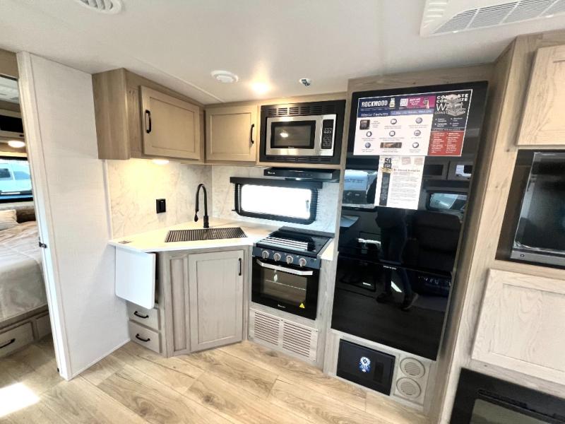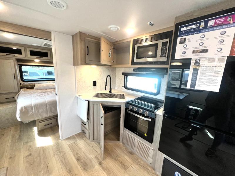 Each Rockwood Ultra Lite travel trailer by Forest River includes superior construction with a high gloss front cap, laminated white fiberglass sidewalls, and tinted frameless windows for a sleek look. The torsion axle, Rubber-Ryde suspension will make towing smooth and hassle-free, along with the nitrogen filled, Goodyear Endurance tires and the tire pressure monitor system. Interior comforts include designer kitchen backsplash, solid wood cabinet doors with hidden hinges, and night roller shades to name a few. Choose a Rockwood Ultra Lite travel trailer today!