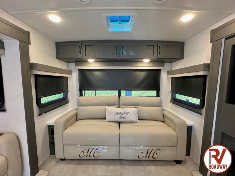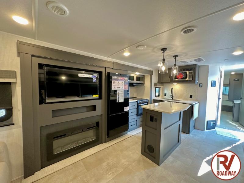 This trailer allows you to seat nine people, and the kitchen island provides a great place for the snacks and beverages. The dual opposing slides give the main living and kitchen area lots of floor space for everyone to move around, and the double entry bath is convenient with access from the hallway and the master suite. The front bedroom offers a queen bed slide, a wardrobe and storage along the front wall, plus you can choose to add an optional TV. And the two 11' power awnings give you an outdoor living area protected from the elements; just add your camping chairs.
