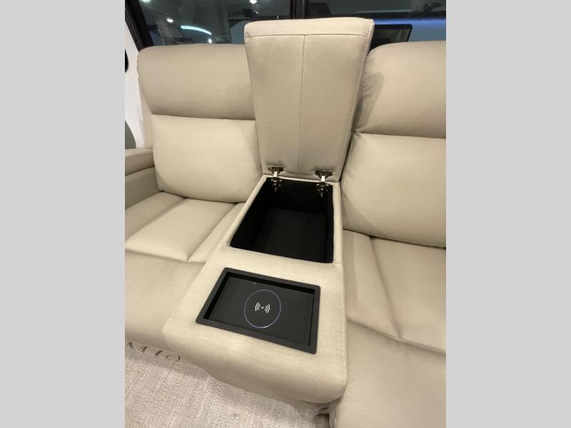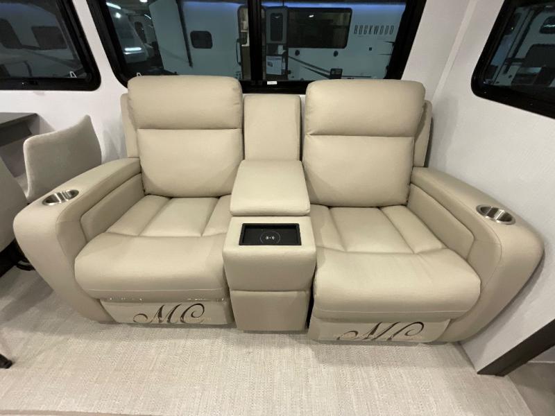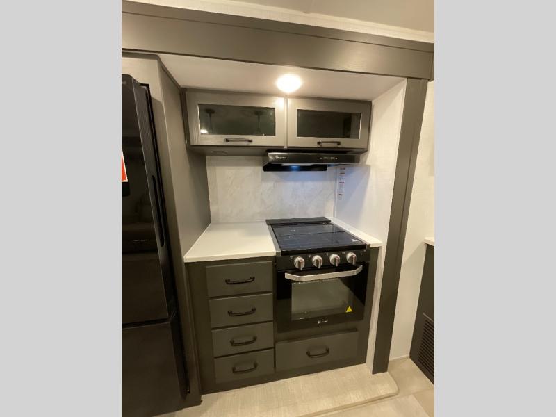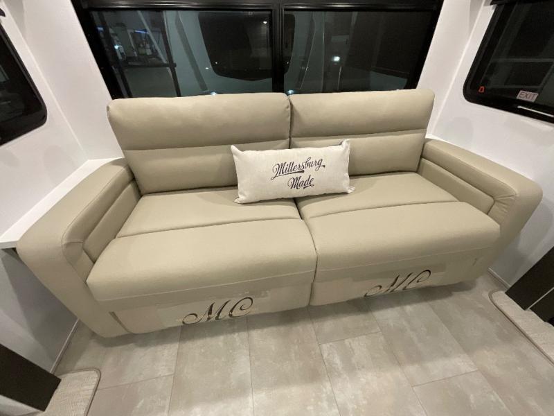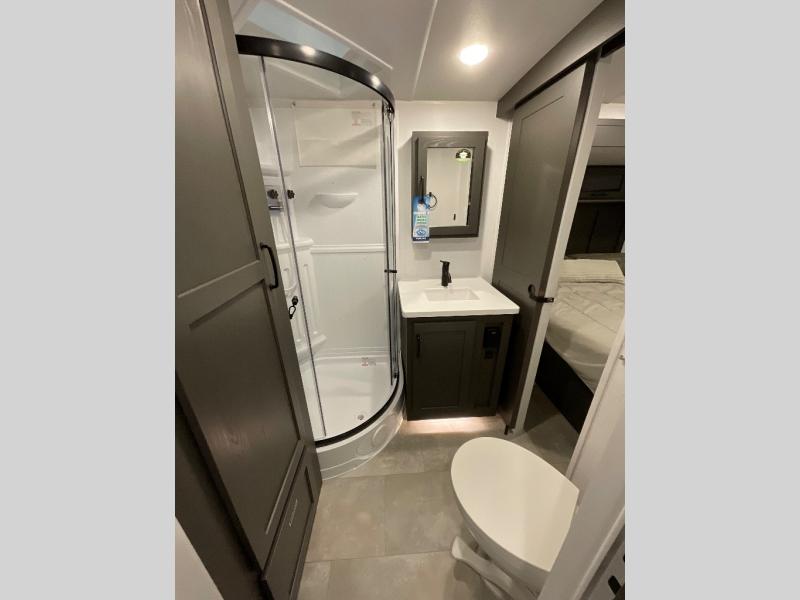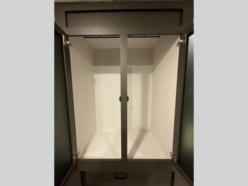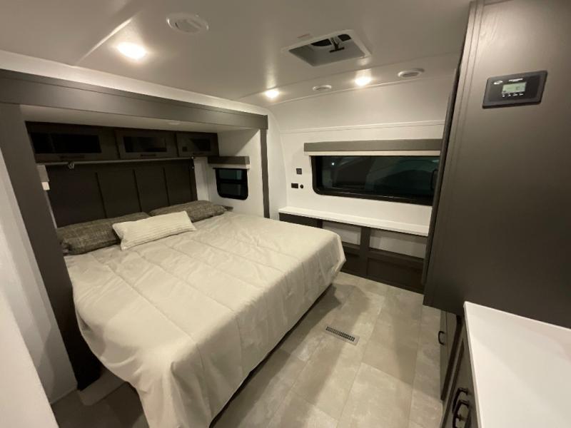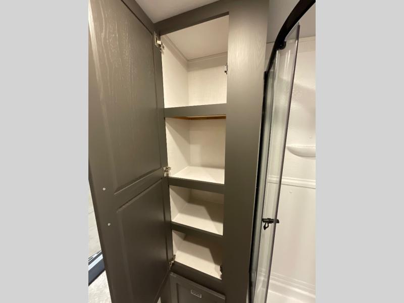 This trailer allows you to seat nine people, and the kitchen island provides a great place for the snacks and beverages. The dual opposing slides give the main living and kitchen area lots of floor space for everyone to move around, and the double entry bath is convenient with access from the hallway and the master suite. The front bedroom offers a queen bed slide, a wardrobe and storage along the front wall, plus you can choose to add an optional TV. And the two 11' power awnings give you an outdoor living area protected from the elements; just add your camping chairs.