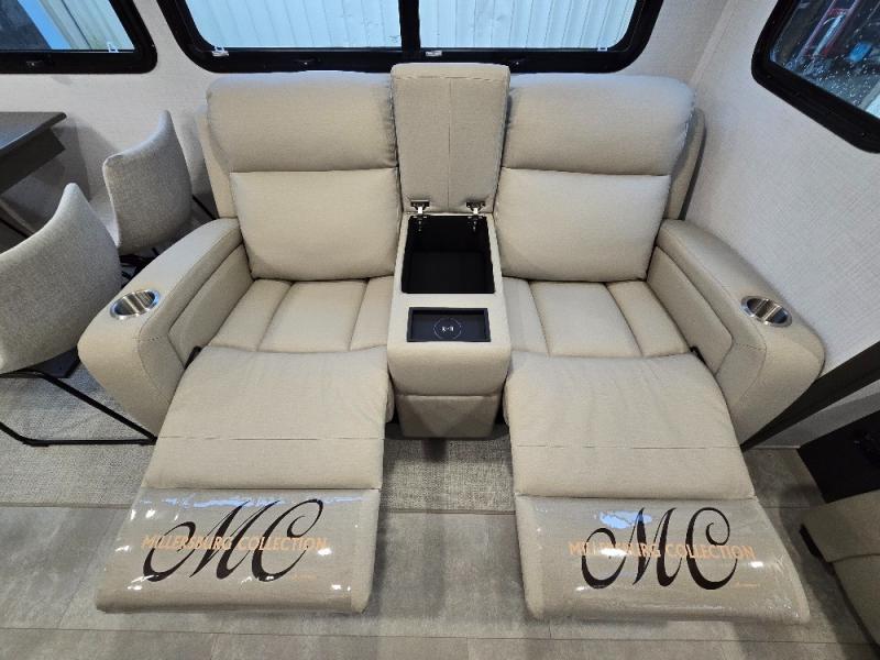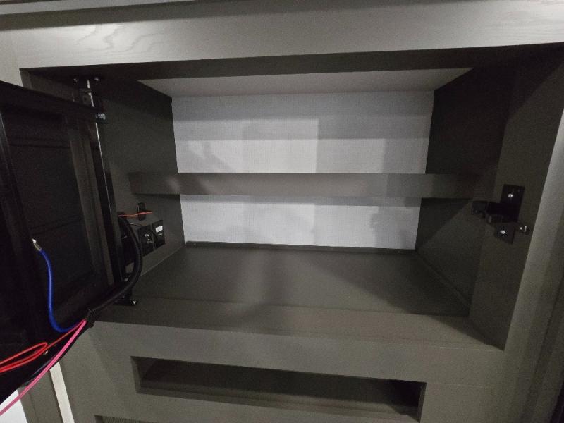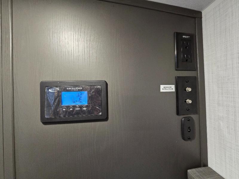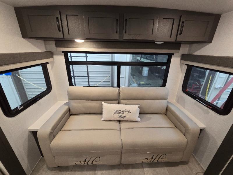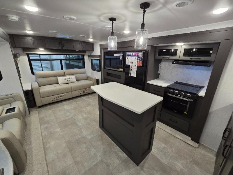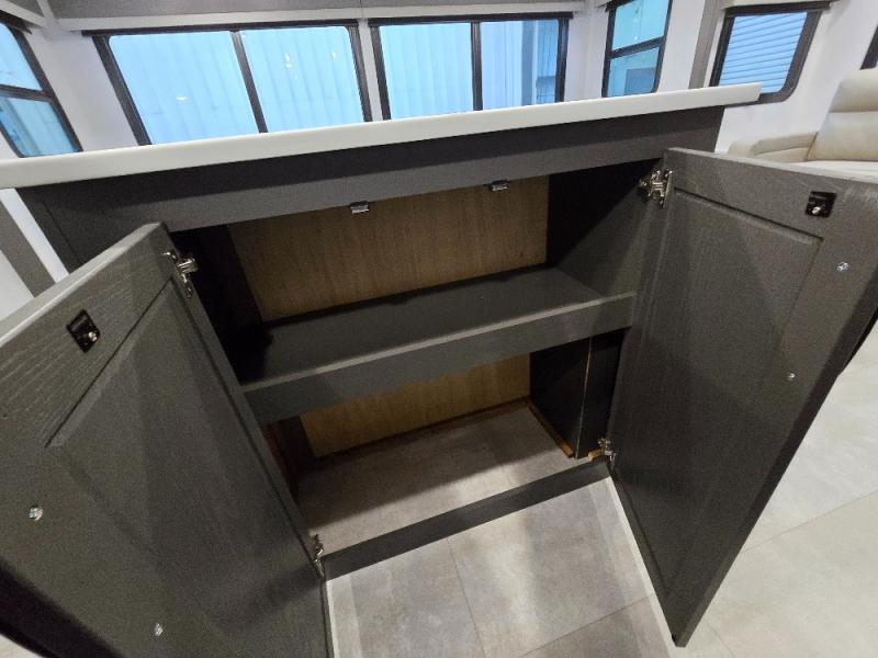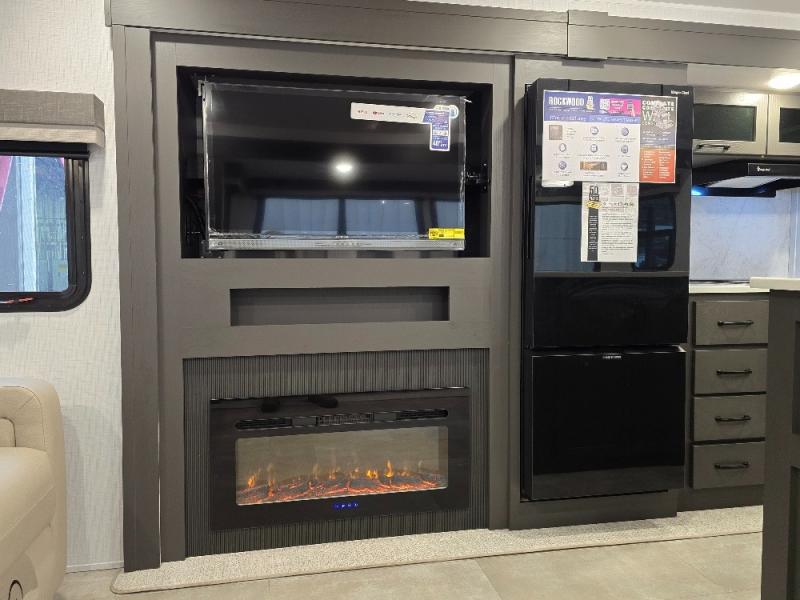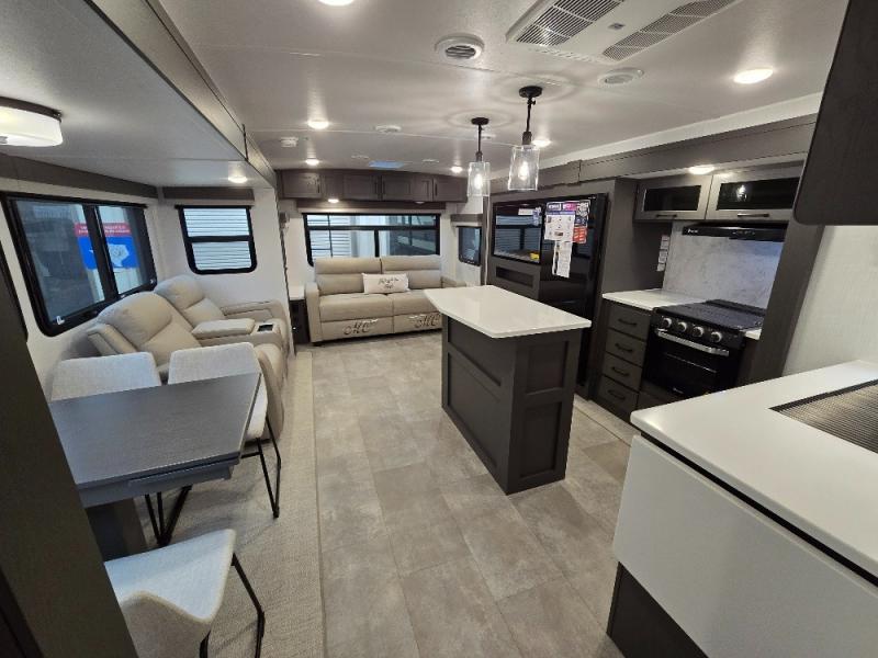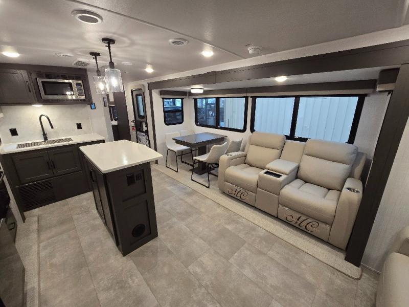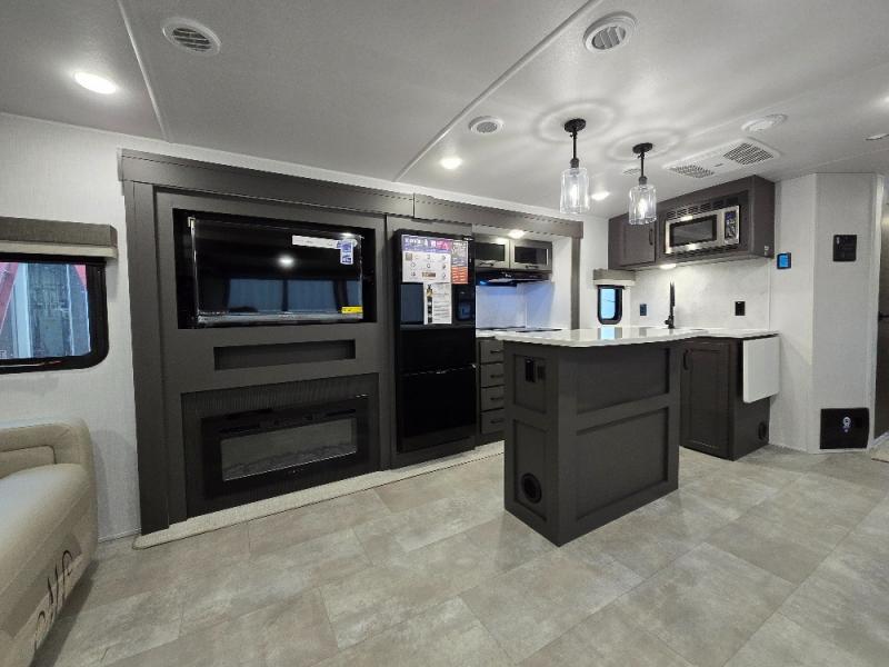 This trailer allows you to seat nine people, and the kitchen island provides a great place for the snacks and beverages. The dual opposing slides give the main living and kitchen area lots of floor space for everyone to move around, and the double entry bath is convenient with access from the hallway and the master suite. The front bedroom offers a queen bed slide, a wardrobe and storage along the front wall, plus you can choose to add an optional TV. And the two 11' power awnings give you an outdoor living area protected from the elements; just add your camping chairs.