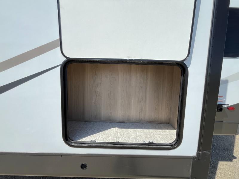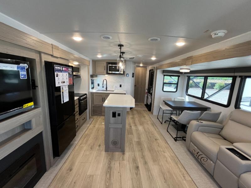 This trailer allows you to seat nine people, and the kitchen island provides a great place for the snacks and beverages. The dual opposing slides give the main living and kitchen area lots of floor space for everyone to move around, and the double entry bath is convenient with access from the hallway and the master suite. The front bedroom offers a queen bed slide, a wardrobe and storage along the front wall, plus you can choose to add an optional TV. And the two 11' power awnings give you an outdoor living area protected from the elements; just add your camping chairs.