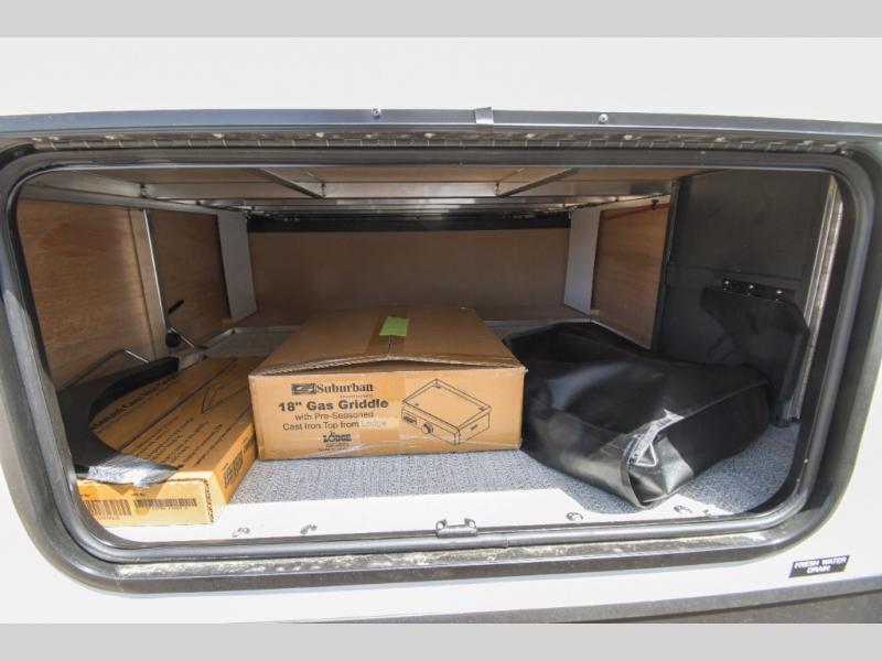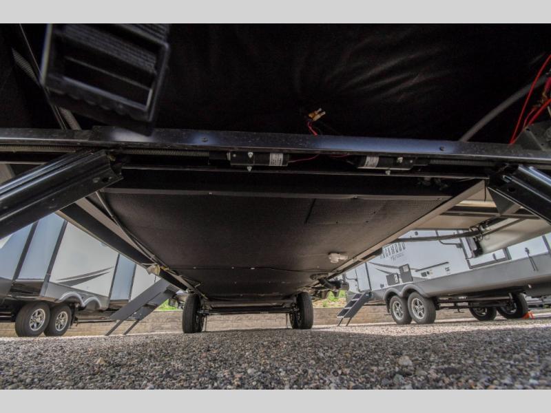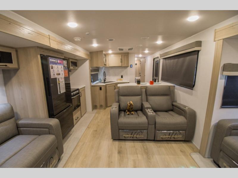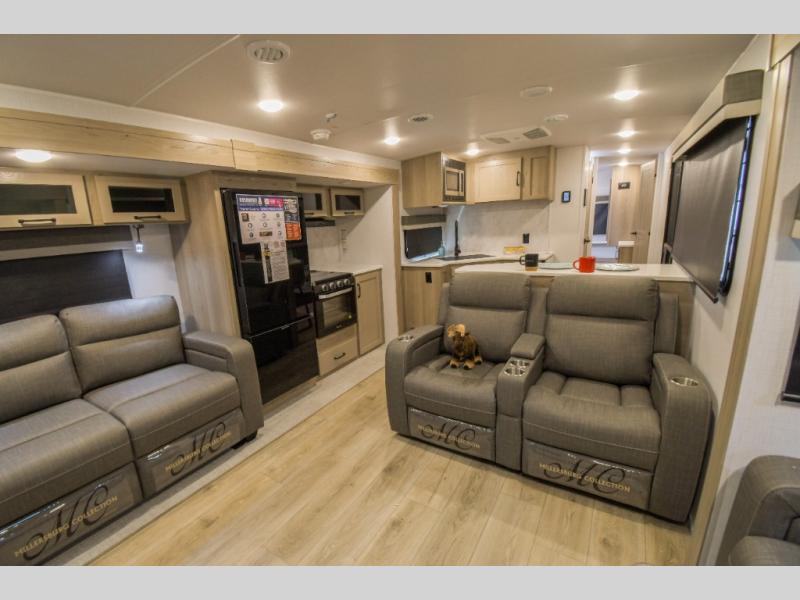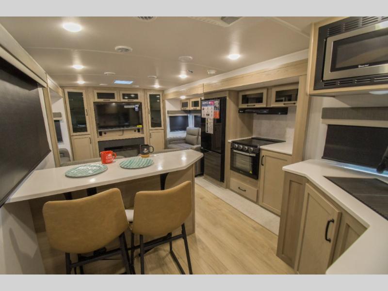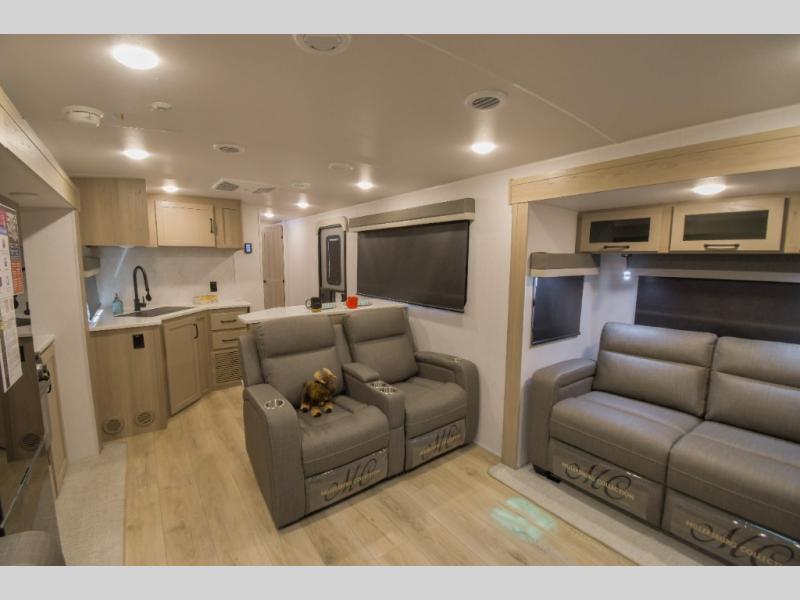 Enjoy trips to the lake in this travel trailer with triple slides! The rear living area includes a rear entertainment center, a 60" theater seat, plus two hide-a-bed sofas, which allows this room to double as your guests' bedroom at night. You'll enjoy the front private bedroom all to yourselves, and the full bath is close by for convenience. The chef of your group will love the full kitchen with a three burner range, a 21" gas oven, and a 12V refrigerator to hold perishables. And don't overlook the exterior with its outside storage, 21' awning, and exterior griddle!