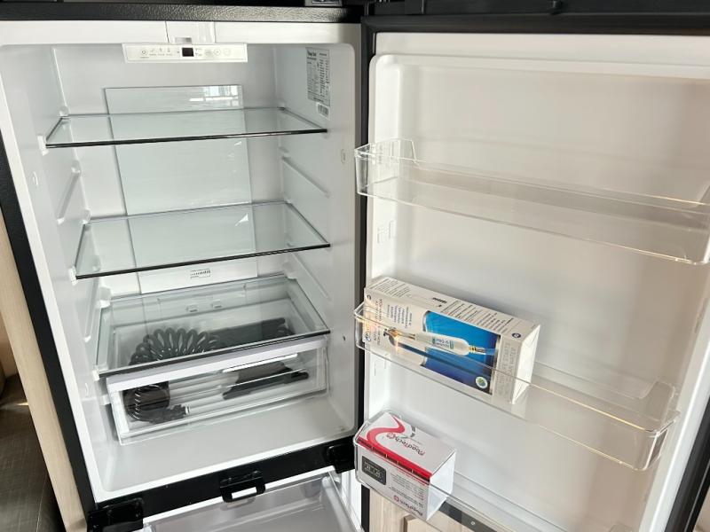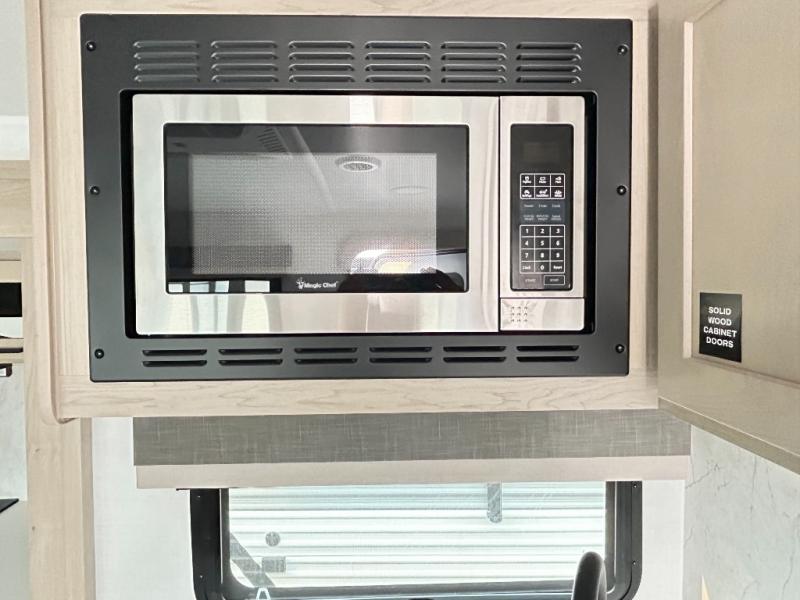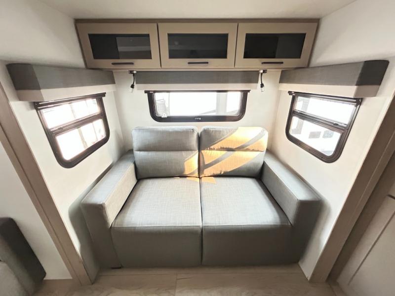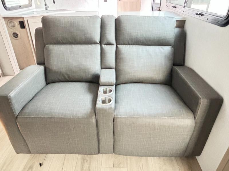 Enjoy trips to the lake in this travel trailer with triple slides! The rear living area includes a rear entertainment center, a 60" theater seat, plus two hide-a-bed sofas, which allows this room to double as your guests' bedroom at night. You'll enjoy the front private bedroom all to yourselves, and the full bath is close by for convenience. The chef of your group will love the full kitchen with a three burner range, a 21" gas oven, and a 12V refrigerator to hold perishables. And don't overlook the exterior with its outside storage, 21' awning, and exterior griddle!