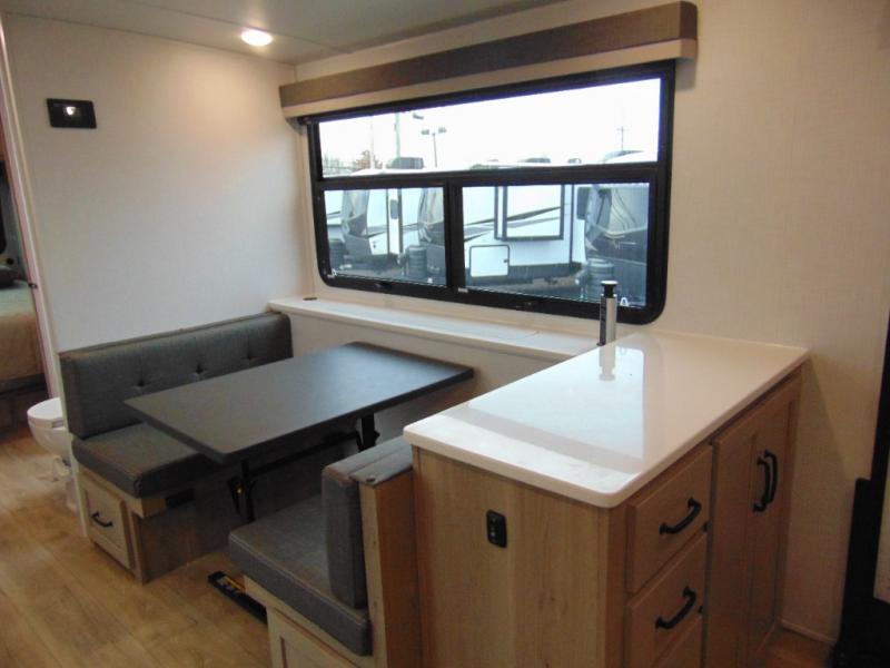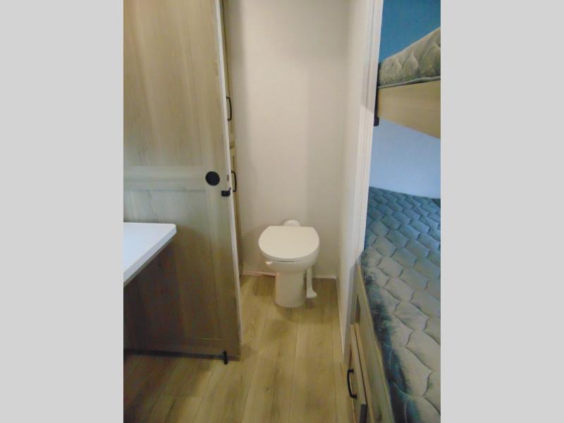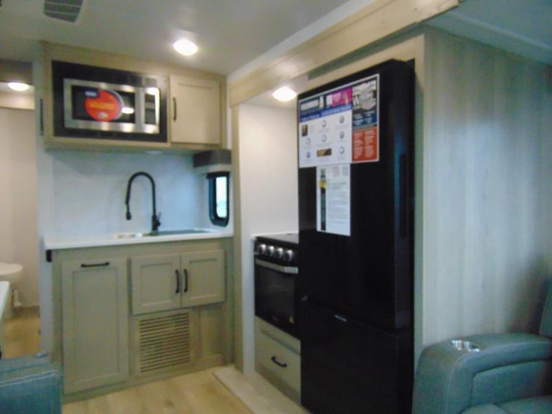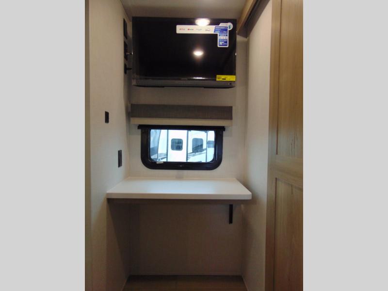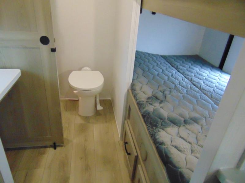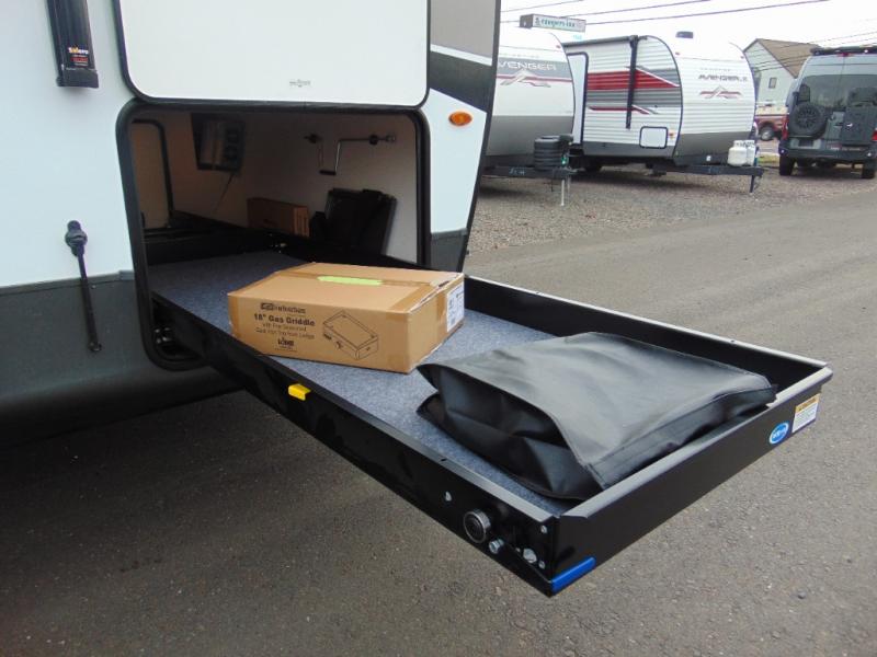 If you've been searching for a full-featured travel trailer, this is the one! Not only will you enjoy your own space up front in the master bedroom, but your guests can claim the rear bunkhouse suite all to themselves. There are two bunks with storage here, along with a desk, and a half bath for convenience. Your crew can meet in the middle living area on the theater seat or booth dinette. There is also a 39" TV here for movie nights! The chef can choose to cook indoors on the three burner range, or head outdoors to use the exterior griddle. A full walk-thru bath is sure to come in handy after a day at the lake, and did we mention this unit has dual entry doors?!