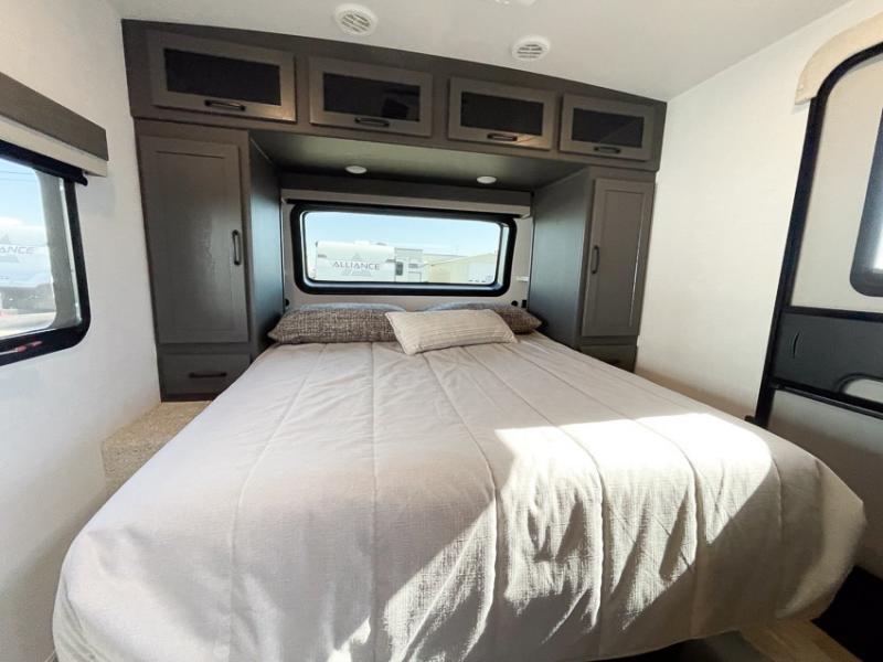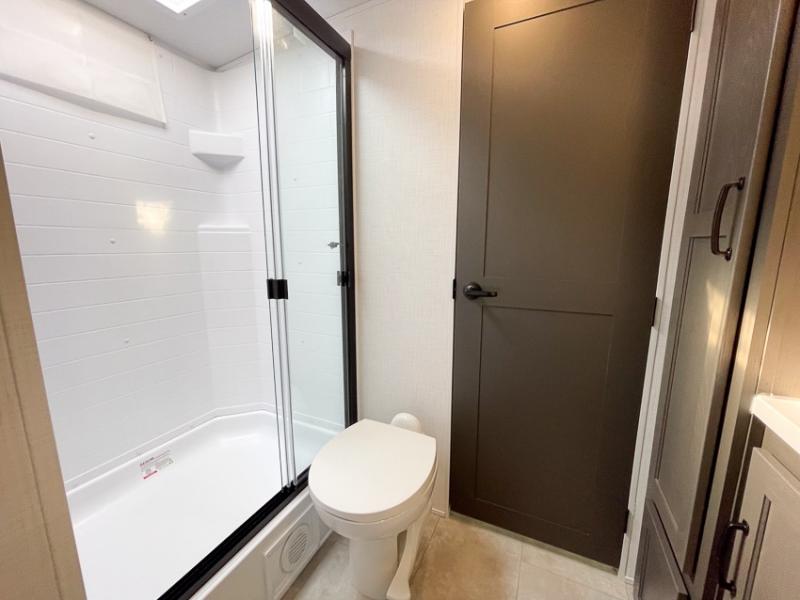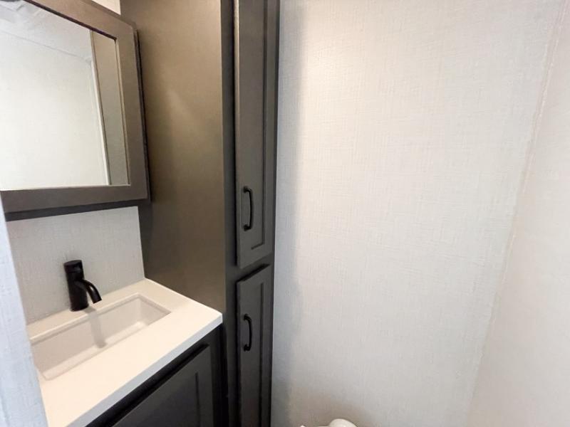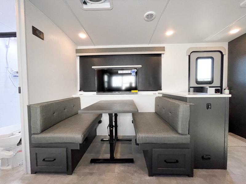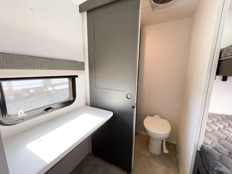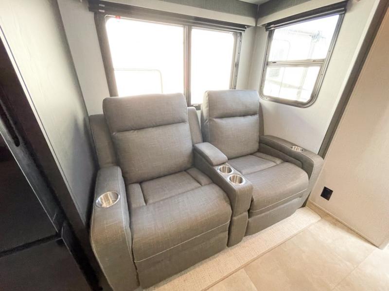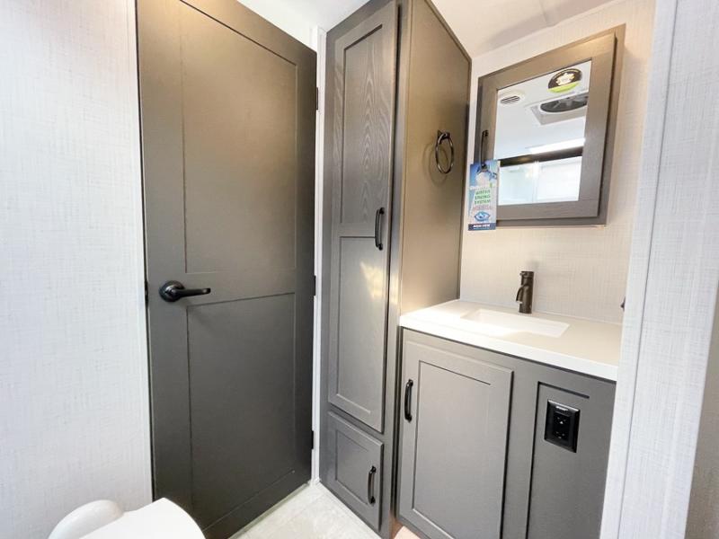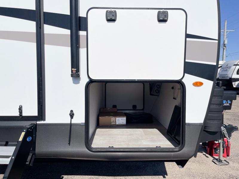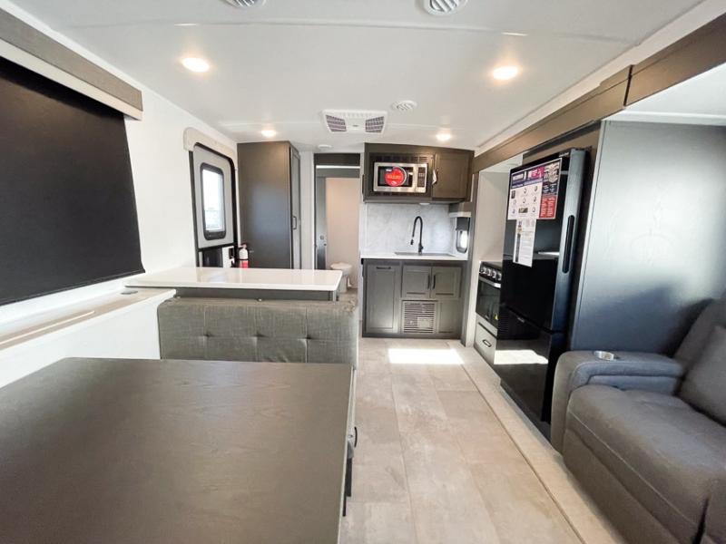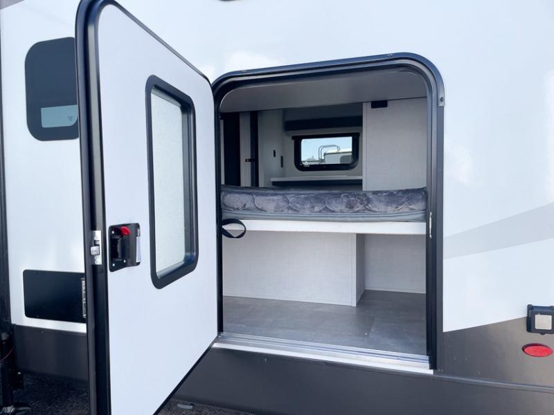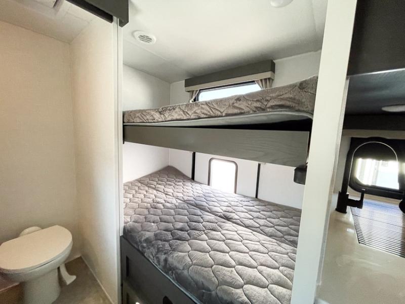 If you've been searching for a full-featured travel trailer, this is the one! Not only will you enjoy your own space up front in the master bedroom, but your guests can claim the rear bunkhouse suite all to themselves. There are two bunks with storage here, along with a desk, and a half bath for convenience. Your crew can meet in the middle living area on the theater seat or booth dinette. There is also a 39" TV here for movie nights! The chef can choose to cook indoors on the three burner range, or head outdoors to use the exterior griddle. A full walk-thru bath is sure to come in handy after a day at the lake, and did we mention this unit has dual entry doors?!
