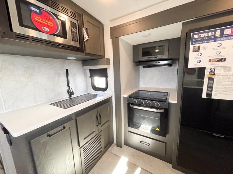 Each Rockwood Ultra Lite travel trailer by Forest River includes superior construction with a high gloss front cap, laminated white fiberglass sidewalls, and tinted frameless windows for a sleek look. The torsion axle, Rubber-Ryde suspension will make towing smooth and hassle-free, along with the nitrogen filled, Goodyear Endurance tires and the tire pressure monitor system. Interior comforts include designer kitchen backsplash, solid wood cabinet doors with hidden hinges, and night roller shades to name a few. Choose a Rockwood Ultra Lite travel trailer today!