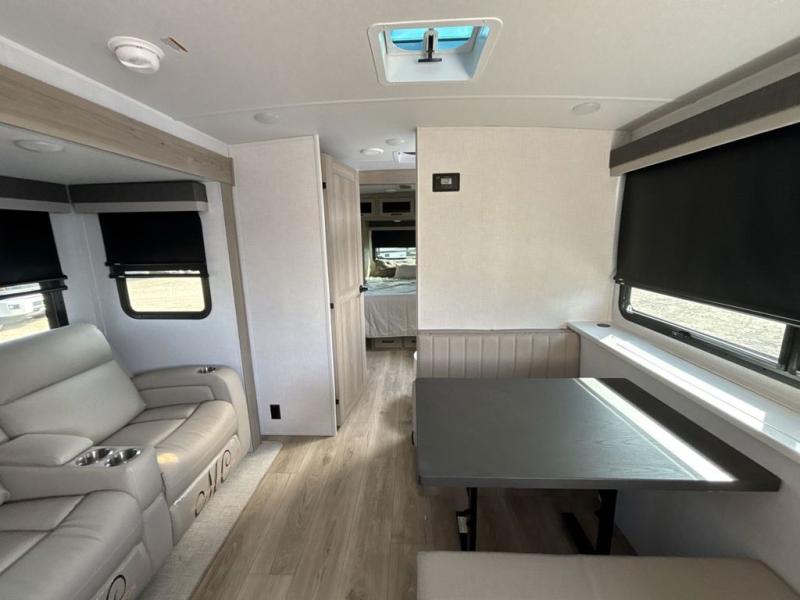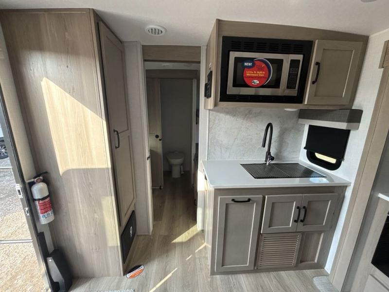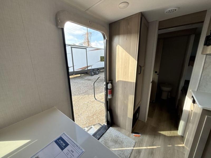 If you've been searching for a full-featured travel trailer, this is the one! Not only will you enjoy your own space up front in the master bedroom, but your guests can claim the rear bunkhouse suite all to themselves. There are two bunks with storage here, along with a desk, and a half bath for convenience. Your crew can meet in the middle living area on the theater seat or booth dinette. There is also a 39" TV here for movie nights! The chef can choose to cook indoors on the three burner range, or head outdoors to use the exterior griddle. A full walk-thru bath is sure to come in handy after a day at the lake, and did we mention this unit has dual entry doors?!