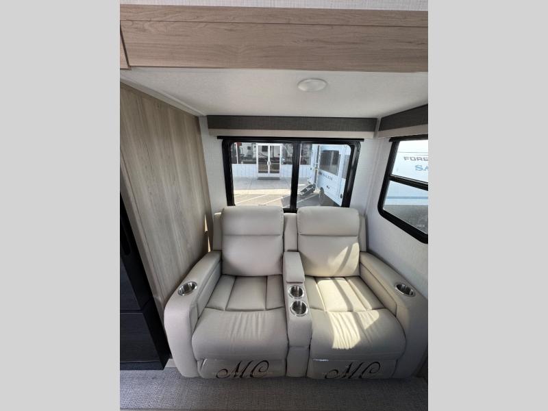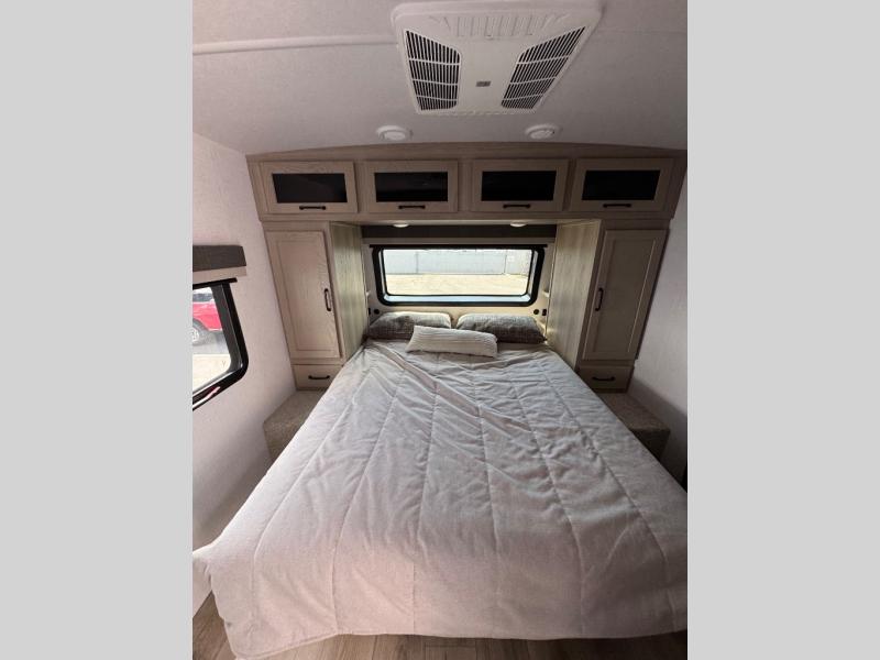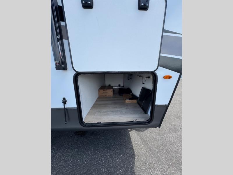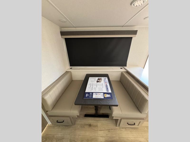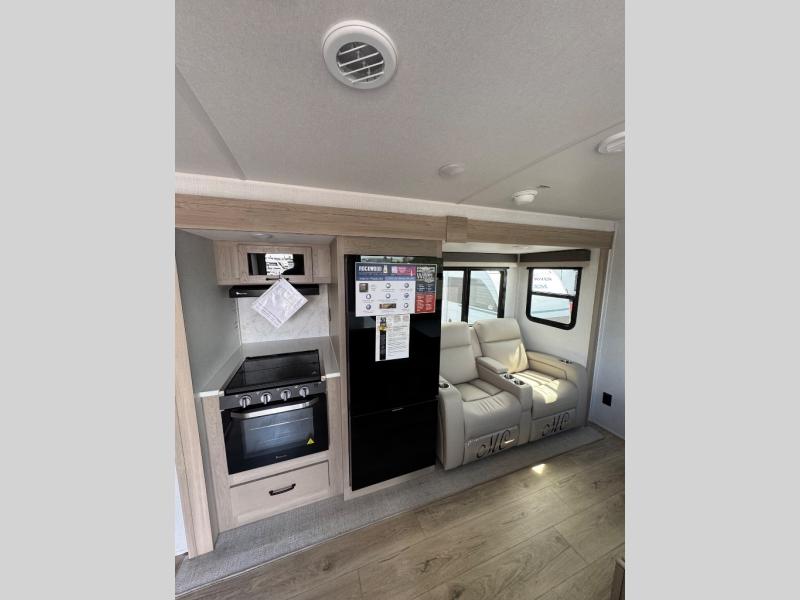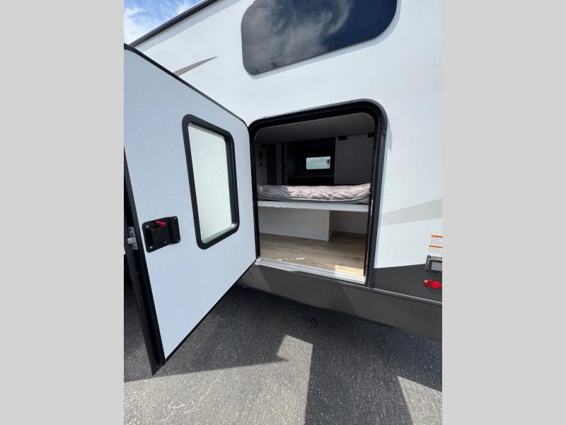 If you've been searching for a full-featured travel trailer, this is the one! Not only will you enjoy your own space up front in the master bedroom, but your guests can claim the rear bunkhouse suite all to themselves. There are two bunks with storage here, along with a desk, and a half bath for convenience. Your crew can meet in the middle living area on the theater seat or booth dinette. There is also a 39" TV here for movie nights! The chef can choose to cook indoors on the three burner range, or head outdoors to use the exterior griddle. A full walk-thru bath is sure to come in handy after a day at the lake, and did we mention this unit has dual entry doors?!