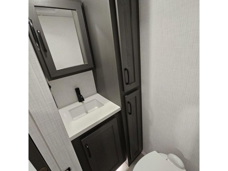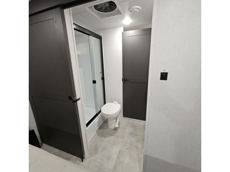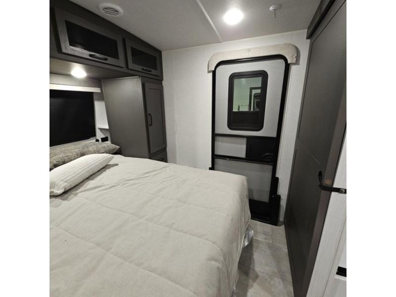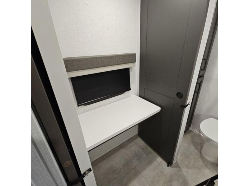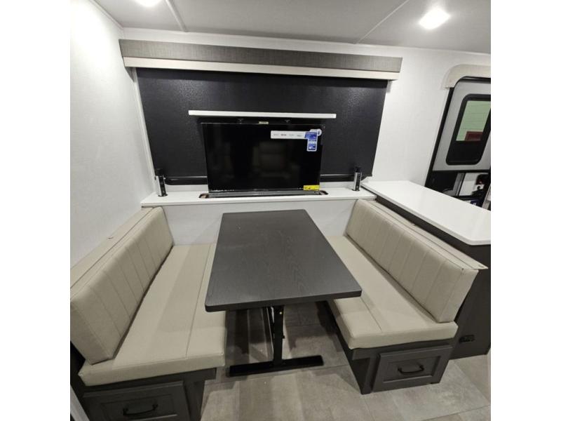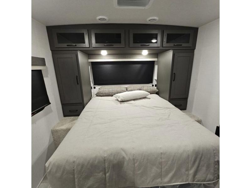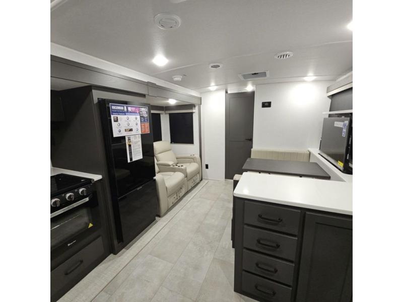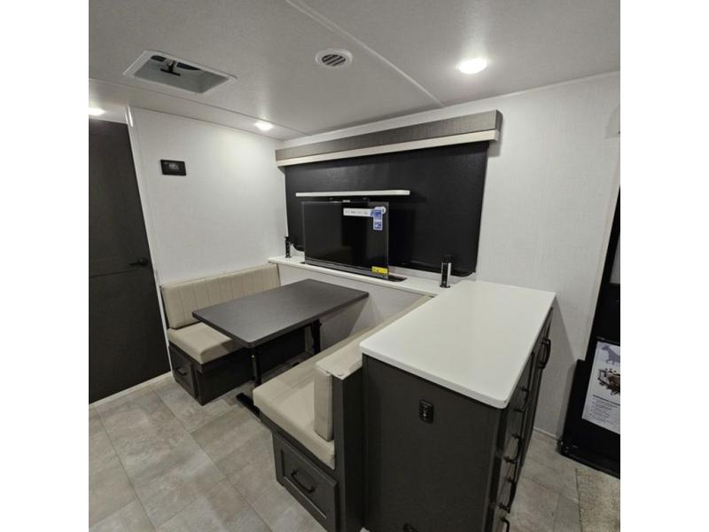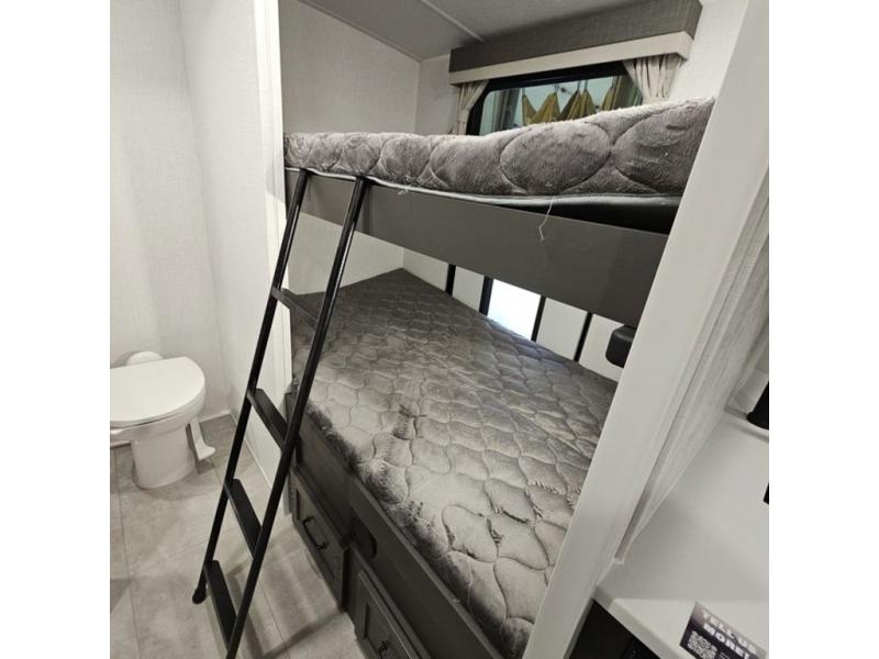 If you've been searching for a full-featured travel trailer, this is the one! Not only will you enjoy your own space up front in the master bedroom, but your guests can claim the rear bunkhouse suite all to themselves. There are two bunks with storage here, along with a desk, and a half bath for convenience. Your crew can meet in the middle living area on the theater seat or booth dinette. There is also a 39" TV here for movie nights! The chef can choose to cook indoors on the three burner range, or head outdoors to use the exterior griddle. A full walk-thru bath is sure to come in handy after a day at the lake, and did we mention this unit has dual entry doors?!