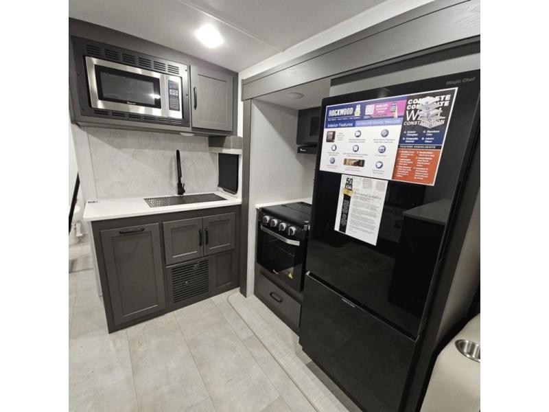 Each Rockwood Ultra Lite travel trailer by Forest River includes superior construction with a high gloss front cap, laminated white fiberglass sidewalls, and tinted frameless windows for a sleek look. The torsion axle, Rubber-Ryde suspension will make towing smooth and hassle-free, along with the nitrogen filled, Goodyear Endurance tires and the tire pressure monitor system. Interior comforts include designer kitchen backsplash, solid wood cabinet doors with hidden hinges, and night roller shades to name a few. Choose a Rockwood Ultra Lite travel trailer today!