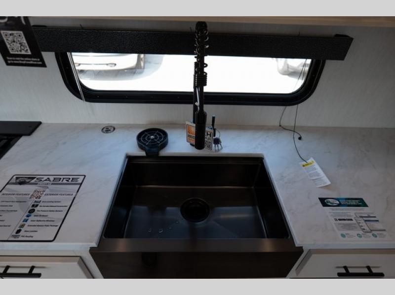 You will experience luxurious camping trips at an affordable price with any one of these Forest River Sabre fifth wheels! These models are durable and ready to travel anytime of the year thanks to features like the high-gloss gel-coat front cap with LED lighting, the PVC roof membrane, and the forced air underbelly with enclosed gate valves. The electric auto-leveling system makes setting up easy and safe, and the adjustable power awning with LED lighting will create an inviting outdoor living space. Each model includes a universal docking station which includes a black tank flush and an outside shower, and detachable and adjustable stable steps for you to enter and exit the unit safely. Inside, you will love the design of the ambient accent lighting above the crown molding in the living area, the real wood lumbercore cabinetry, and the vintage gaslight decorative lighting!