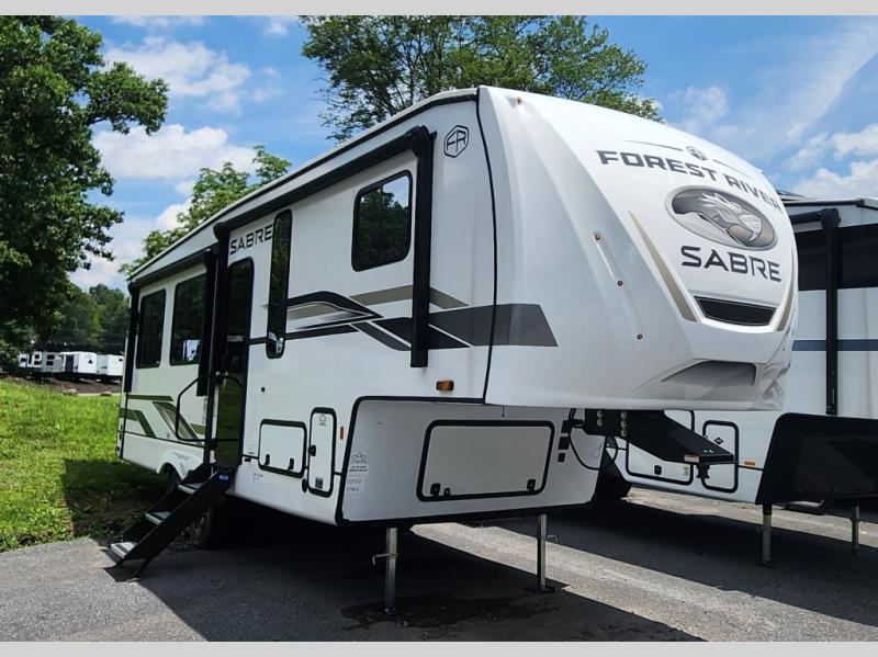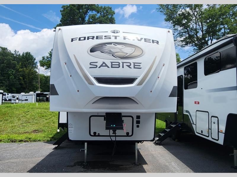 You will experience luxurious camping trips at an affordable price with any one of these Forest River Sabre fifth wheels! These models are durable and ready to travel anytime of the year thanks to features like the high-gloss gel-coat front cap with LED lighting, the PVC roof membrane, and the forced air underbelly with enclosed gate valves. The electric auto-leveling system makes setting up easy and safe, and the adjustable power awning with LED lighting will create an inviting outdoor living space. Each model includes a universal docking station which includes a black tank flush and an outside shower, and detachable and adjustable stable steps for you to enter and exit the unit safely. Inside, you will love the design of the ambient accent lighting in the living area, the real wood lumbercore cabinetry, and the linoleum flooring!