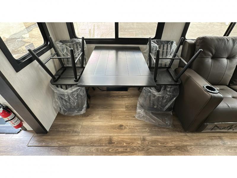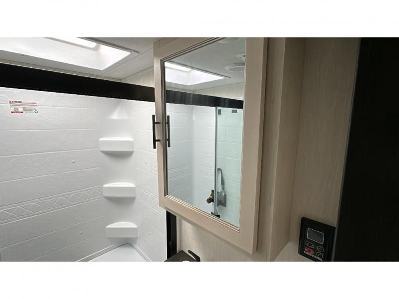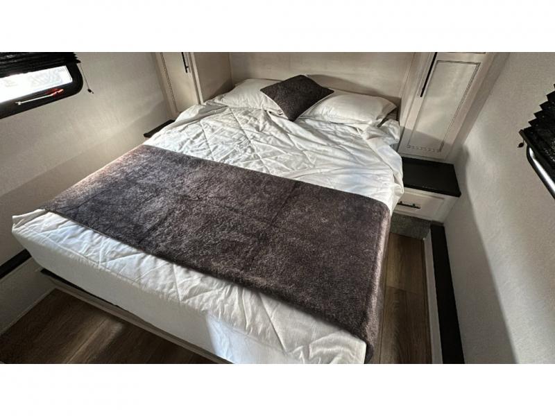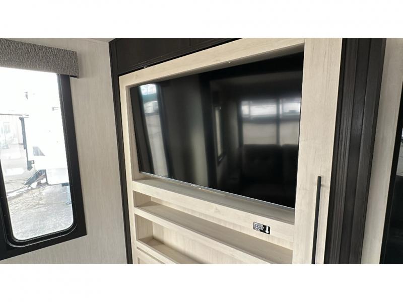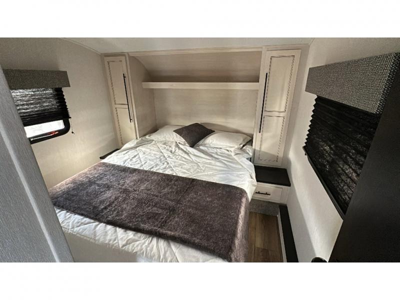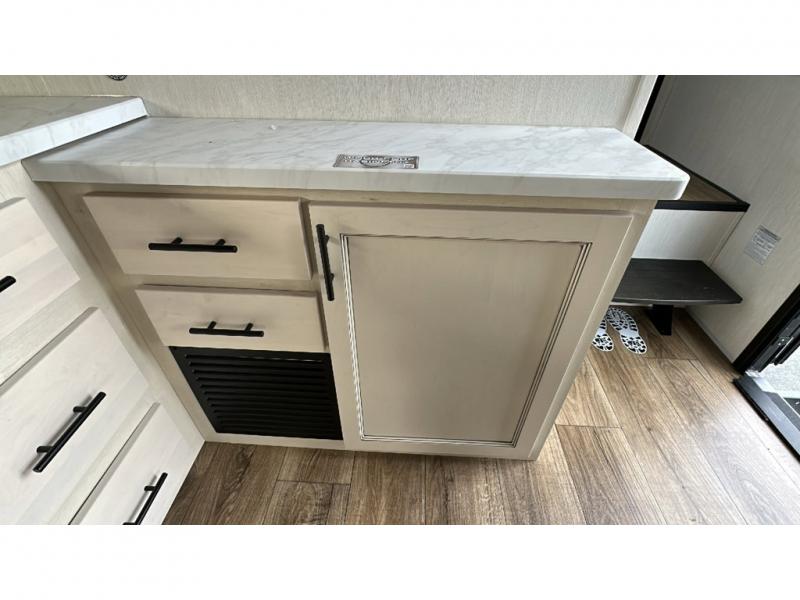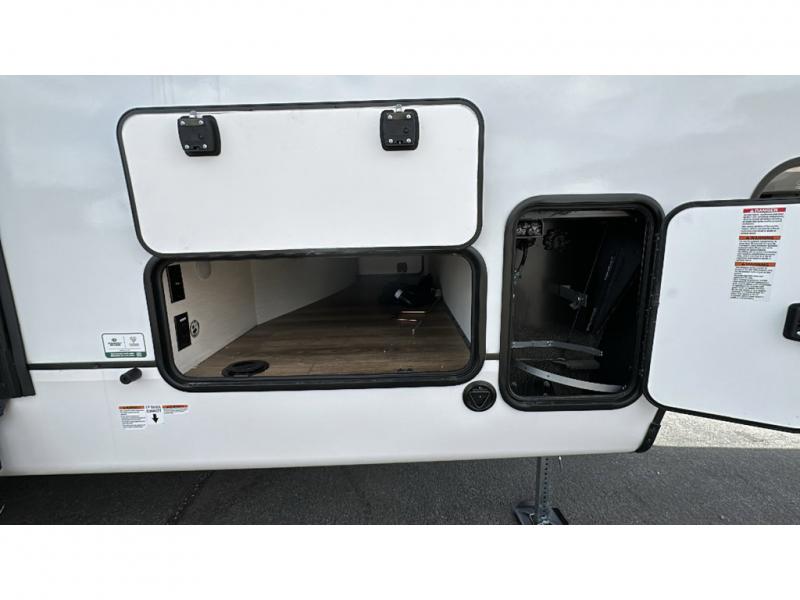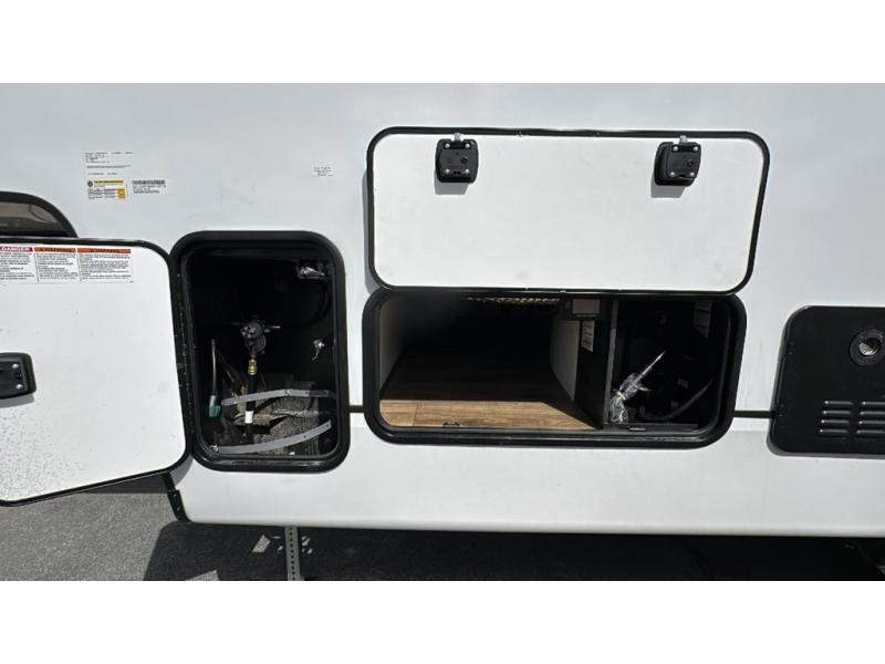 Time at the campground in this spacious travel trailer will be time well spent! The large slide out will provide your crew with plenty of space to stretch out, and there is a free-standing table here and a theater seat for added comfort. The swing-out entertainment center hides the walk-in pantry, and the colossal 12V refrigerator with French doors will be perfect for perishables. There is generous counter space in the fully-equipped kitchen, and the full bath includes a spacious shower with a seat so you won't feel crammed when getting ready for the day. Head to the front private bedroom where you'll get a great night's rest on the queen bed and be able to store your items in the dual wardrobes!