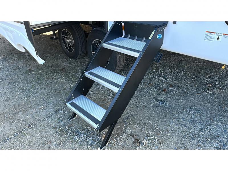 You will experience luxurious camping trips at an affordable price with any one of these Forest River Sabre fifth wheels! These models are durable and ready to travel anytime of the year thanks to features like the high-gloss gel-coat front cap with LED lighting, the PVC roof membrane, and the forced air underbelly with enclosed gate valves. The electric auto-leveling system makes setting up easy and safe, and the adjustable power awning with LED lighting will create an inviting outdoor living space. Each model includes a universal docking station which includes a black tank flush and an outside shower, and detachable and adjustable stable steps for you to enter and exit the unit safely. Inside, you will love the design of the ambient accent lighting in the living area, the real wood lumbercore cabinetry, and the linoleum flooring!