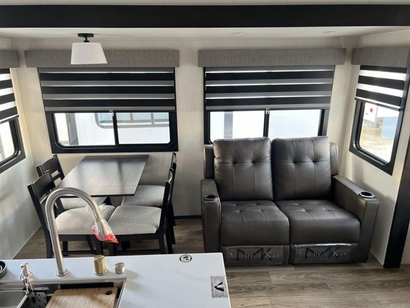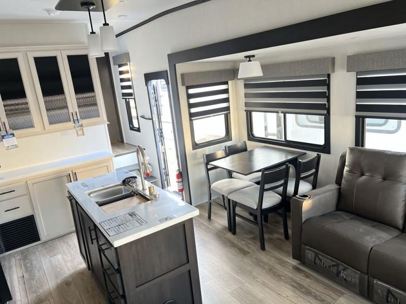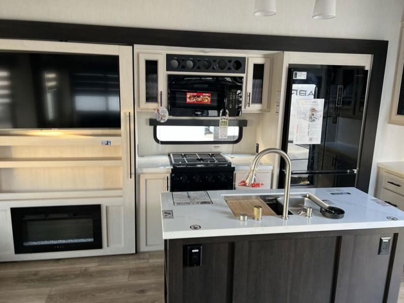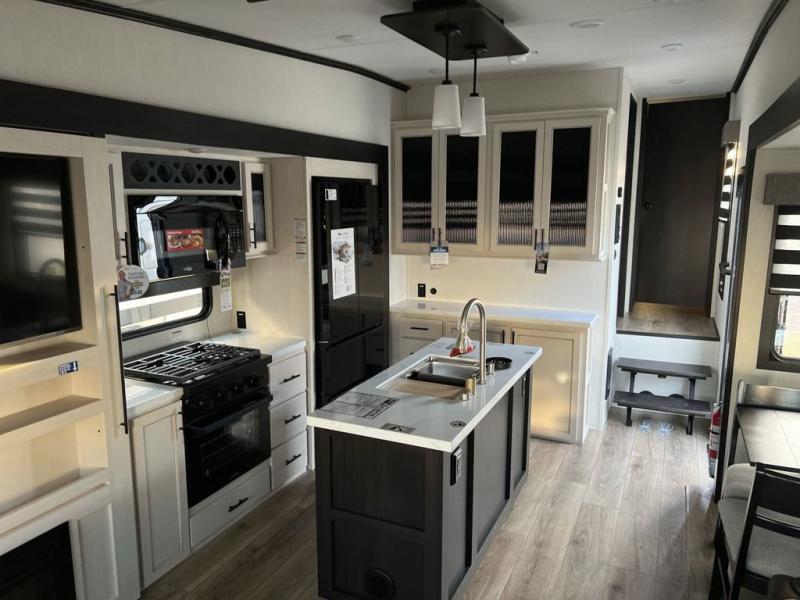 You will feel right at home in this fifth wheel! The rear living area includes a tri-fold sofa, a TV with a fireplace below, and theater seating for two making this space a second bedroom at night for guests. In the morning, you can prepare breakfast on the kitchen island and cooktop, then dine together at the table with chairs. There is plenty of storage space here, including a hidden pantry, a hutch, and overhead cabinets. The full bath will allow you to stay clean throughout your trip, and you'll feel right at home in the front private bedroom with a king bed. This model also includes an outside refrigerator for snacks, plus pass-thru storage for all your gear!