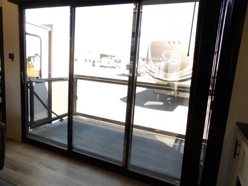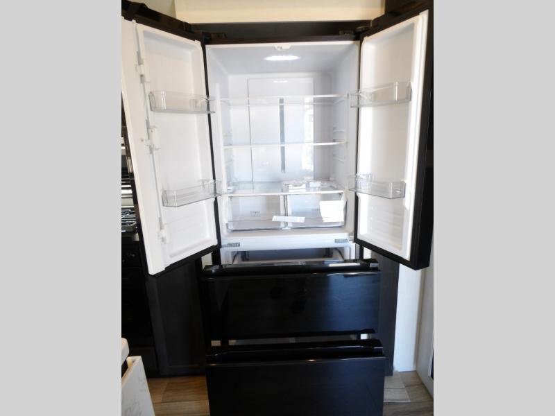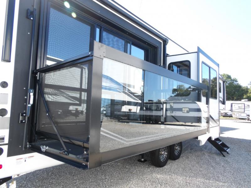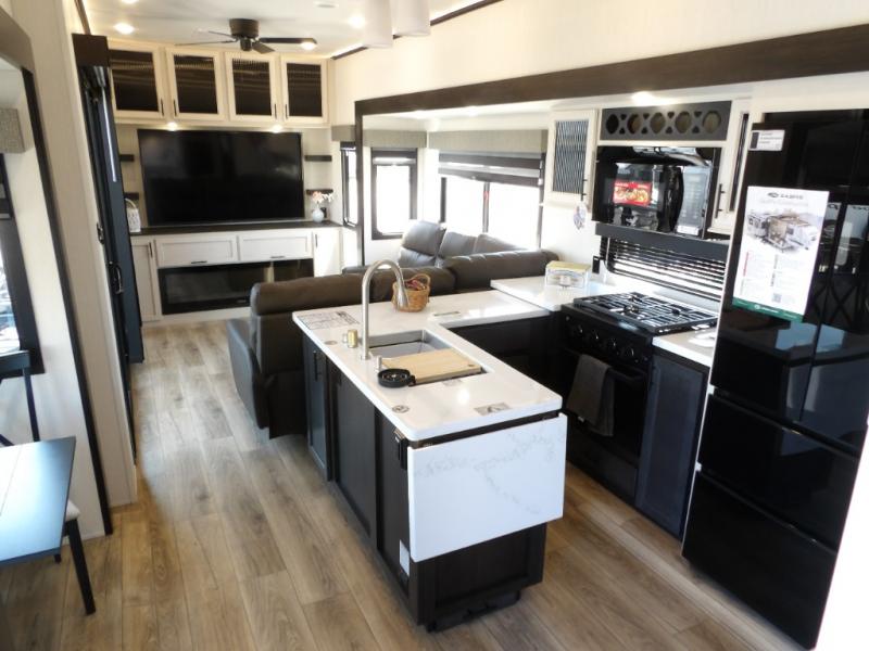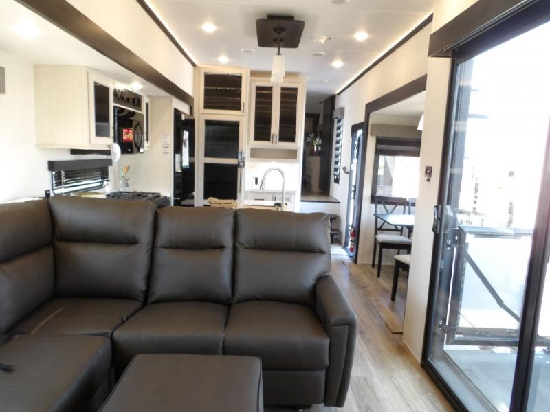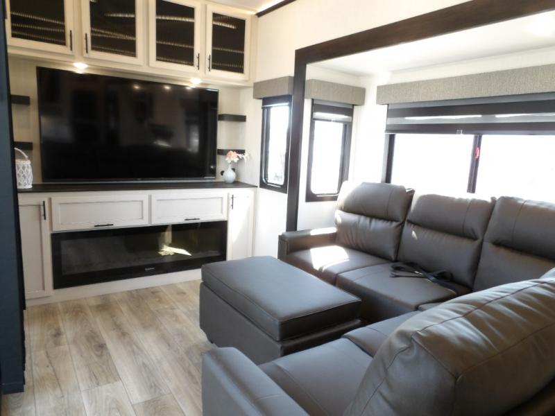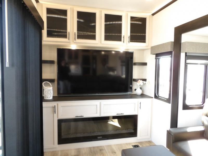 This fifth wheel is sure to have you feeling right at home, wherever you choose to roam! The rear living room is inviting with its sectional sofa with an ottoman, an entertainment center, and a fireplace, plus this room includes sliding patio doors that lead to the patio deck! The chef of your group can prepare home cooked meals in the middle kitchen that includes generous counter space, along with a hutch, pantry, and residential refrigerator. A full bath includes a spacious shower with a seat for added comfort, and the camper king bed slide in the front bedroom is sure to provide a great night's rest. There is also a dresser and a front wardrobe with washer and dryer prep if you want to add those appliances.
