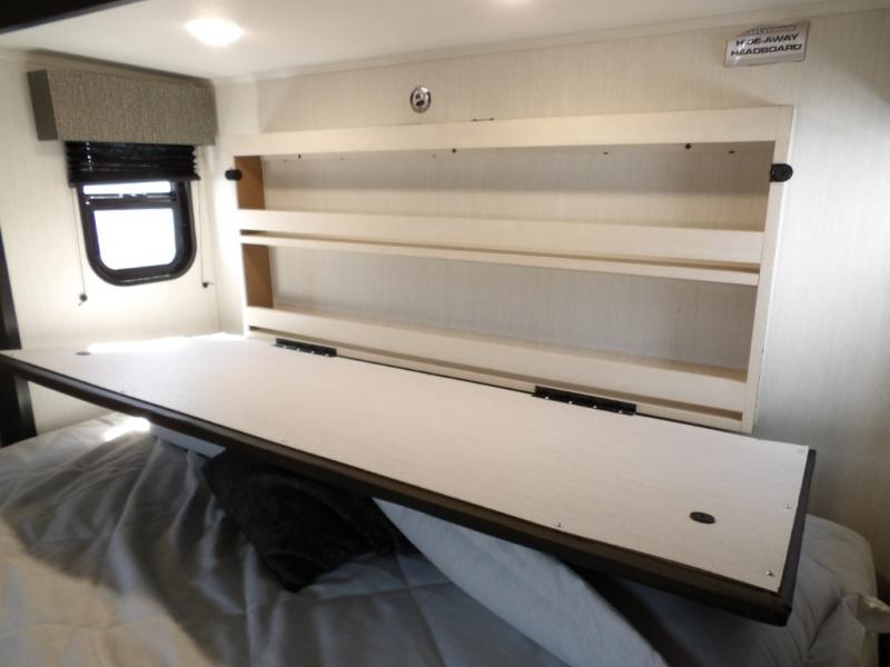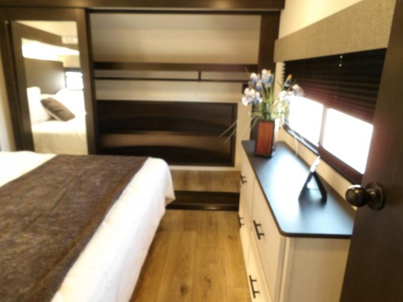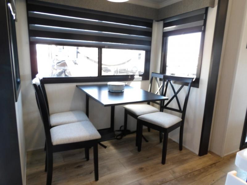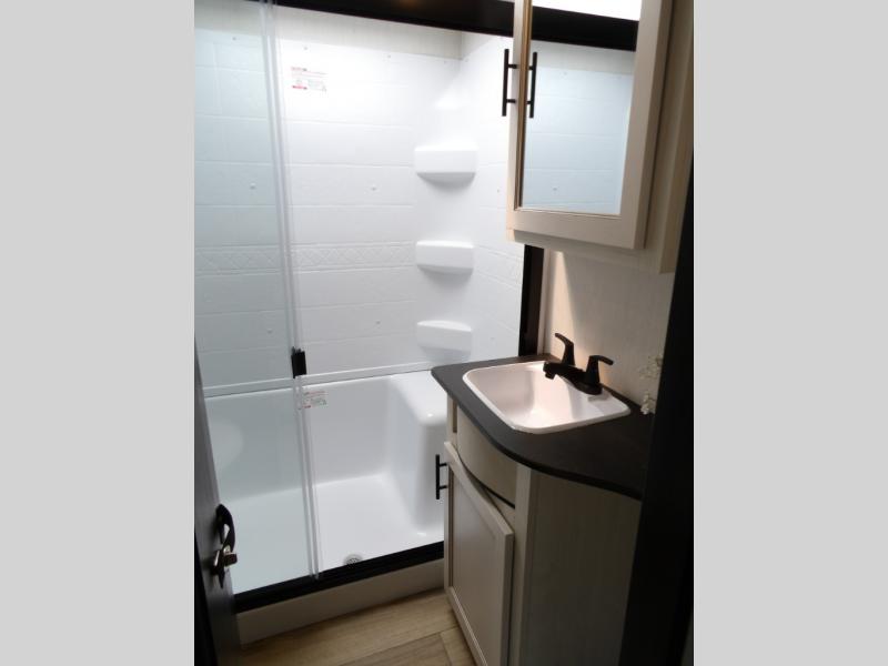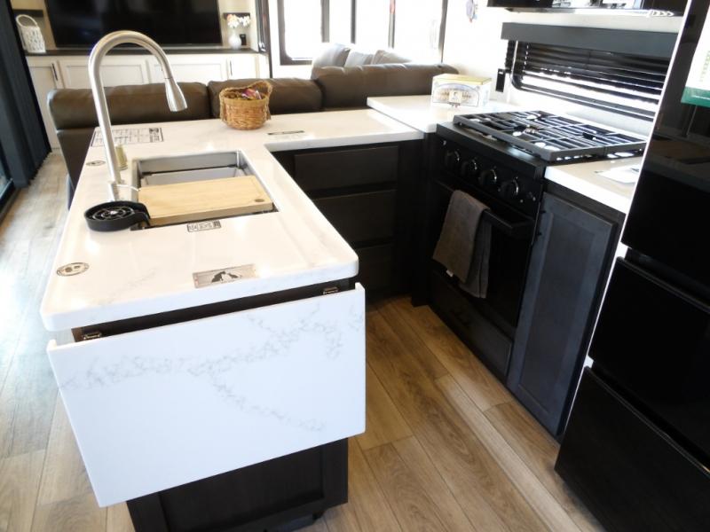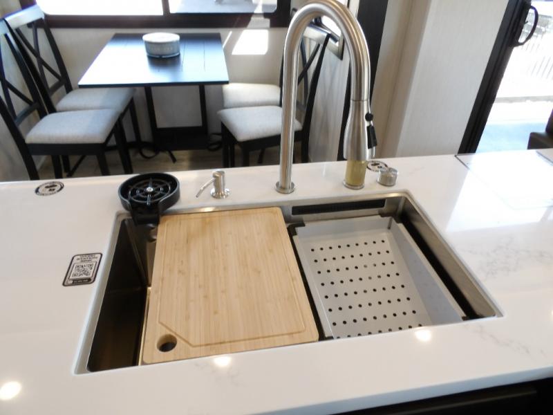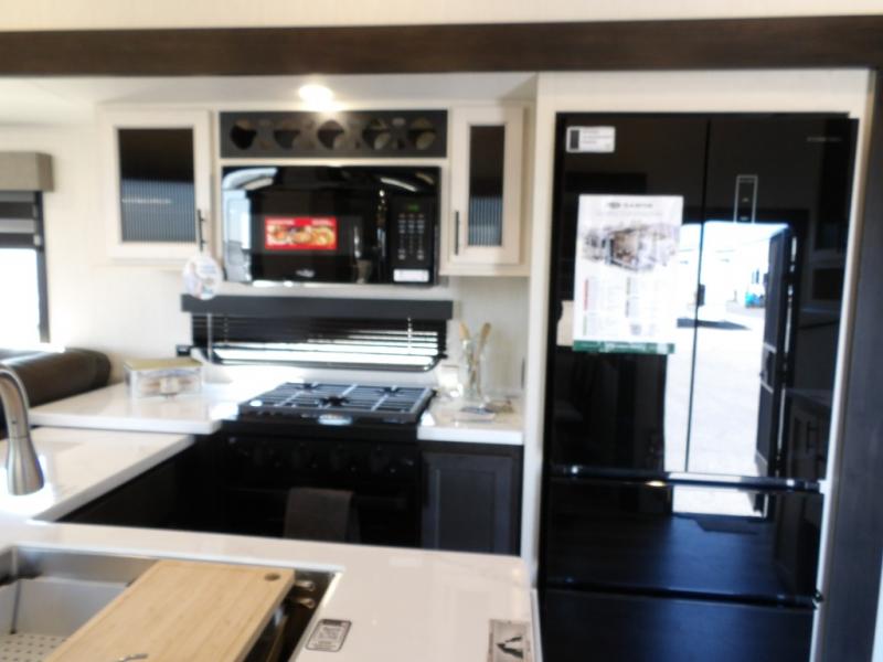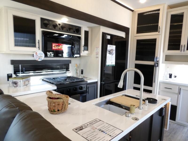 You will experience luxurious camping trips at an affordable price with any one of these Forest River Sabre fifth wheels! These models are durable and ready to travel anytime of the year thanks to features like the high-gloss gel-coat front cap with LED lighting, the PVC roof membrane, and the forced air underbelly with enclosed gate valves. The electric auto-leveling system makes setting up easy and safe, and the adjustable power awning with LED lighting will create an inviting outdoor living space. Each model includes a universal docking station which includes a black tank flush and an outside shower, and detachable and adjustable stable steps for you to enter and exit the unit safely. Inside, you will love the design of the ambient accent lighting in the living area, the real wood lumbercore cabinetry, and the linoleum flooring!