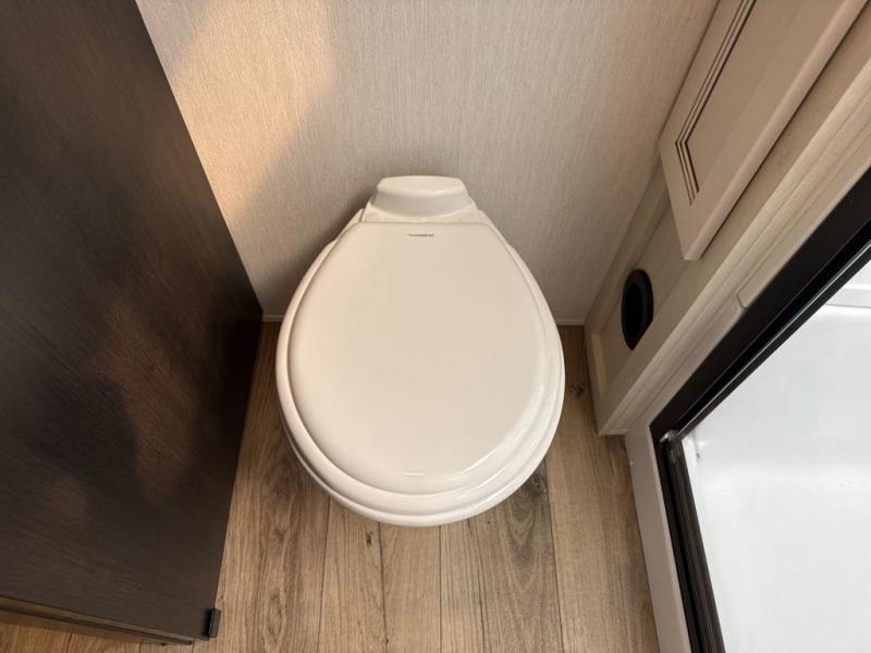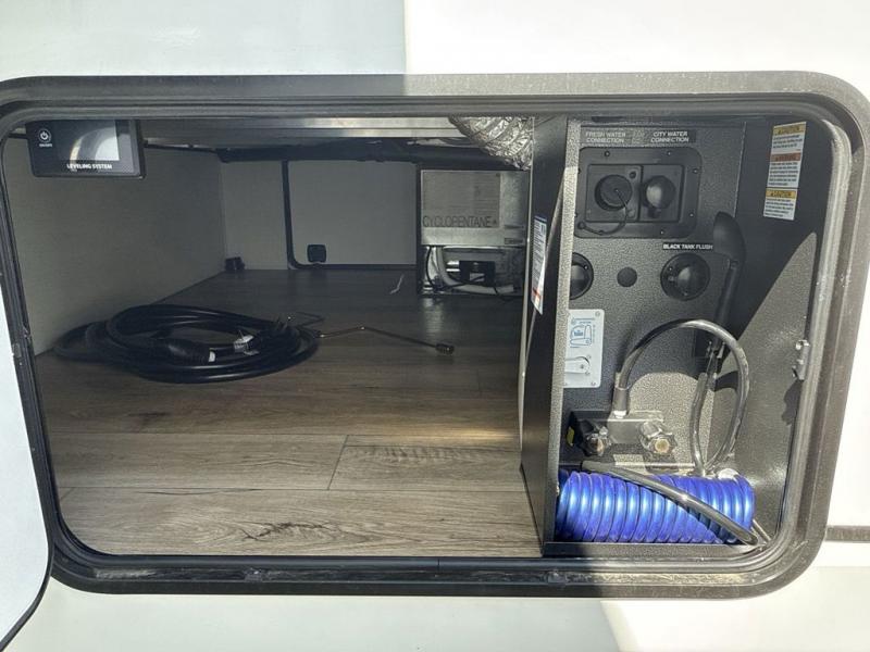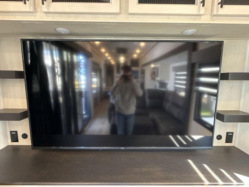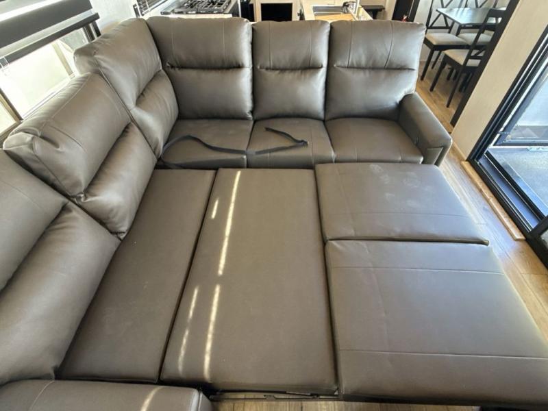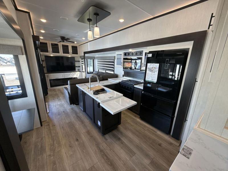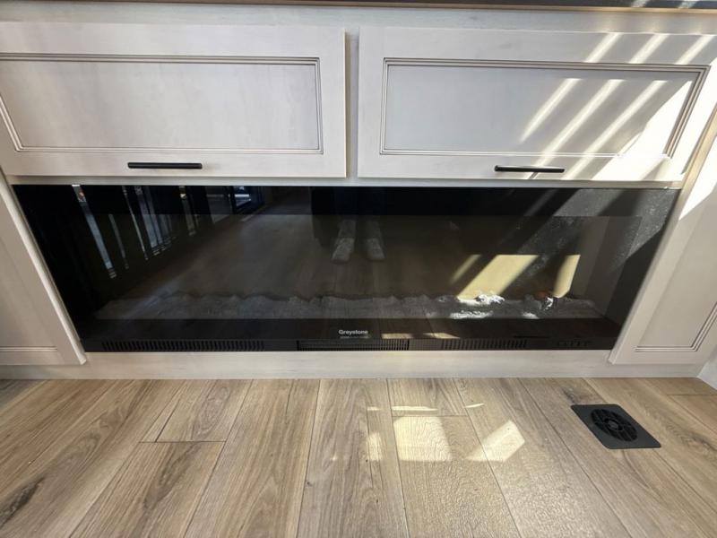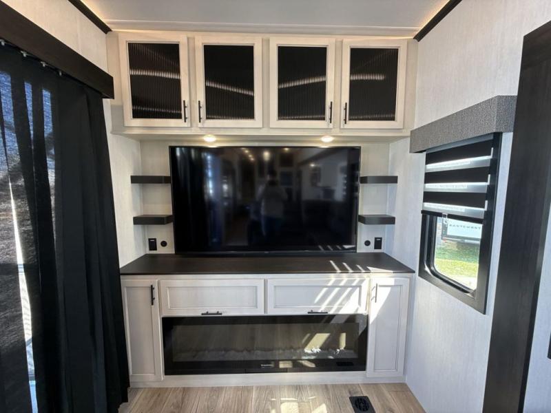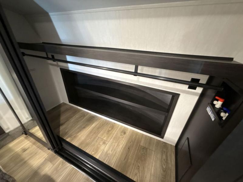 This fifth wheel is sure to have you feeling right at home, wherever you choose to roam! The rear living room is inviting with its sectional sofa with an ottoman, an entertainment center, and a fireplace, plus this room includes sliding patio doors that lead to the patio deck! The chef of your group can prepare home cooked meals in the middle kitchen that includes generous counter space, along with a hutch, pantry, and residential refrigerator. A full bath includes a spacious shower with a seat for added comfort, and the camper king bed slide in the front bedroom is sure to provide a great night's rest. There is also a dresser and a front wardrobe with washer and dryer prep if you want to add those appliances.