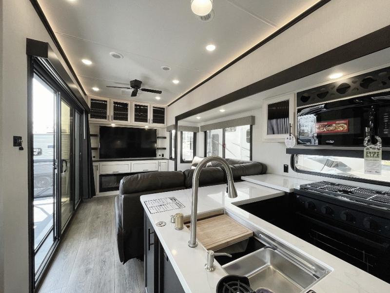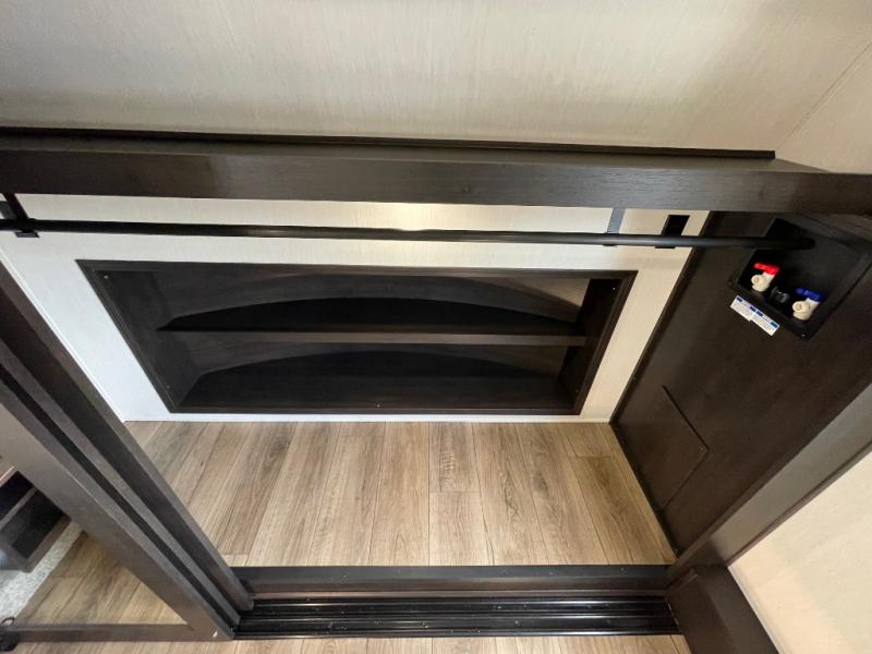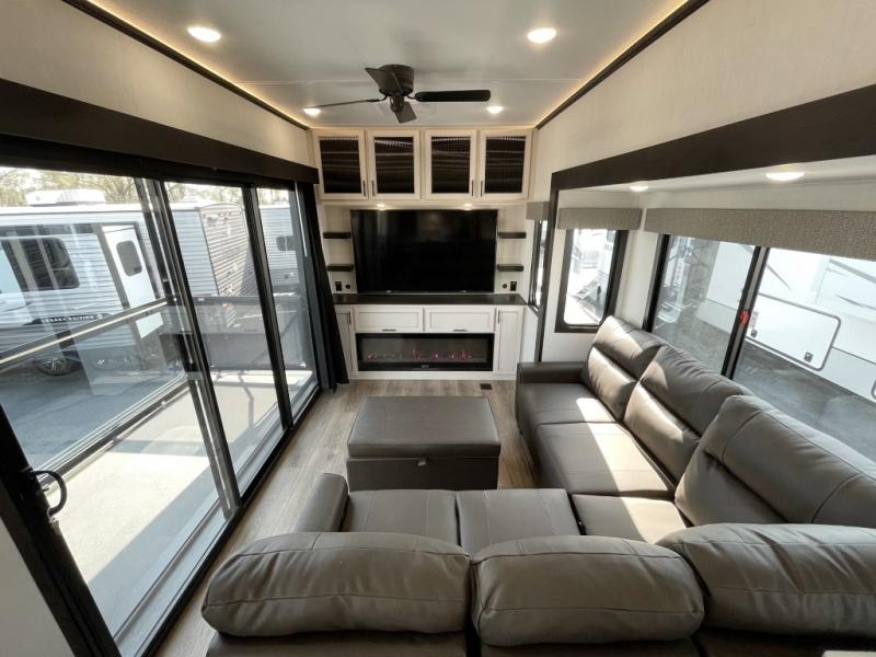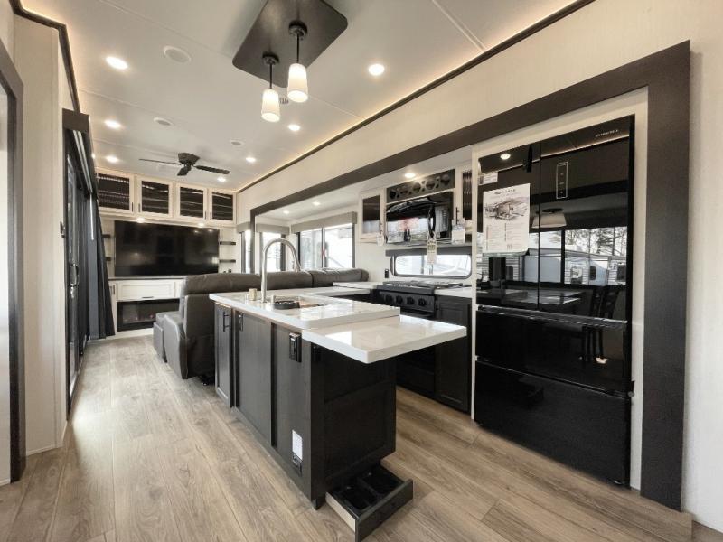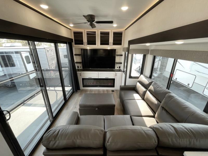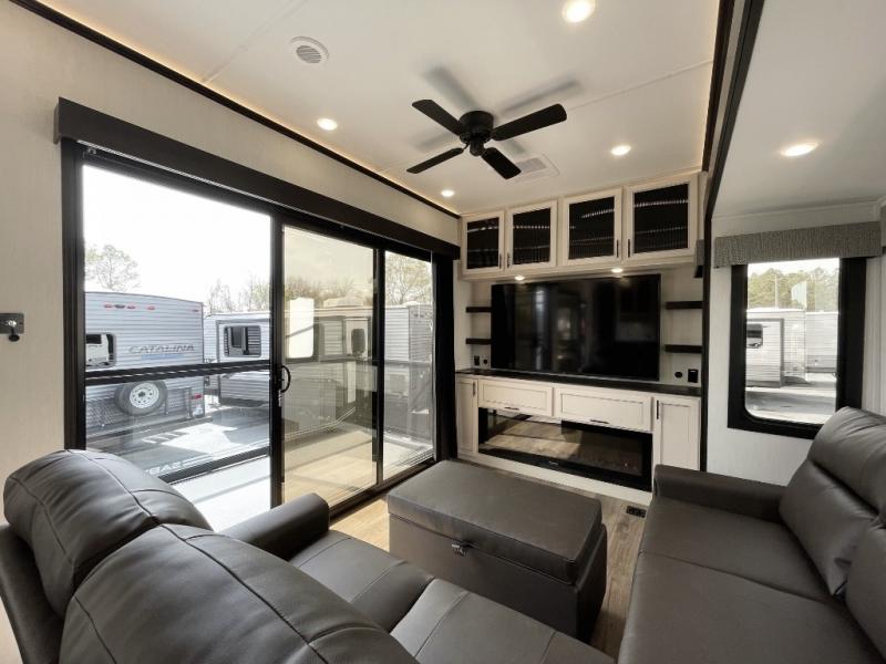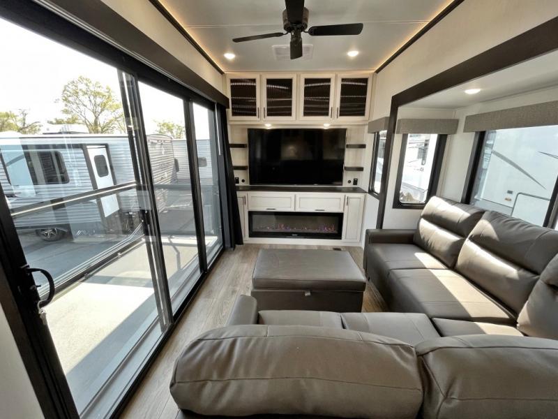This fifth wheel is sure to have you feeling right at home, wherever you choose to roam! The rear living room is inviting with its sectional sofa with an ottoman, an entertainment center, and a fireplace, plus this room includes sliding patio doors that lead to the patio deck! The chef of your group can prepare home cooked meals in the middle kitchen that includes generous counter space, along with a hutch, pantry, and residential refrigerator. A full bath includes a spacious shower with a seat for added comfort, and the camper king bed slide in the front bedroom is sure to provide a great night's rest. There is also a dresser and a front wardrobe with washer and dryer prep if you want to add those appliances.