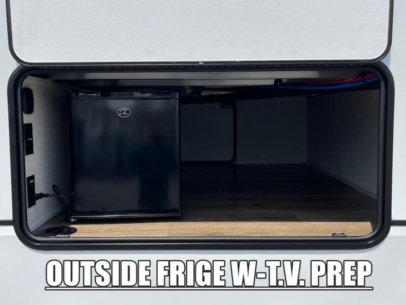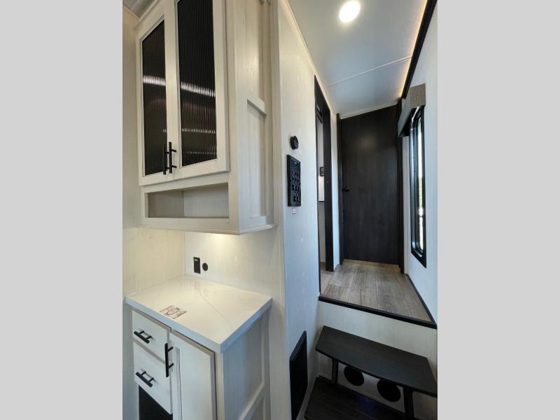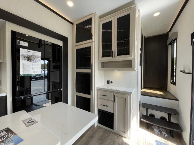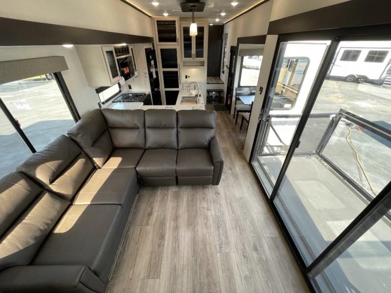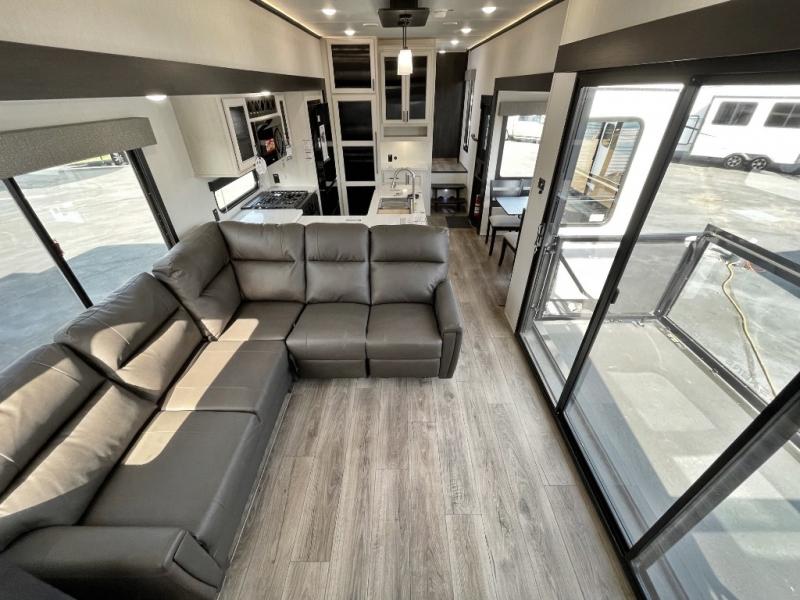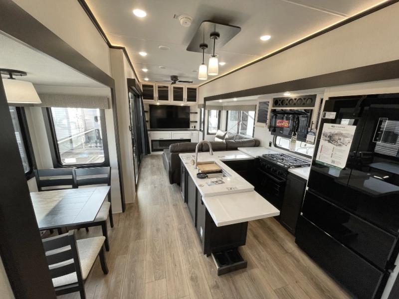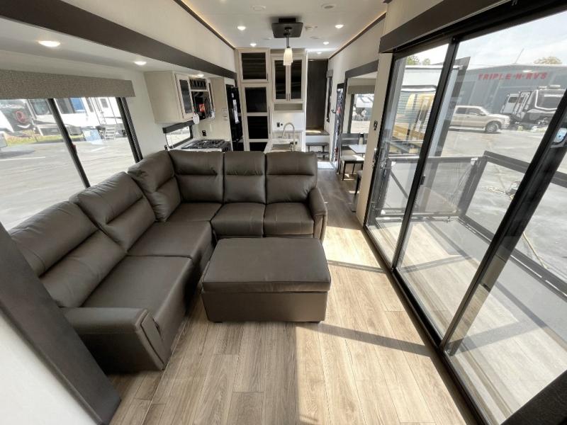 This fifth wheel is sure to have you feeling right at home, wherever you choose to roam! The rear living room is inviting with its sectional sofa with an ottoman, an entertainment center, and a fireplace, plus this room includes sliding patio doors that lead to the patio deck! The chef of your group can prepare home cooked meals in the middle kitchen that includes generous counter space, along with a hutch, pantry, and residential refrigerator. A full bath includes a spacious shower with a seat for added comfort, and the camper king bed slide in the front bedroom is sure to provide a great night's rest. There is also a dresser and a front wardrobe with washer and dryer prep if you want to add those appliances.