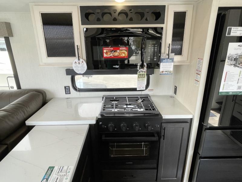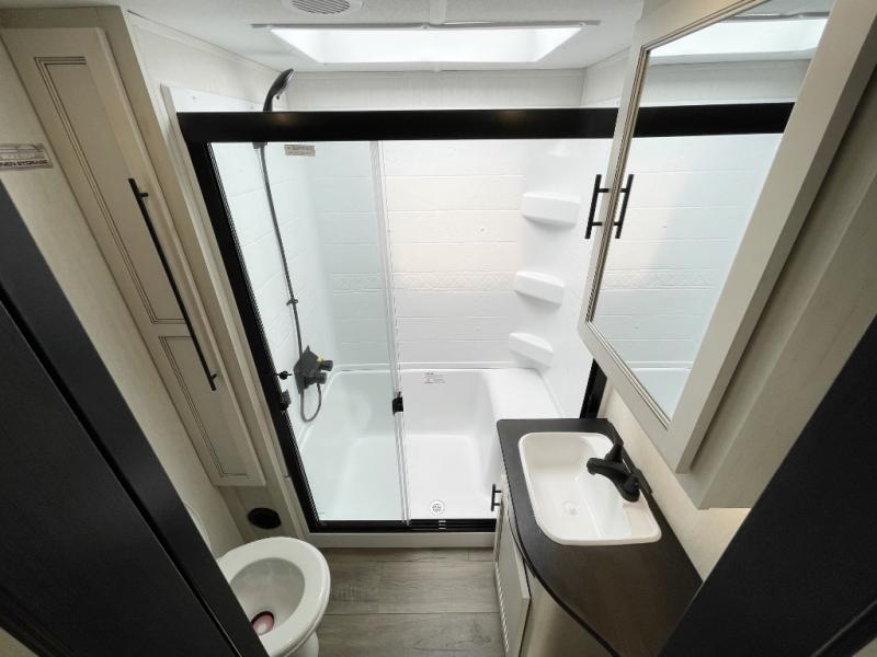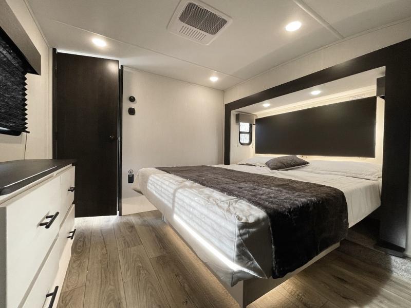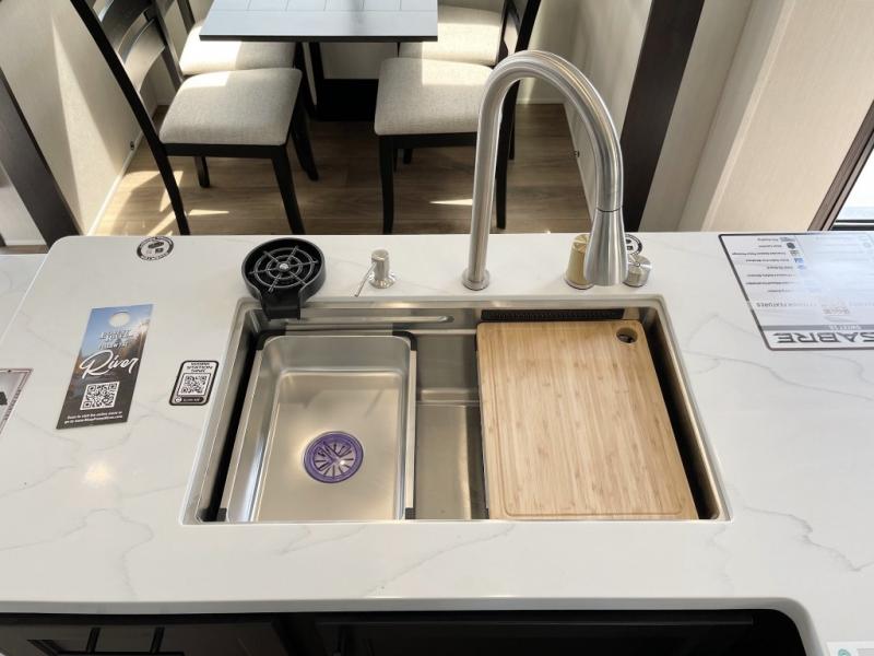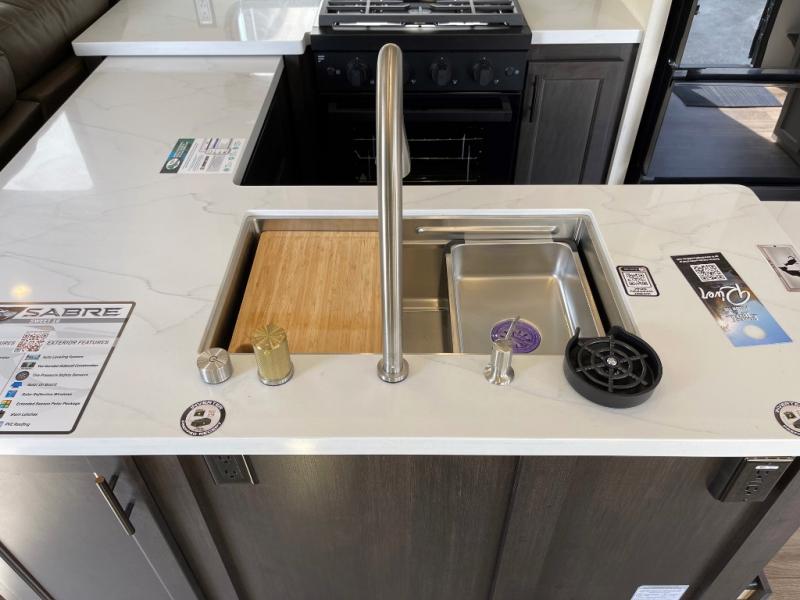 You will experience luxurious camping trips at an affordable price with any one of these Forest River Sabre fifth wheels! These models are durable and ready to travel anytime of the year thanks to features like the high-gloss gel-coat front cap with LED lighting, the PVC roof membrane, and the forced air underbelly with enclosed gate valves. The electric auto-leveling system makes setting up easy and safe, and the adjustable power awning with LED lighting will create an inviting outdoor living space. Each model includes a universal docking station which includes a black tank flush and an outside shower, and detachable and adjustable stable steps for you to enter and exit the unit safely. Inside, you will love the design of the ambient accent lighting in the living area, the real wood lumbercore cabinetry, and the linoleum flooring!