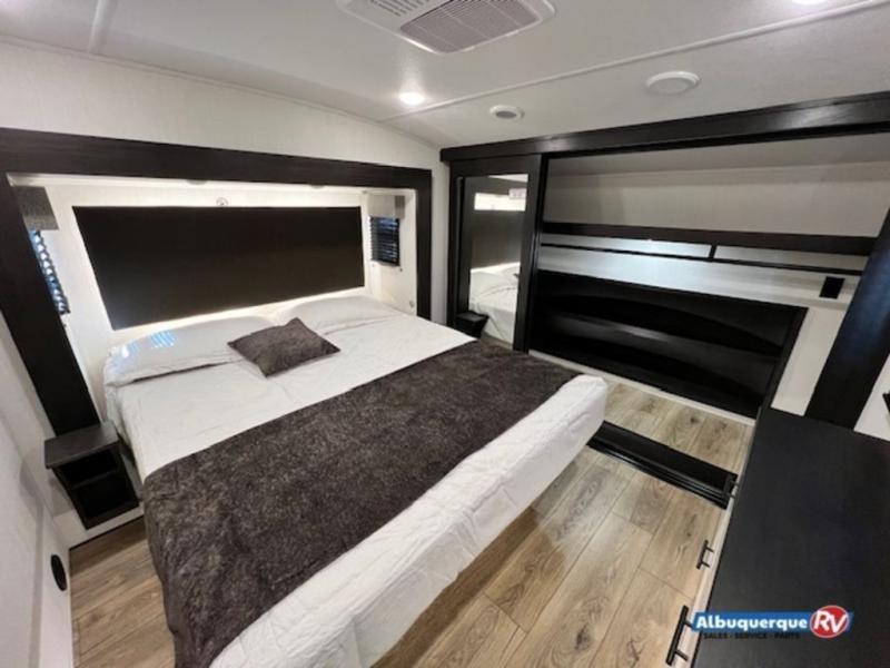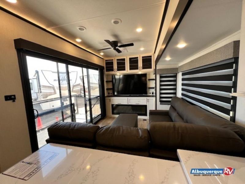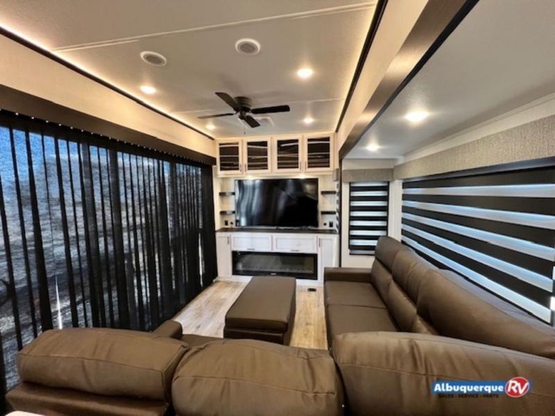 This fifth wheel is sure to have you feeling right at home, wherever you choose to roam! The rear living room is inviting with its sectional sofa with an ottoman, an entertainment center, and a fireplace, plus this room includes sliding patio doors that lead to the patio deck! The chef of your group can prepare home cooked meals in the middle kitchen that includes generous counter space, along with a hutch, pantry, and residential refrigerator. A full bath includes a spacious shower with a seat for added comfort, and the camper king bed slide in the front bedroom is sure to provide a great night's rest. There is also a dresser and a front wardrobe with washer and dryer prep if you want to add those appliances.