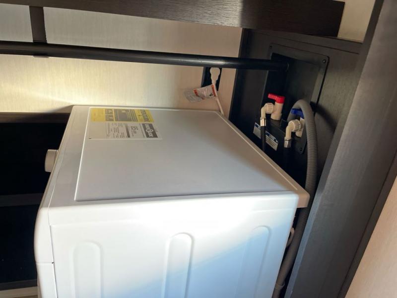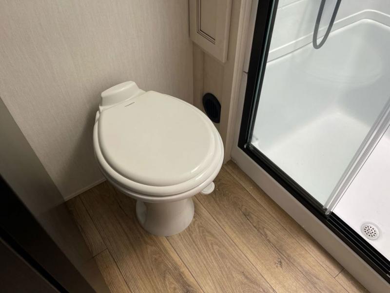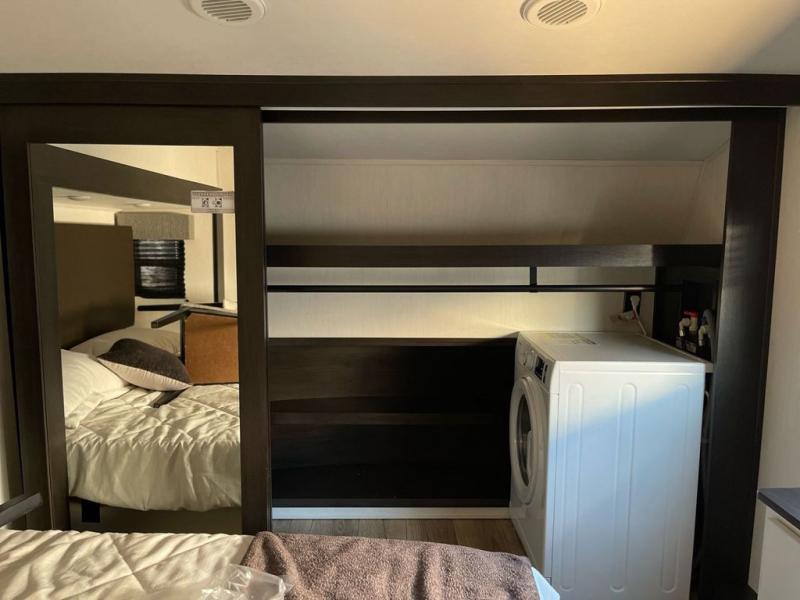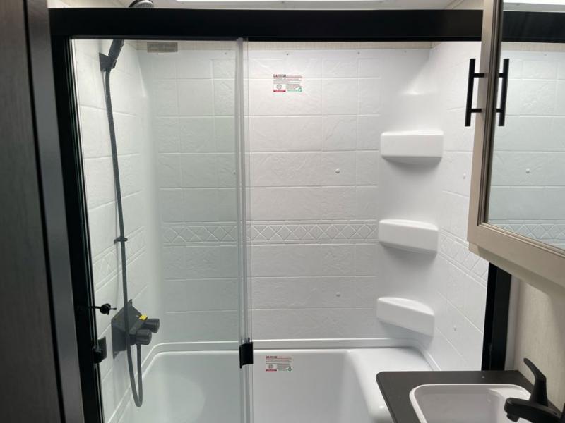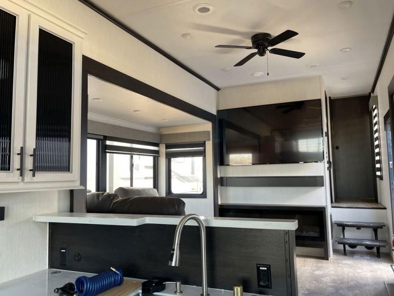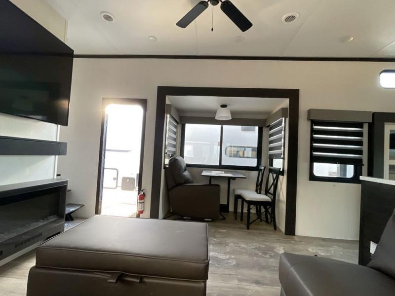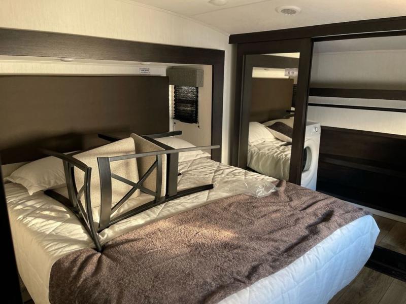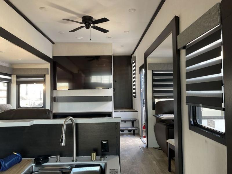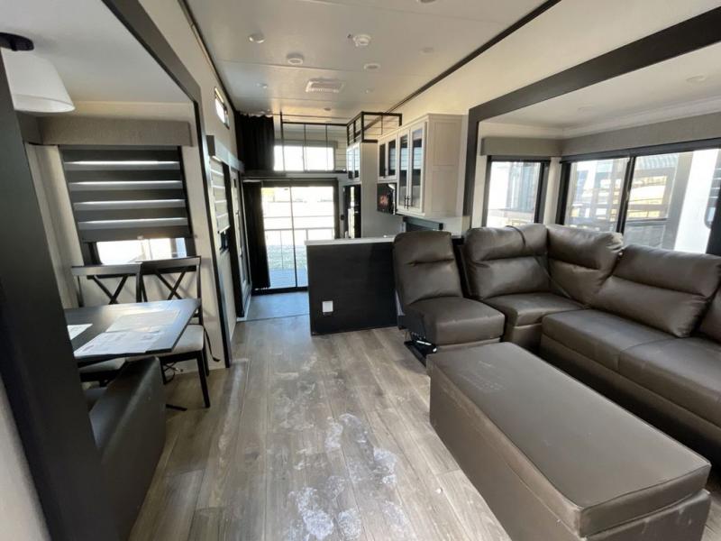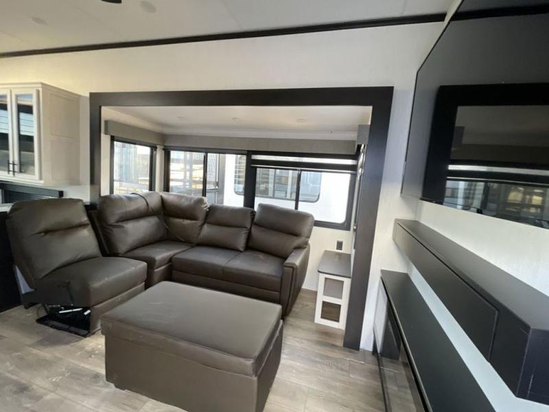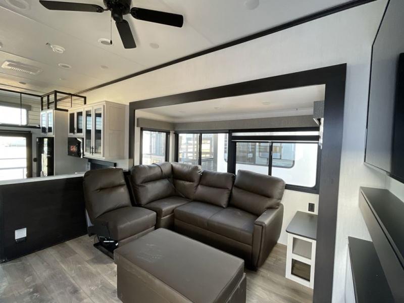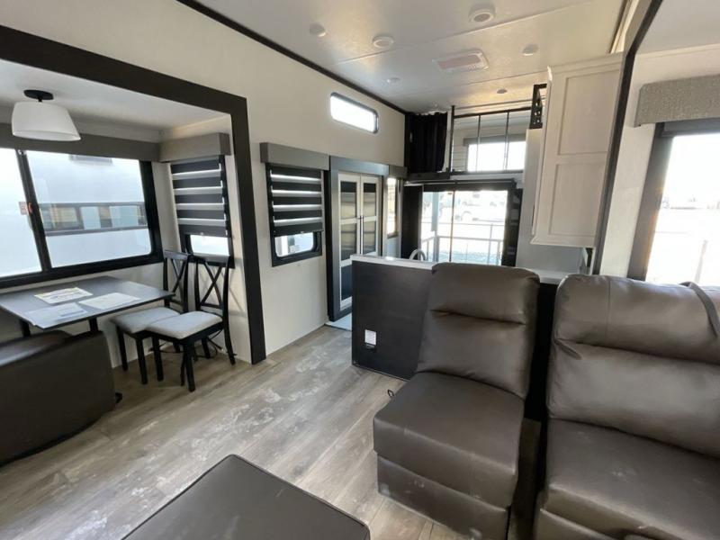 Whether you're weekend warriors or going full-time, this fifth wheel is sure to bring many happy days! The rear deck provides a place to relax in the evenings, and there is an overhead loft above here to use as storage or sleeping space. Once you head through the sliding patio doors, you can make dinner in the full kitchen before relaxing in the middle living room on the sectional sofa with an ottoman. There is also a table with chairs if game night is in order! The full bath includes a spacious shower with a seat for added comfort, and the camper king bed slide out in the bedroom will give you plenty of space to stretch out at night. You'll also appreciate the dresser and wardrobe to keep your space tidy, plus there is washer and dryer prep if you want to add those appliances!