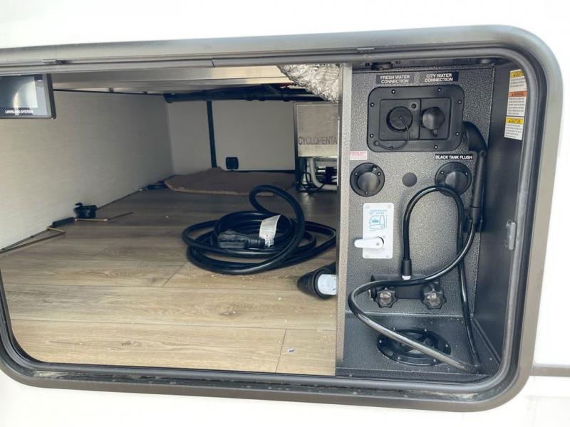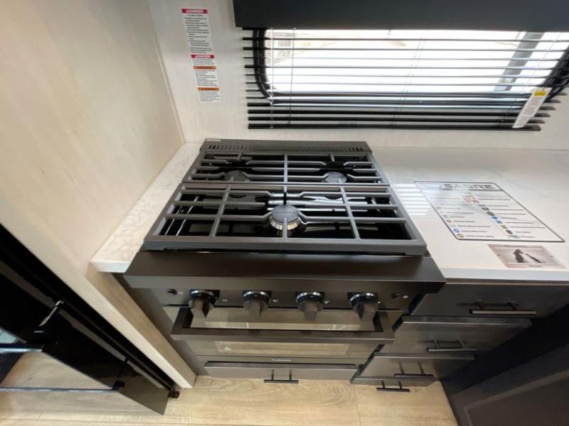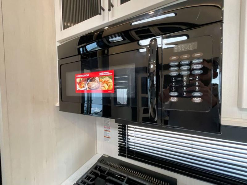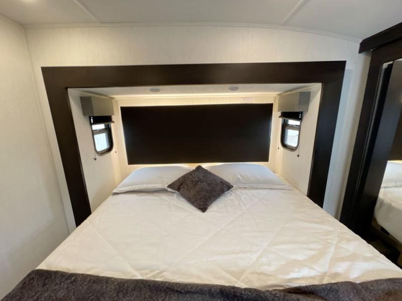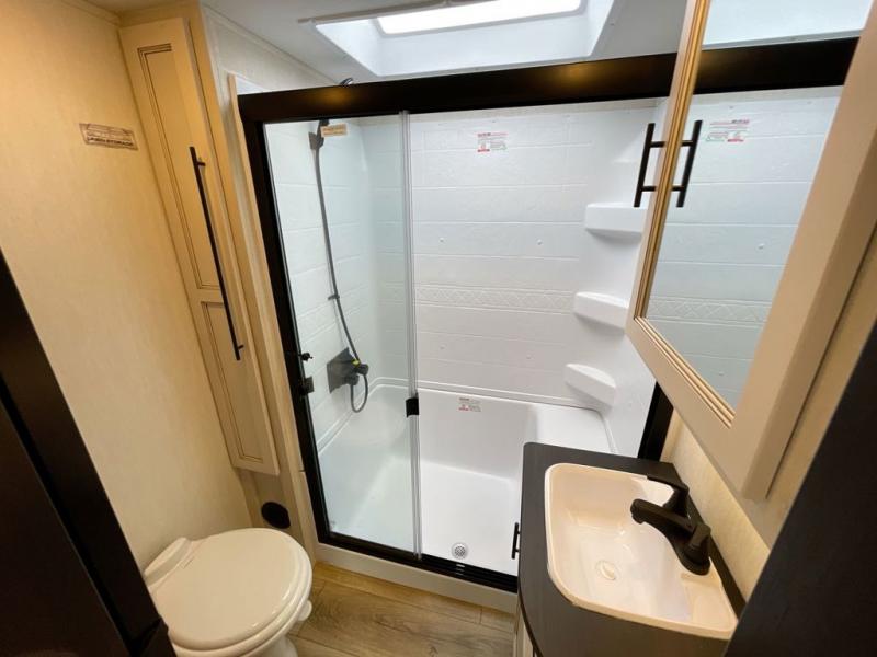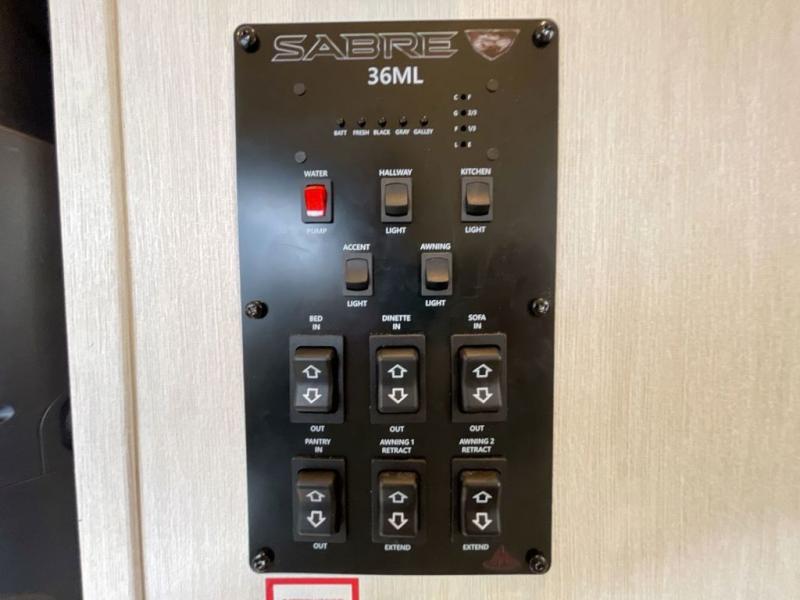 You will experience luxurious camping trips at an affordable price with any one of these Forest River Sabre fifth wheels! These models are durable and ready to travel anytime of the year thanks to features like the high-gloss gel-coat front cap with LED lighting, the PVC roof membrane, and the forced air underbelly with enclosed gate valves. The electric auto-leveling system makes setting up easy and safe, and the adjustable power awning with LED lighting will create an inviting outdoor living space. Each model includes a universal docking station which includes a black tank flush and an outside shower, and detachable and adjustable stable steps for you to enter and exit the unit safely. Inside, you will love the design of the ambient accent lighting in the living area, the real wood lumbercore cabinetry, and the linoleum flooring!