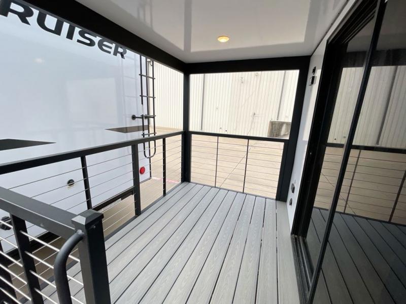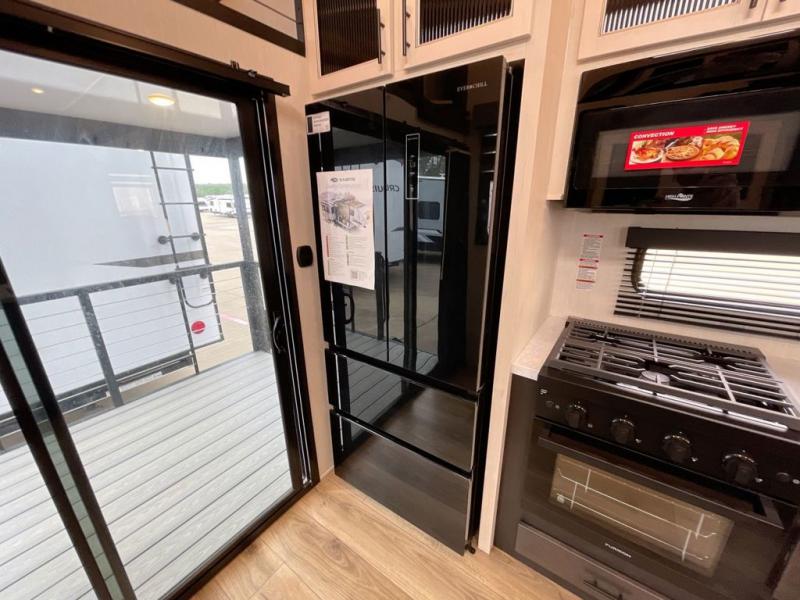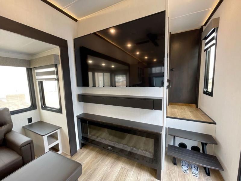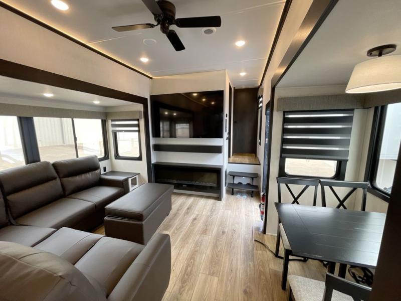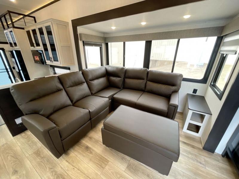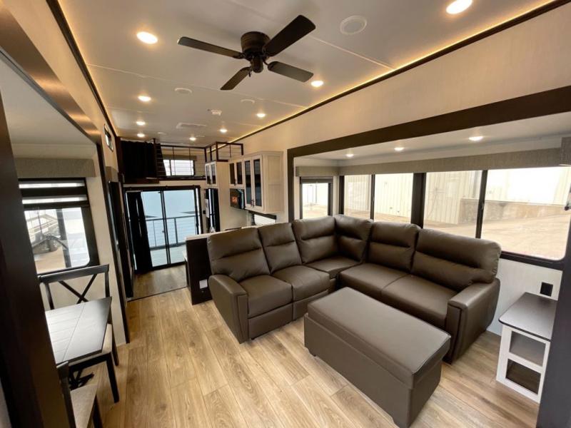 Whether you're weekend warriors or going full-time, this fifth wheel is sure to bring many happy days! The rear deck provides a place to relax in the evenings, and there is an overhead loft above here to use as storage or sleeping space. Once you head through the sliding patio doors, you can make dinner in the full kitchen before relaxing in the middle living room on the sectional sofa with an ottoman. There is also a table with chairs if game night is in order! The full bath includes a spacious shower with a seat for added comfort, and the camper king bed slide out in the bedroom will give you plenty of space to stretch out at night. You'll also appreciate the dresser and wardrobe to keep your space tidy, plus there is washer and dryer prep if you want to add those appliances!