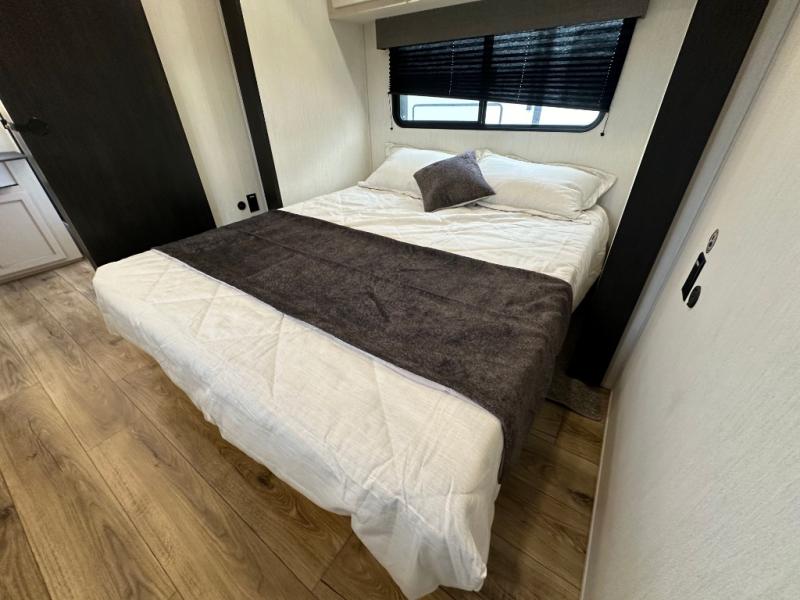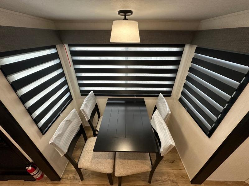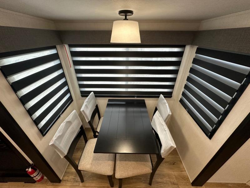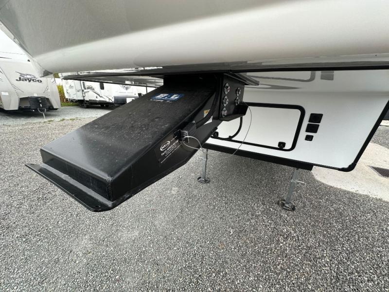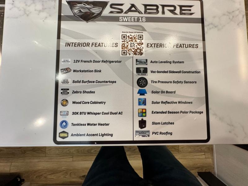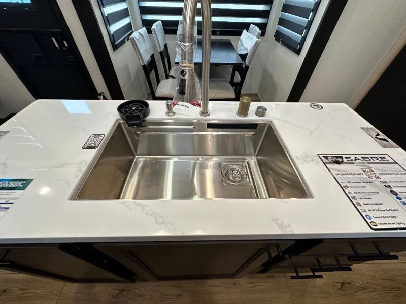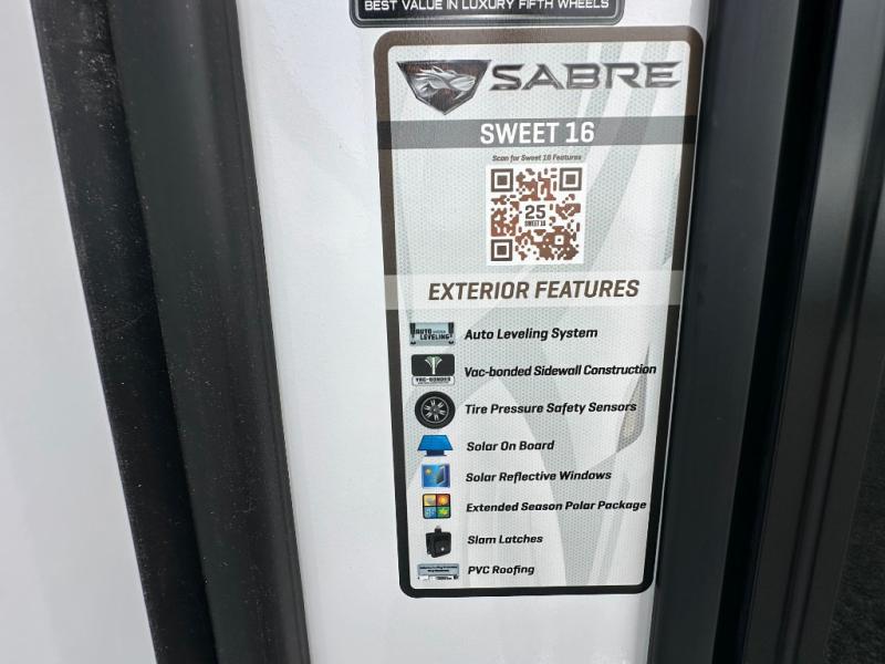 You will experience luxurious camping trips at an affordable price with any one of these Forest River Sabre fifth wheels! These models are durable and ready to travel anytime of the year thanks to features like the high-gloss gel-coat front cap with LED lighting, the PVC roof membrane, and the forced air underbelly with enclosed gate valves. The electric auto-leveling system makes setting up easy and safe, and the adjustable power awning with LED lighting will create an inviting outdoor living space. Each model includes a universal docking station which includes a black tank flush and an outside shower, and detachable and adjustable stable steps for you to enter and exit the unit safely. Inside, you will love the design of the ambient accent lighting above the crown molding in the living area, the real wood lumbercore cabinetry, and the vintage gaslight decorative lighting!