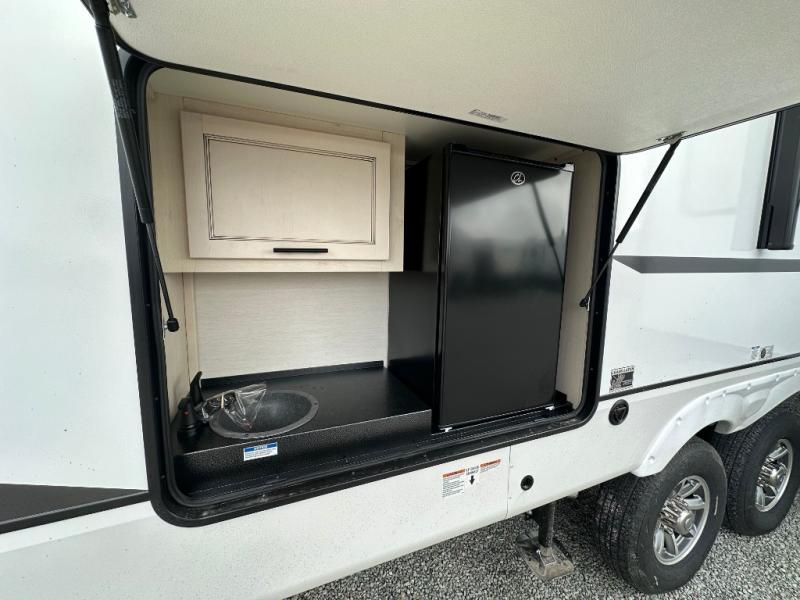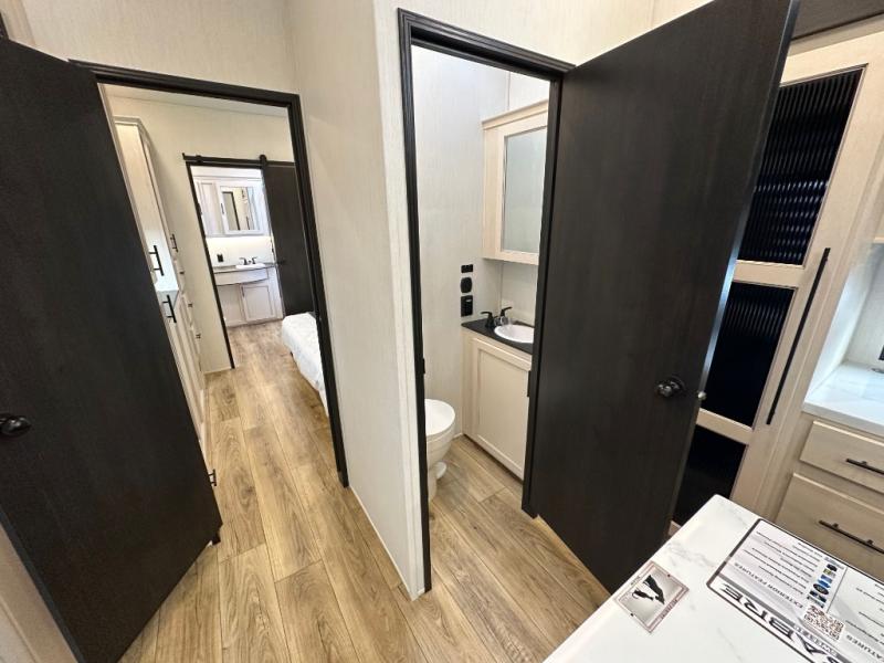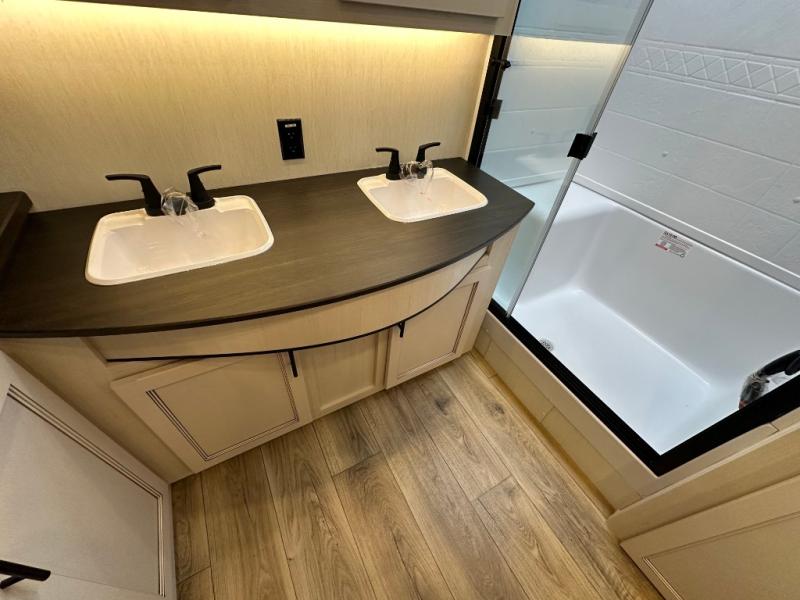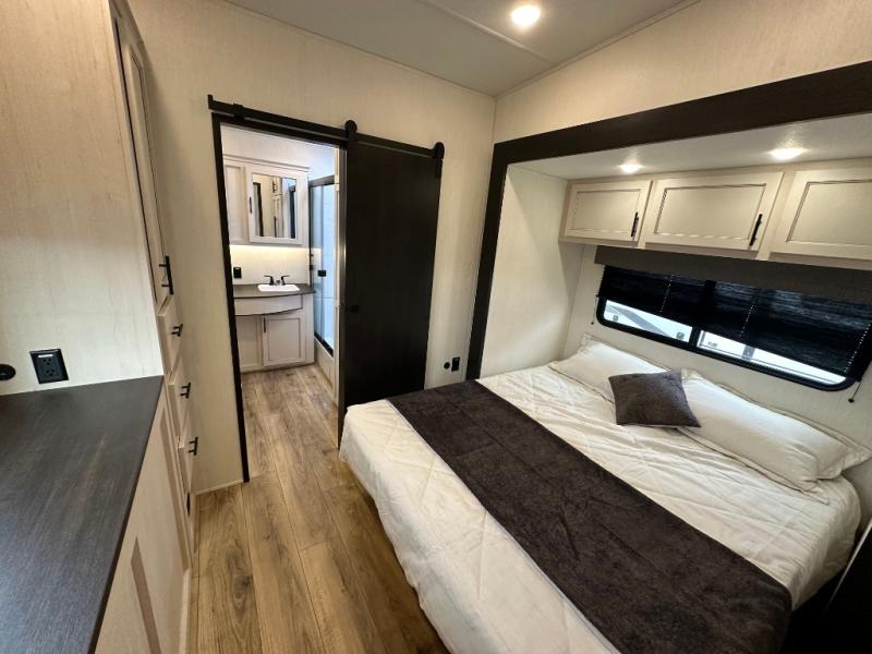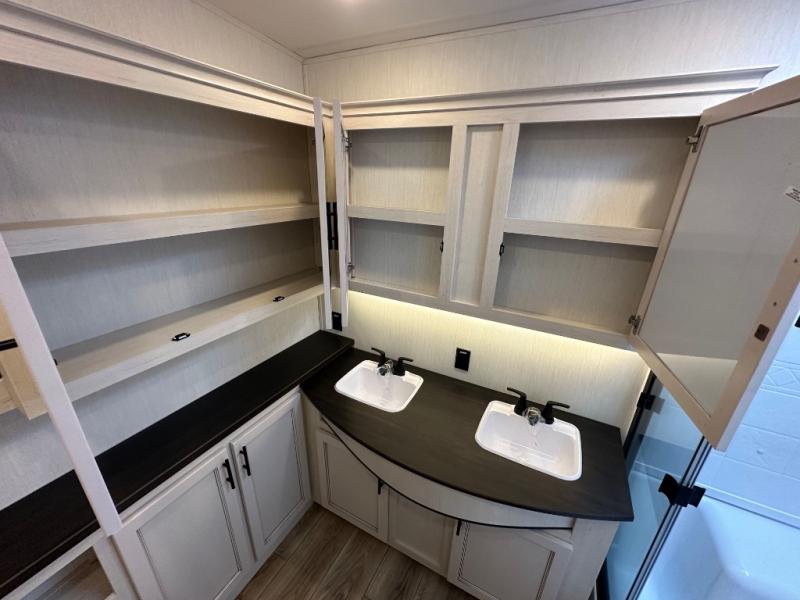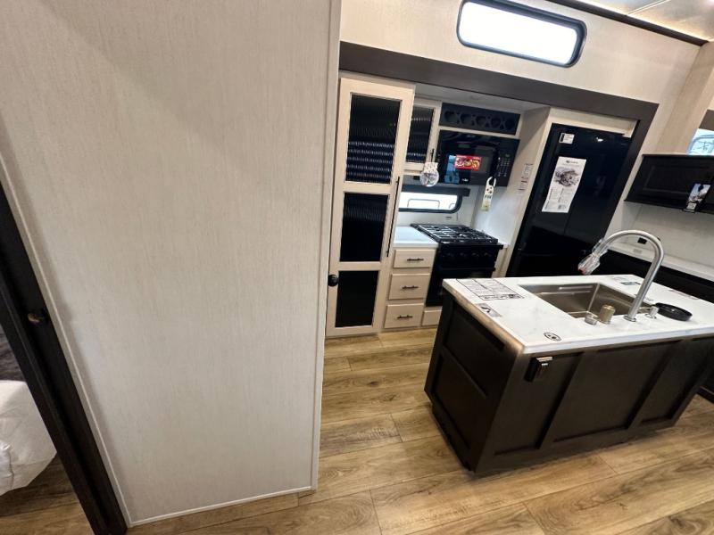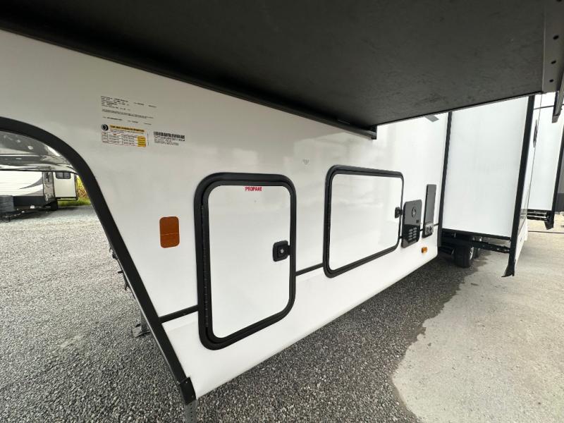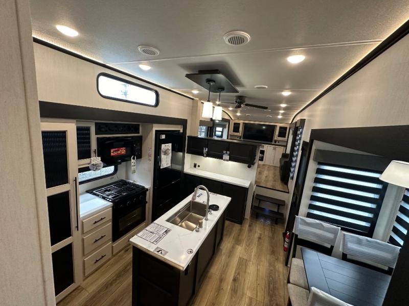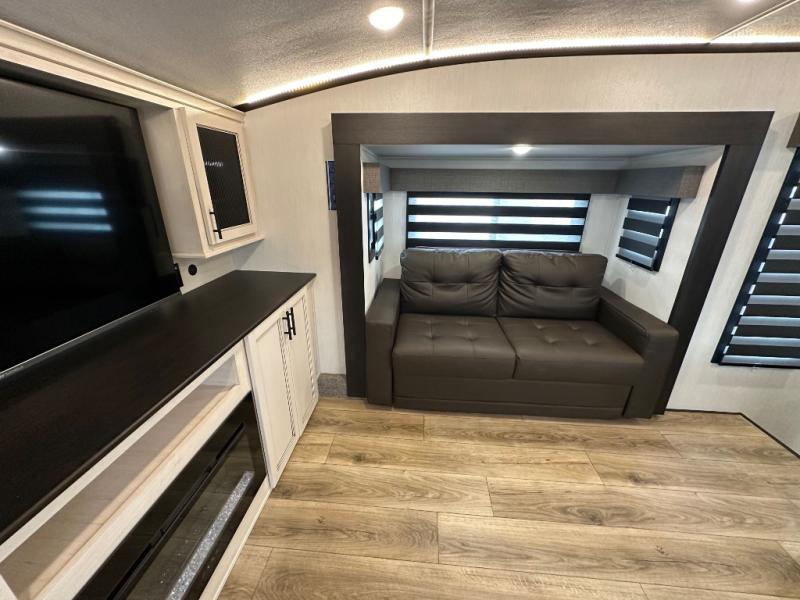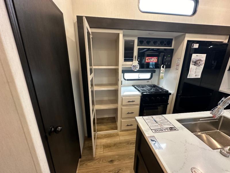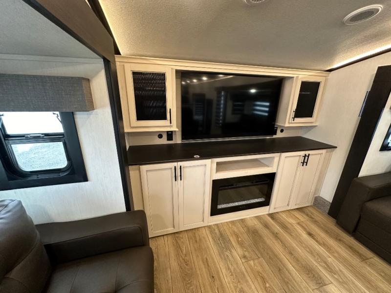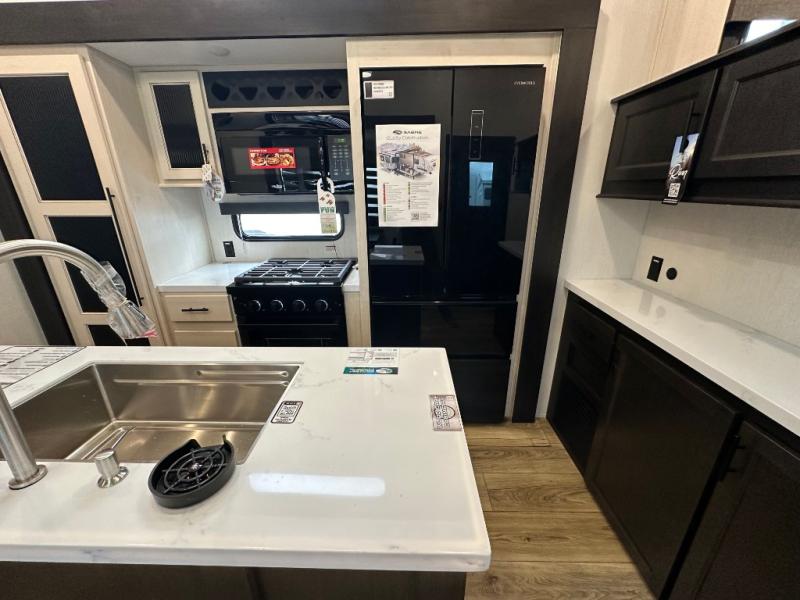 This Sabre fifth wheel with a full and half bath is sure to be a crowd pleaser! The front living area is the perfect place for everyone to visit each other comfortably on the two tri-fold sofas that can be transformed into extra sleeping spaces, or at the theater seating for complete relaxation. You will also find an entertainment center with a fireplace and a TV. This Sabre has a kitchen filled with convenient features, such as a 12V refrigerator with French doors, a kitchen island, and a lighted pantry with motion sensors. The rear master suite has access to its very own full bathroom with a double-sink vanity for two to get ready at once, and a wardrobe with washer and dryer prep for convenience!