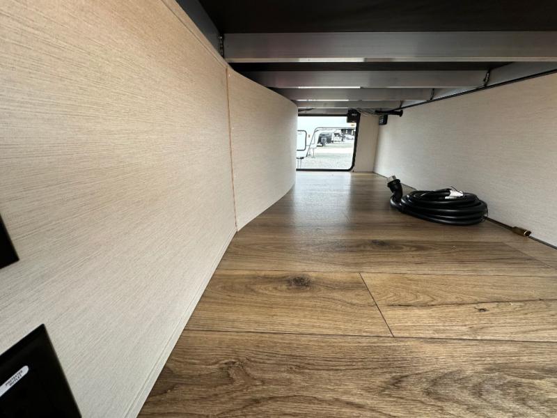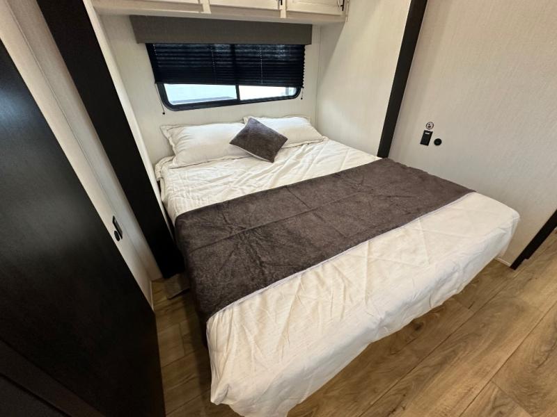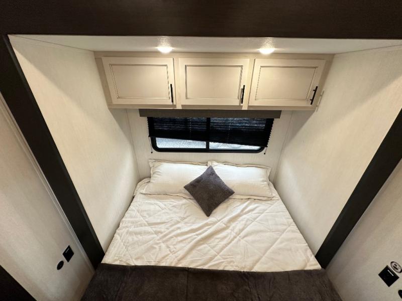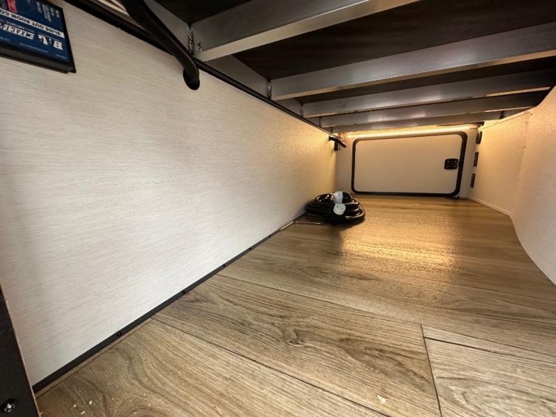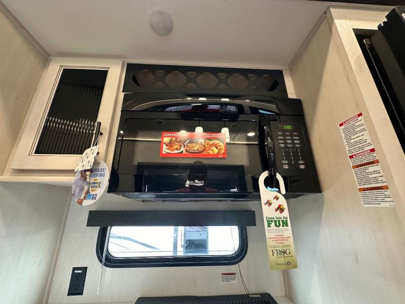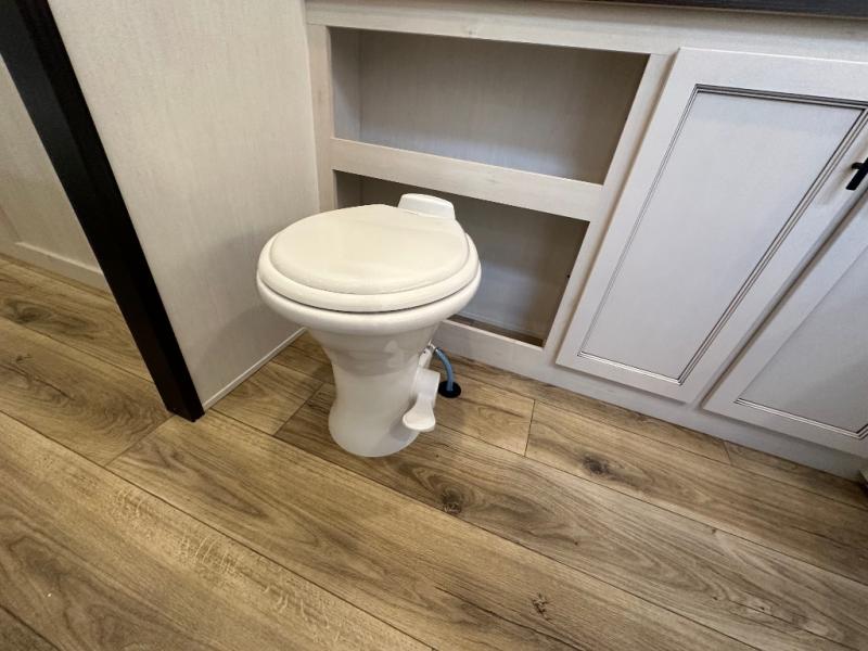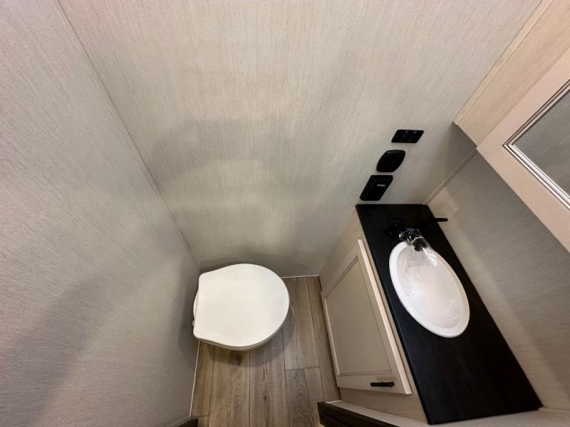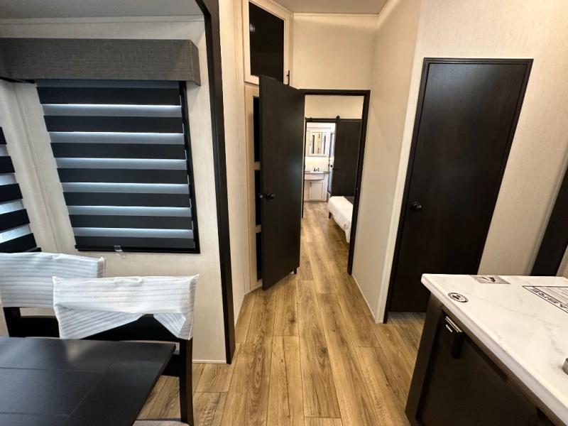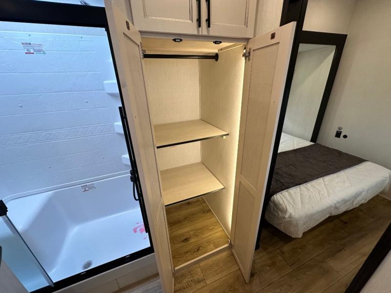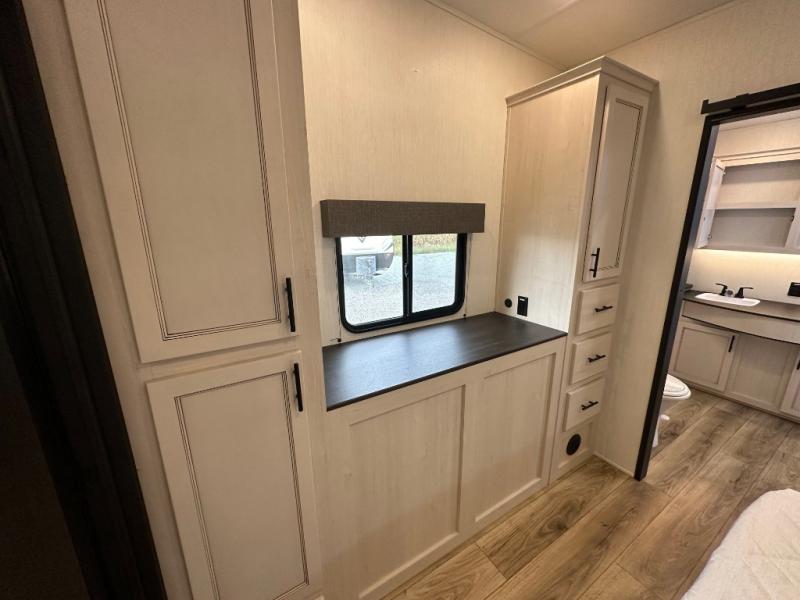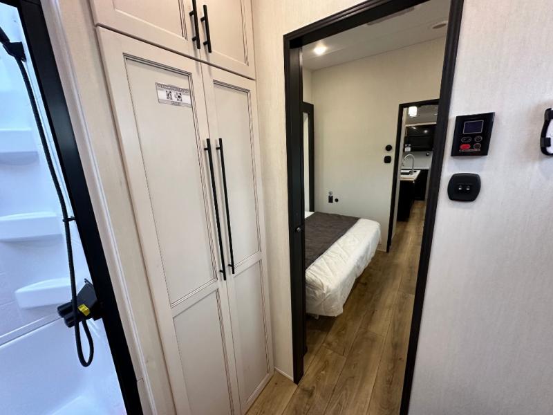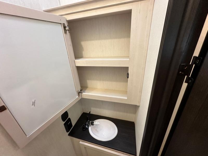 This Sabre fifth wheel with a full and half bath is sure to be a crowd pleaser! The front living area is the perfect place for everyone to visit each other comfortably on the two tri-fold sofas that can be transformed into extra sleeping spaces, or at the theater seating for complete relaxation. You will also find an entertainment center with a fireplace and a TV. This Sabre has a kitchen filled with convenient features, such as a 12V refrigerator with French doors, a kitchen island, and a lighted pantry with motion sensors. The rear master suite has access to its very own full bathroom with a double-sink vanity for two to get ready at once, and a wardrobe with washer and dryer prep for convenience!
