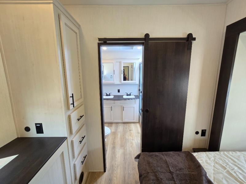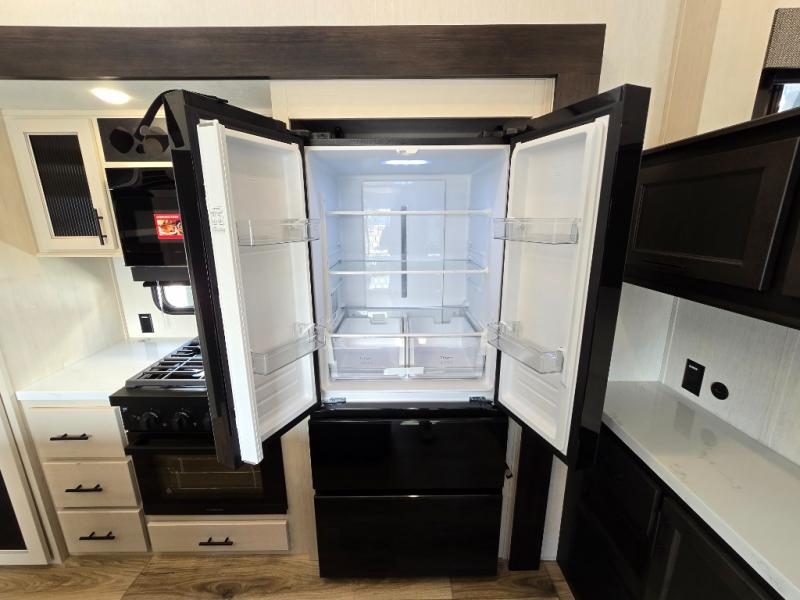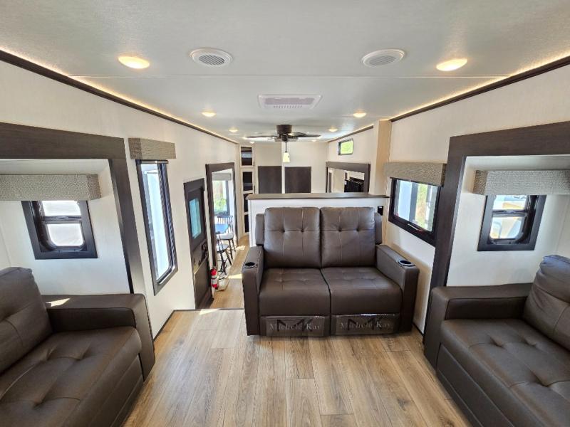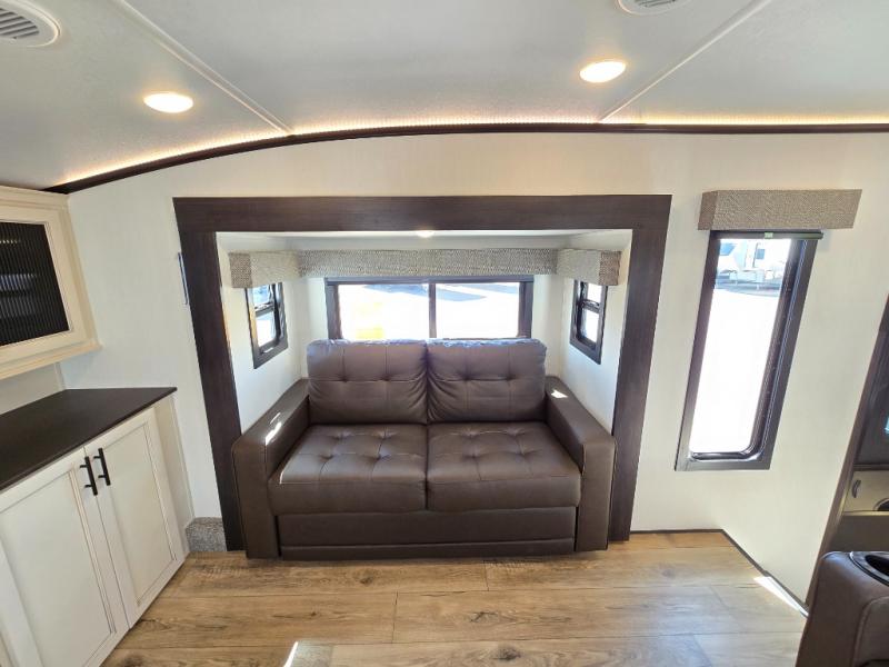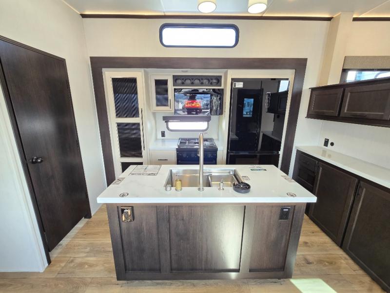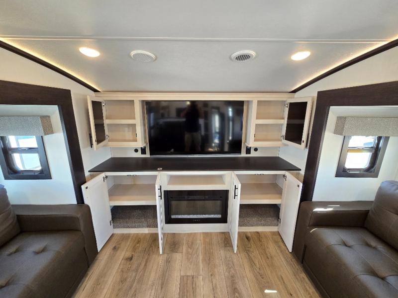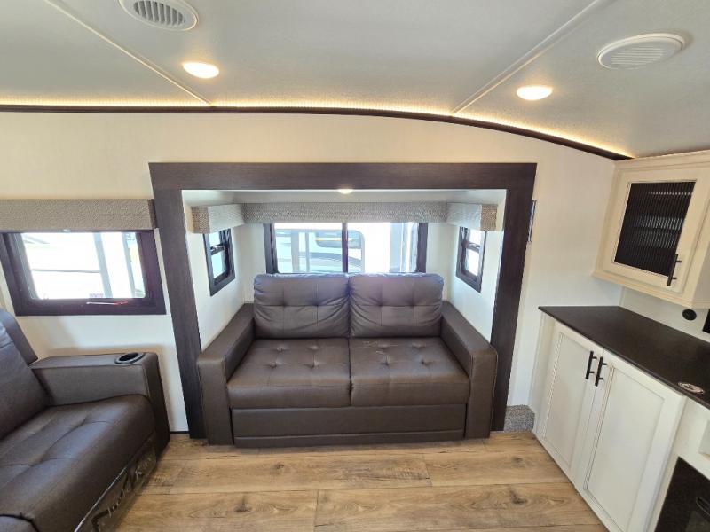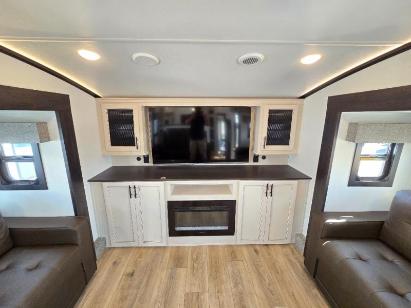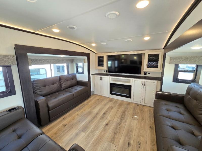 This Sabre fifth wheel with a full and half bath is sure to be a crowd pleaser! The front living area is the perfect place for everyone to visit each other comfortably on the two tri-fold sofas that can be transformed into extra sleeping spaces, or at the theater seating for complete relaxation. You will also find an entertainment center with a fireplace and a TV. This Sabre has a kitchen filled with convenient features, such as a 12V refrigerator with French doors, a kitchen island, and a lighted pantry with motion sensors. The rear master suite has access to its very own full bathroom with a double-sink vanity for two to get ready at once, and a wardrobe with washer and dryer prep for convenience!