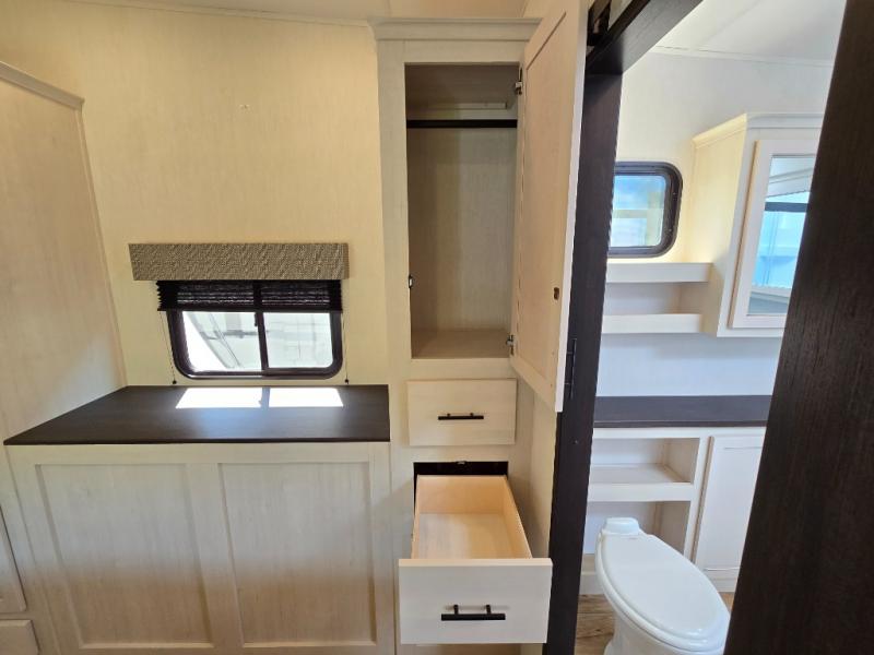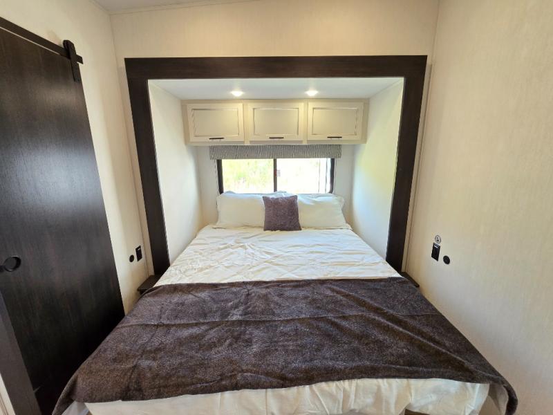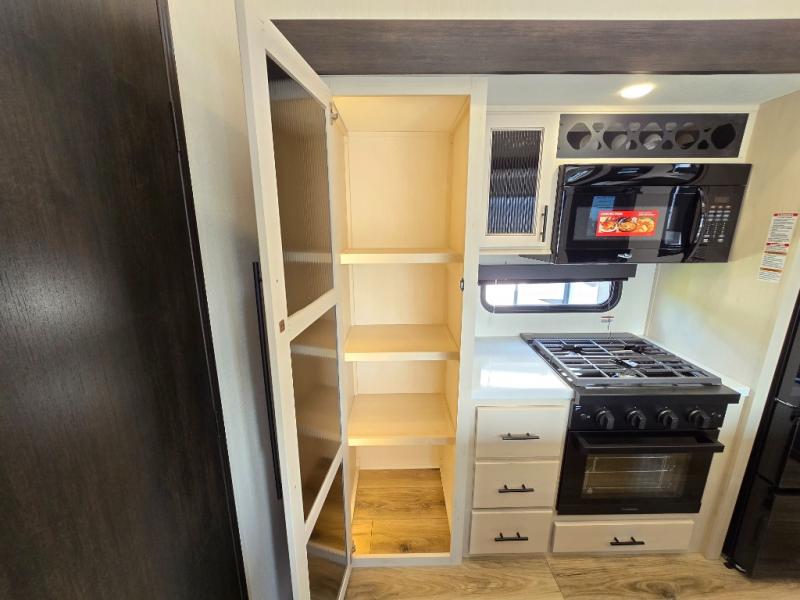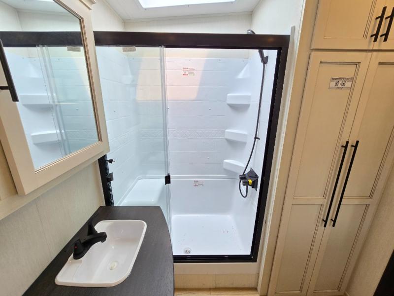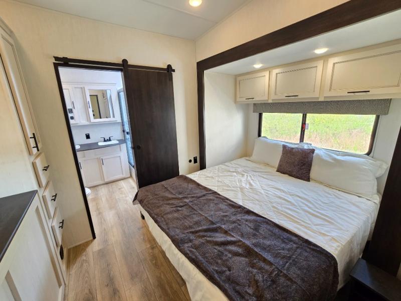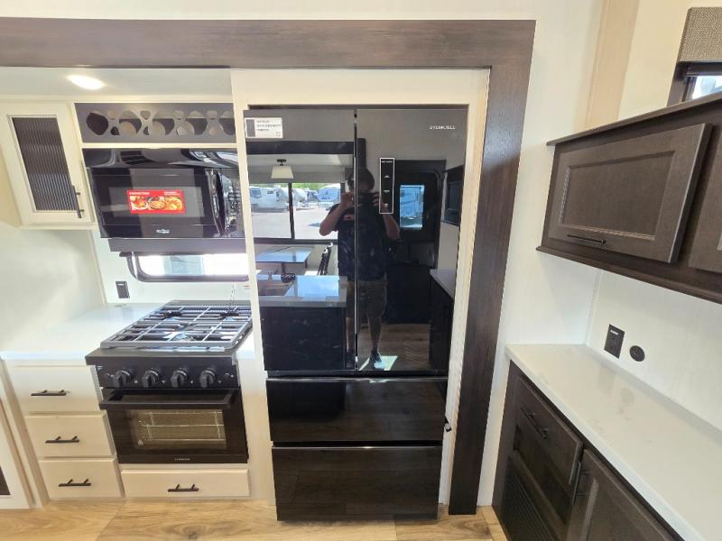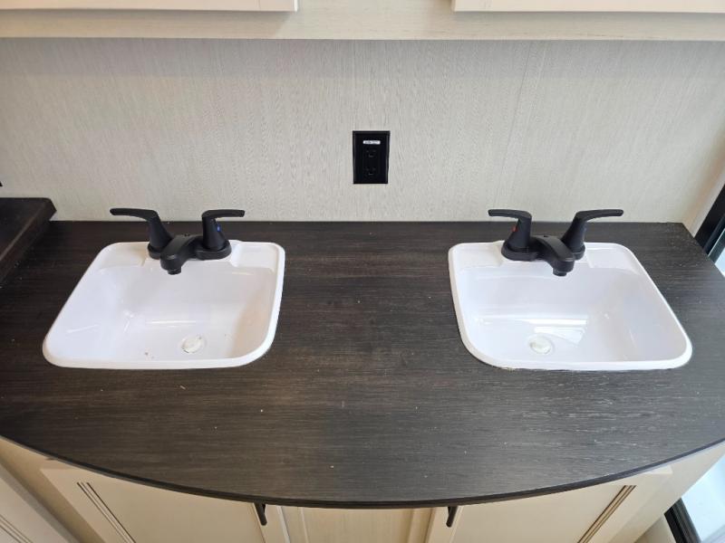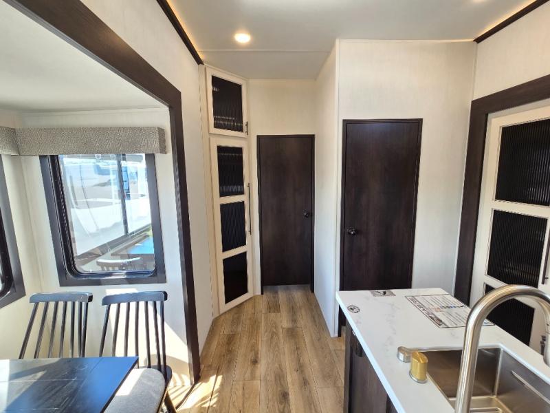 This Sabre fifth wheel with a full and half bath is sure to be a crowd pleaser! The front living area is the perfect place for everyone to visit each other comfortably on the two tri-fold sofas that can be transformed into extra sleeping spaces, or at the theater seating for complete relaxation. You will also find an entertainment center with a fireplace and a TV. This Sabre has a kitchen filled with convenient features, such as a 12V refrigerator with French doors, a kitchen island, and a lighted pantry with motion sensors. The rear master suite has access to its very own full bathroom with a double-sink vanity for two to get ready at once, and a wardrobe with washer and dryer prep for convenience!